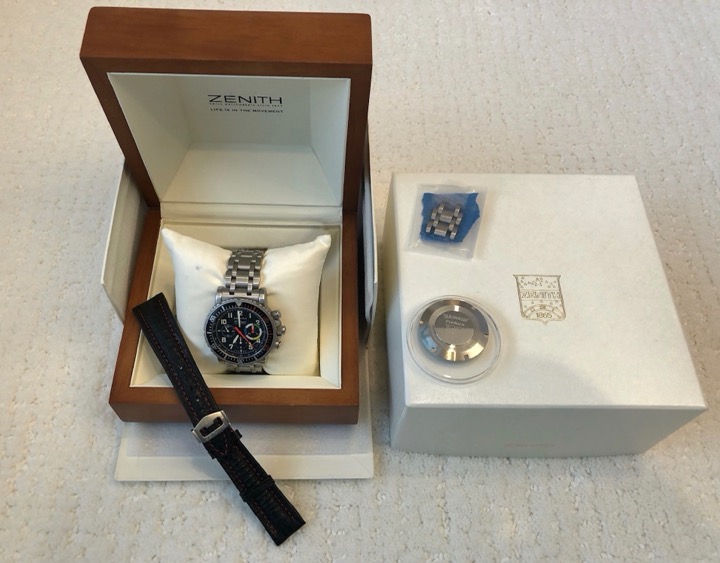 Strap and Bracelet: When sold new, this reference was fitted with a sharkskin strap and deployant clasp - the originals are included. Purchased separately, and currently installed on the watch, is a period-correct Zenith OEM bracelet. This version, also included, was fitted to the 02.0480.405 version of this watch - the only difference between the two references and therefore perfectly matched to the case.