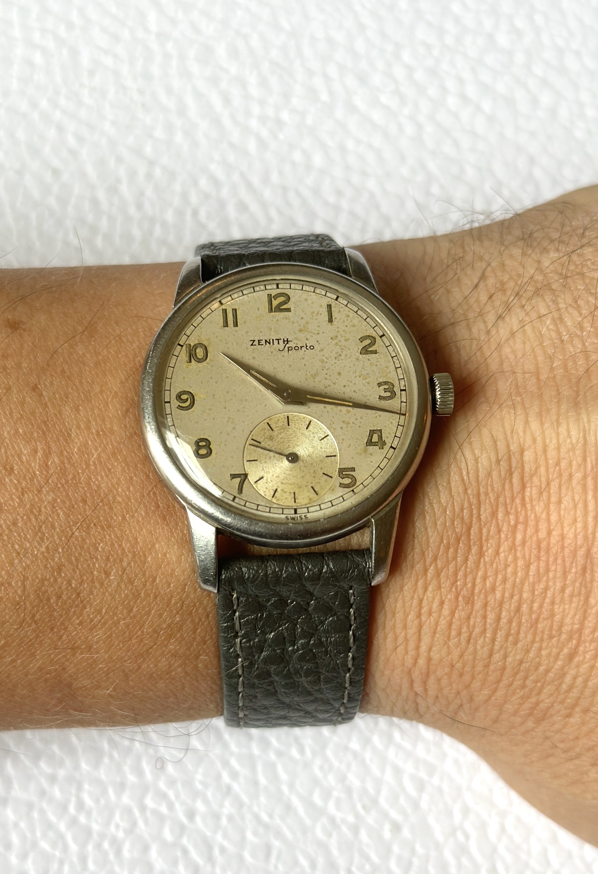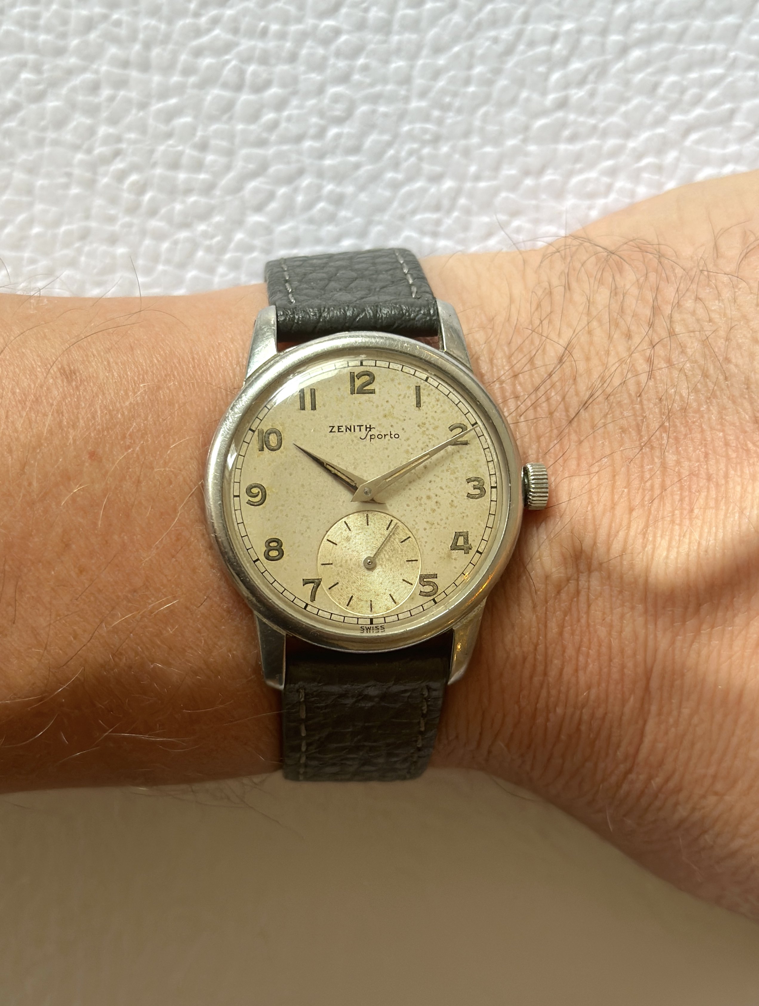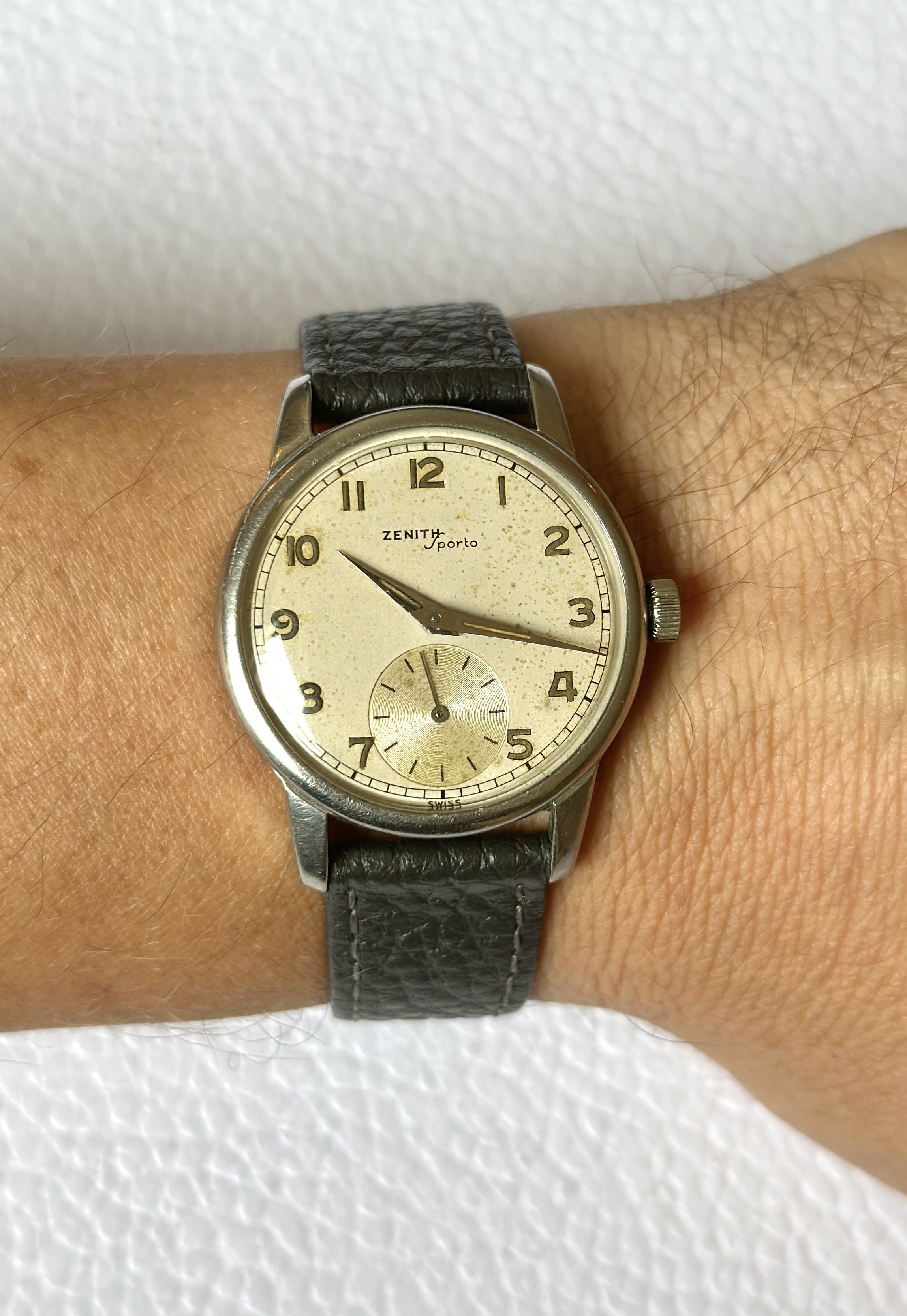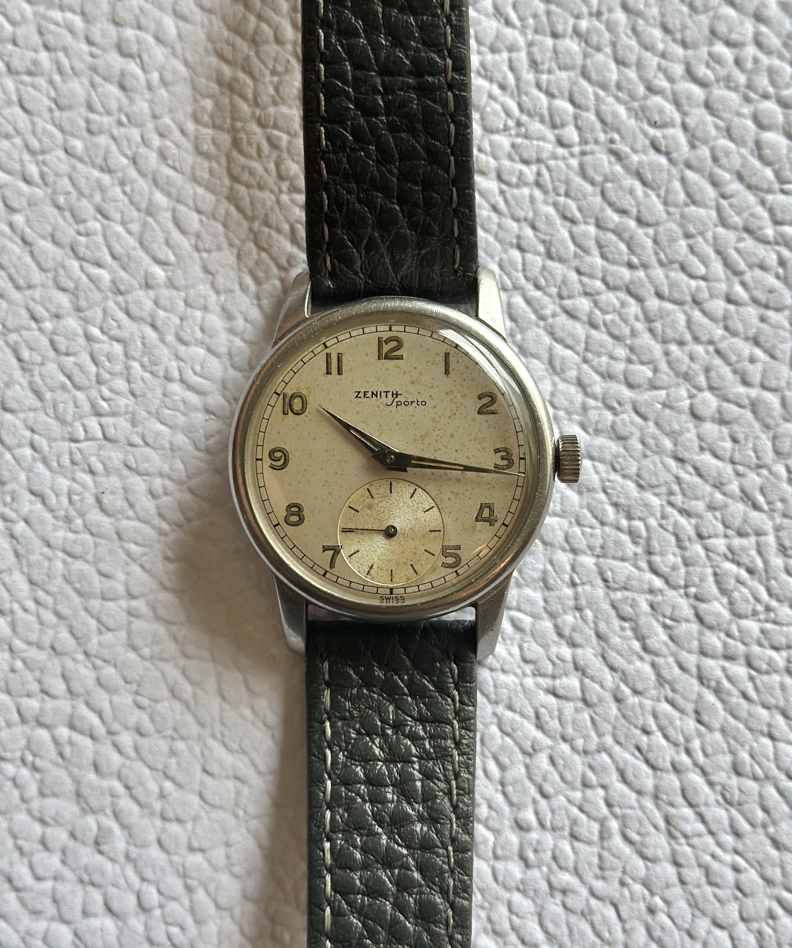 Offering this beautiful Zenith Sporto from the late 40's/early 50's, with a military style radium dial and sub second register. It appears to be in fully original condition, with the dial taking on a lovely patina.