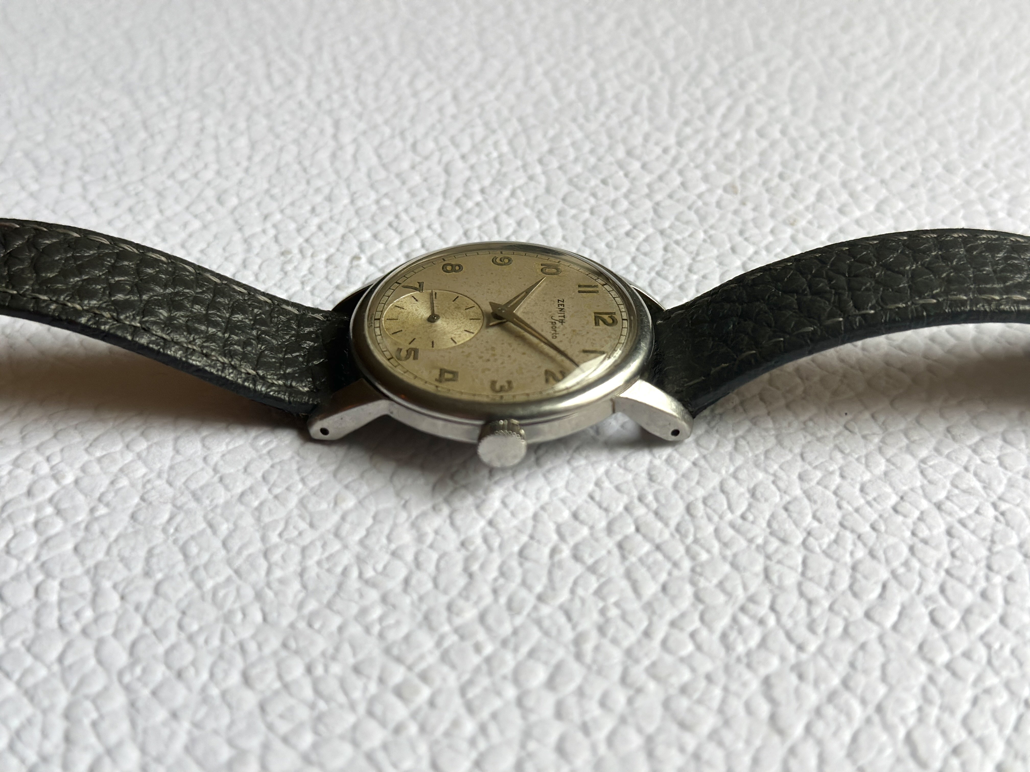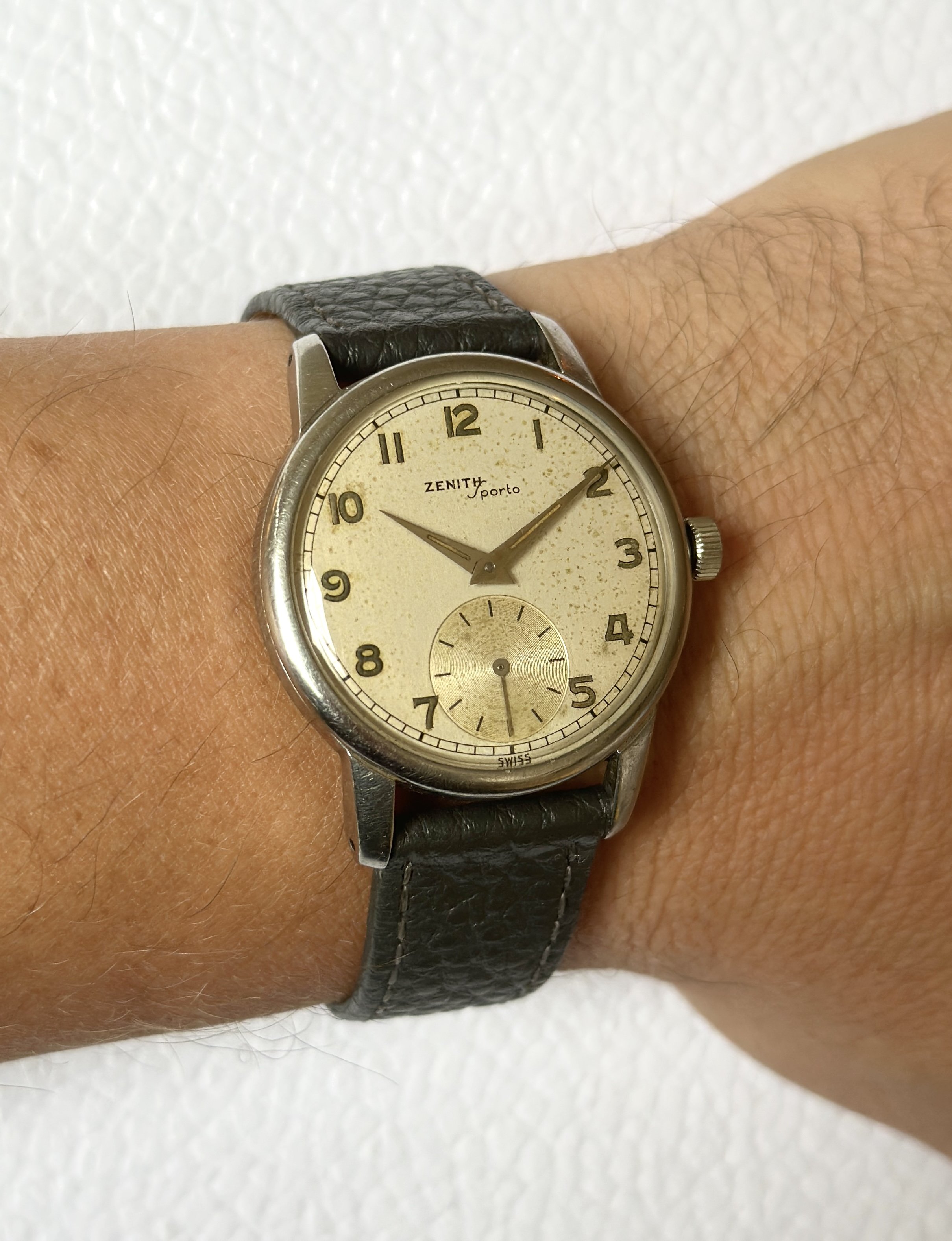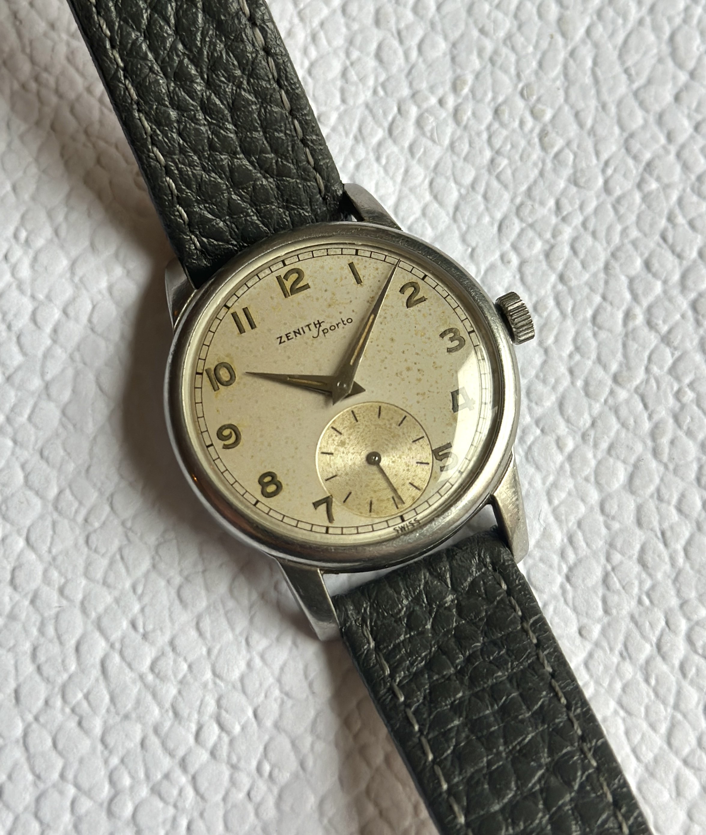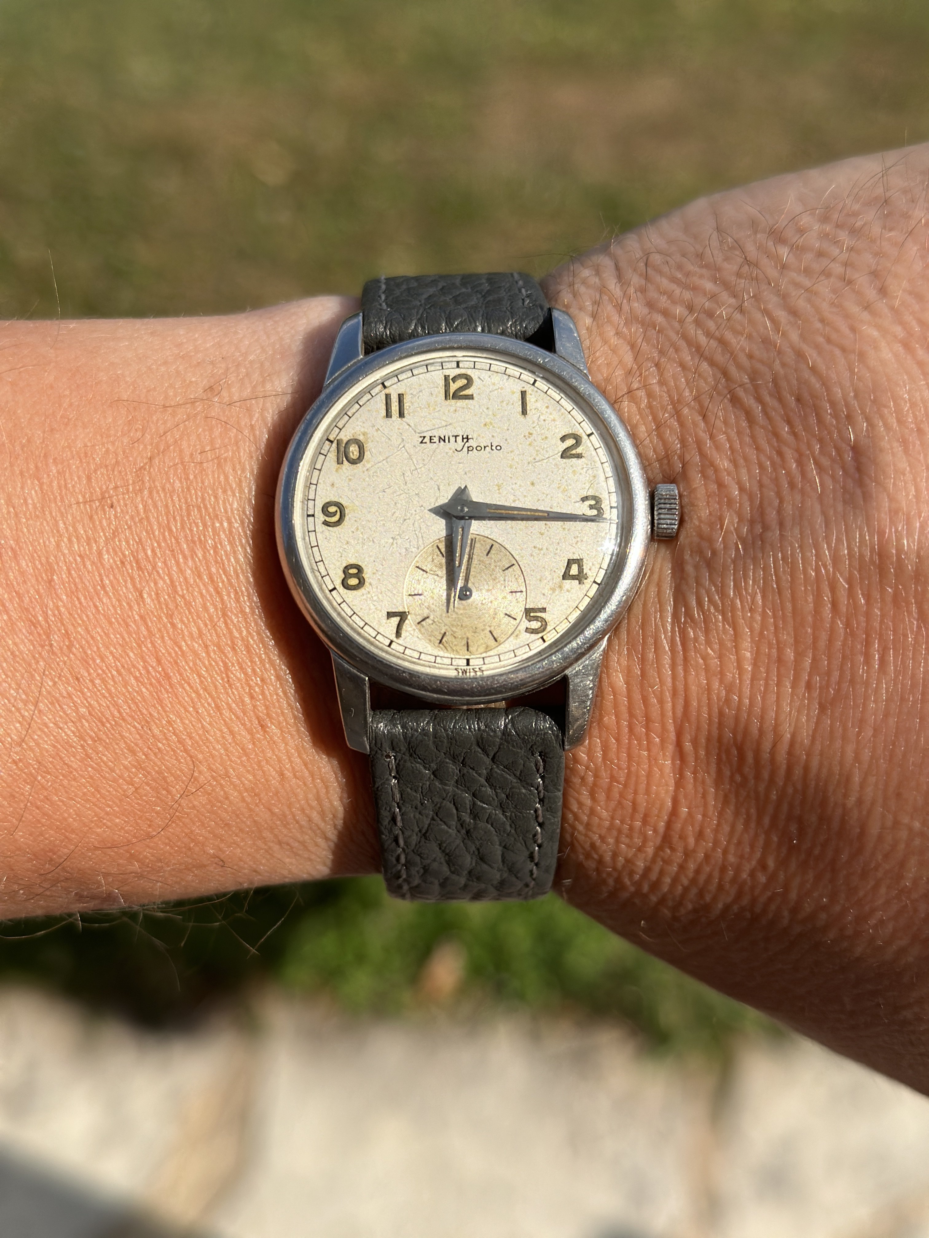 Offering this beautiful Zenith Sporto from the late 40's/early 50's, with a military style radium dial and sub second register. It appears to be in fully original condition, with the dial taking on a lovely patina.