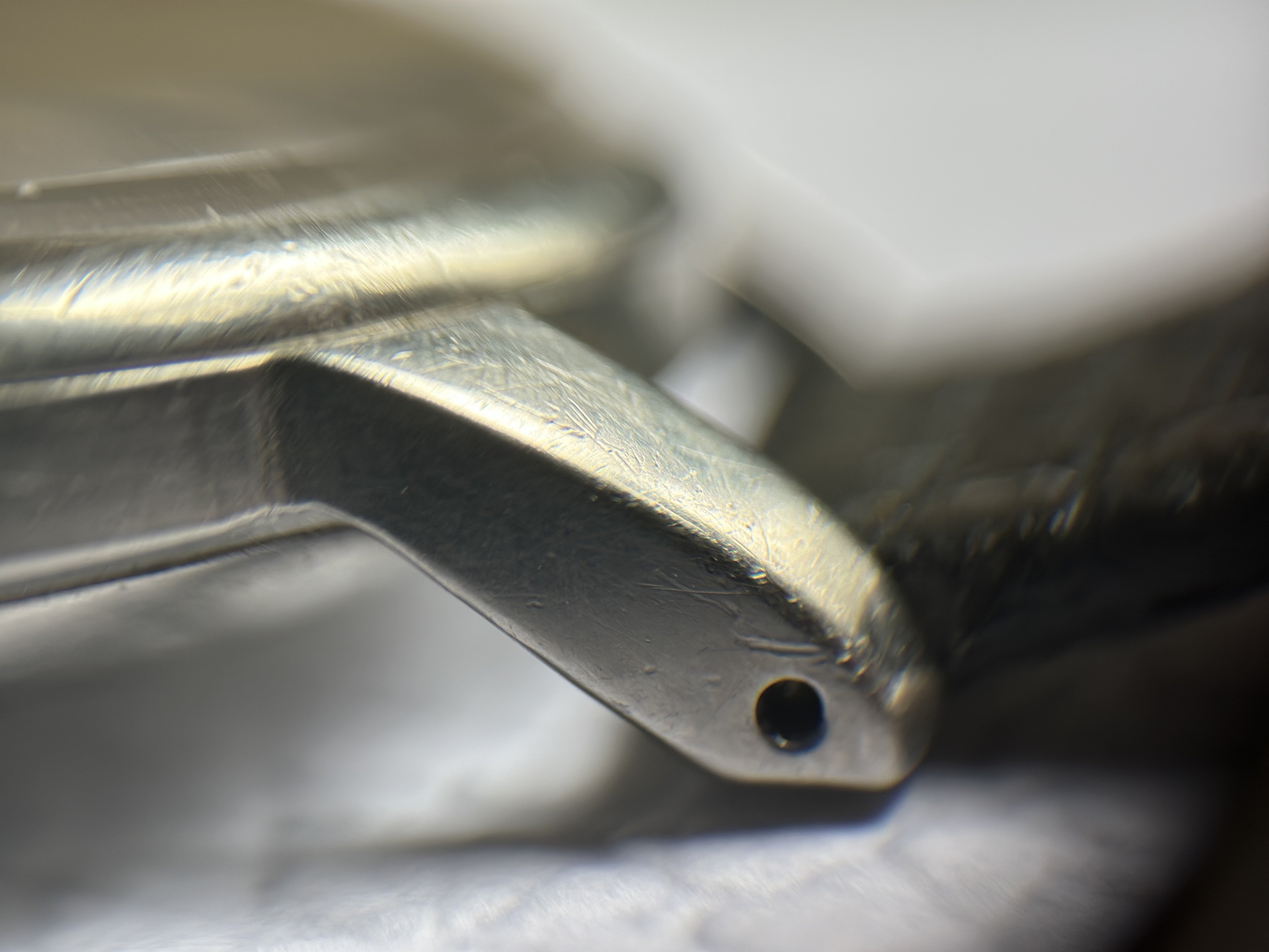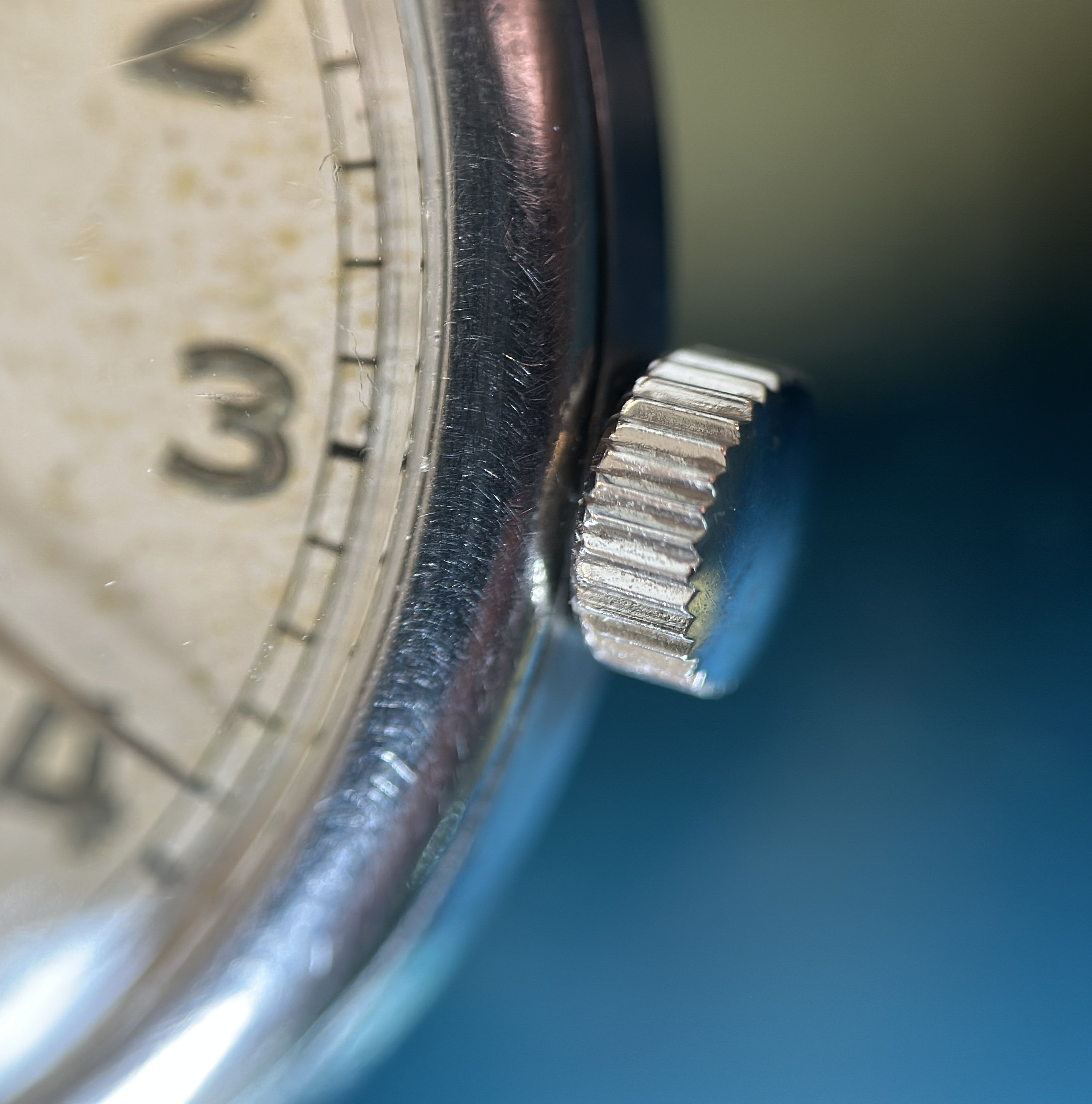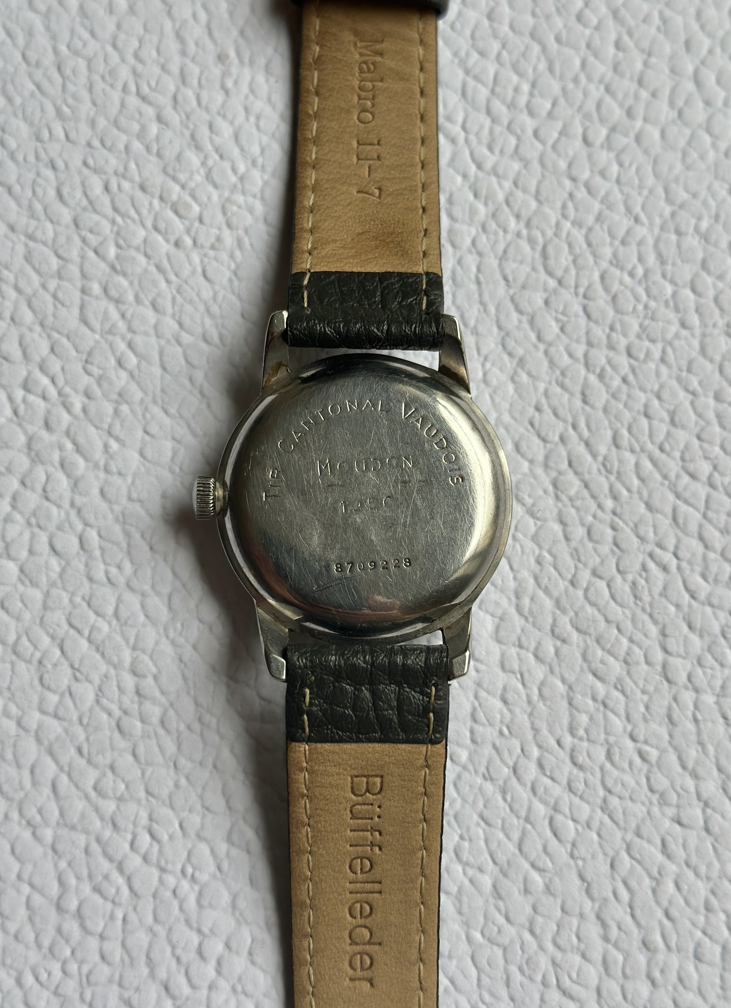 The stainless steel case measures 34mm excluding the crown and 18 mm between the lugs. It looks unpolished to my eye and is in very pleasant condition, with thick lugs showing some light surface marks, as seen in the macro photos below. The case back bears a lovely engraving that reads: "Tir Cantonal Vaudois Moudon 1950", which refers to a Swiss shooting club, in the canton of Vaud. I have not tried to open the case, but my research brought me to a similar watch with the exact same engraving, showing the movement inside, which appears to be a Cal 126-6 (experts might chime in otherwise).
