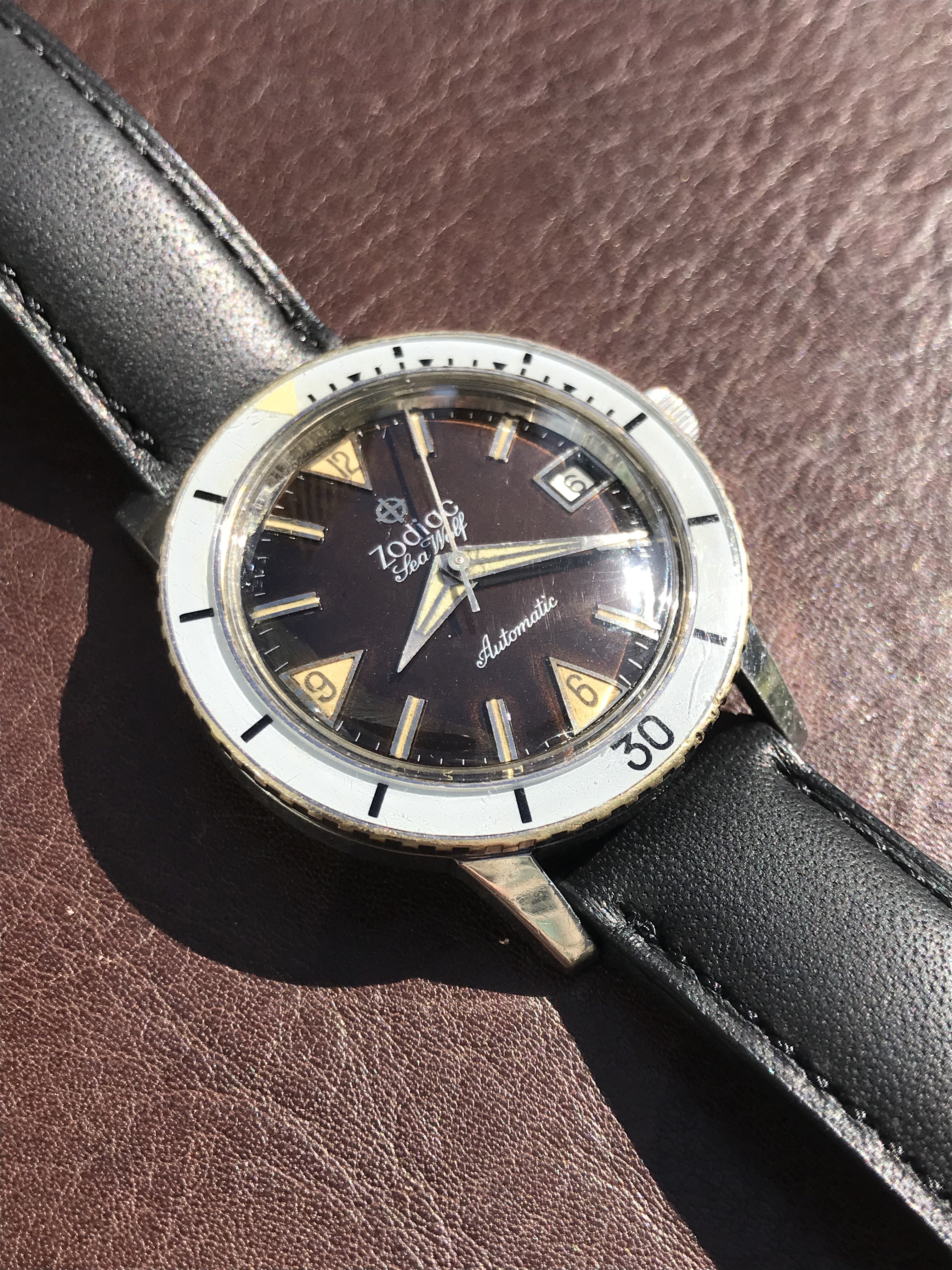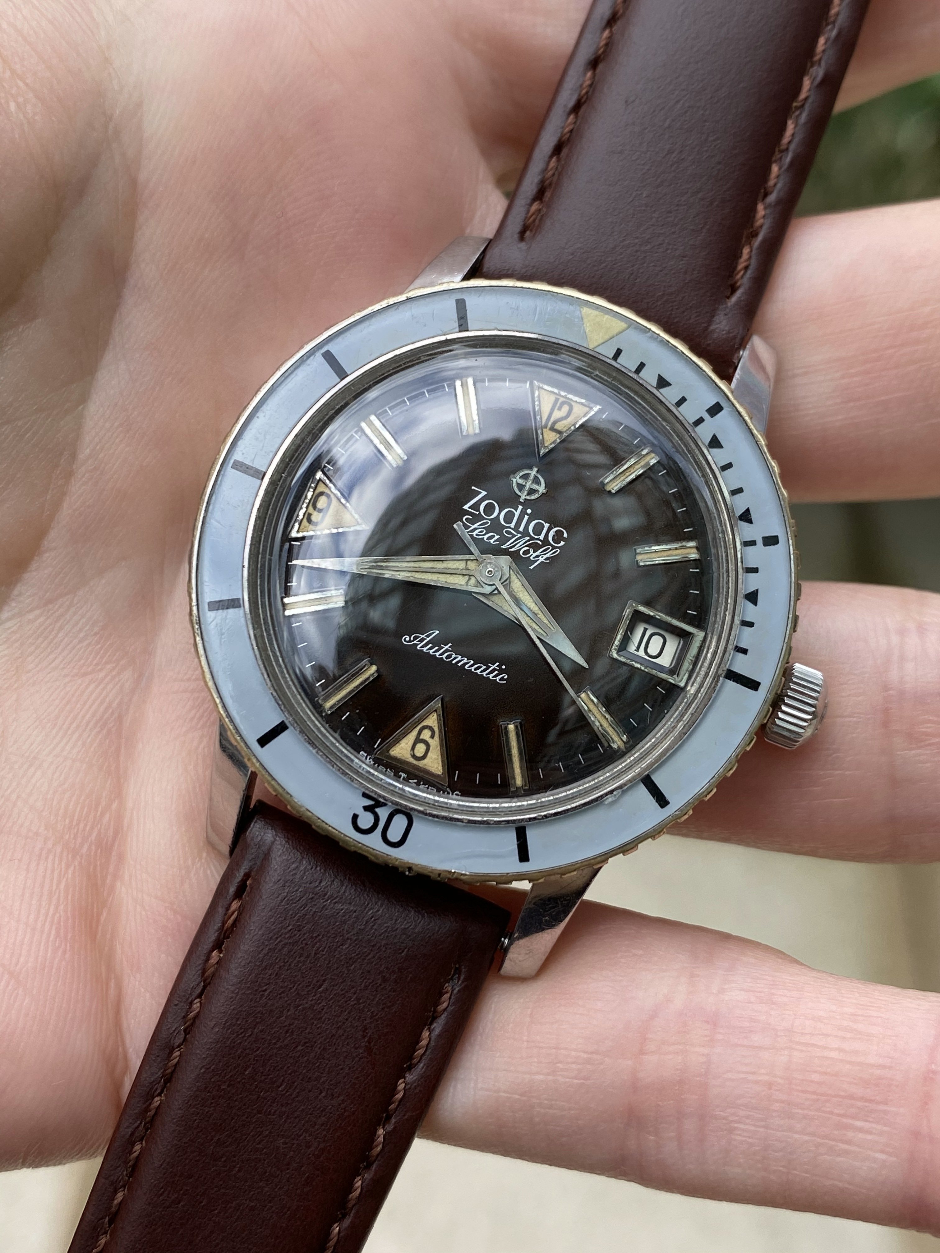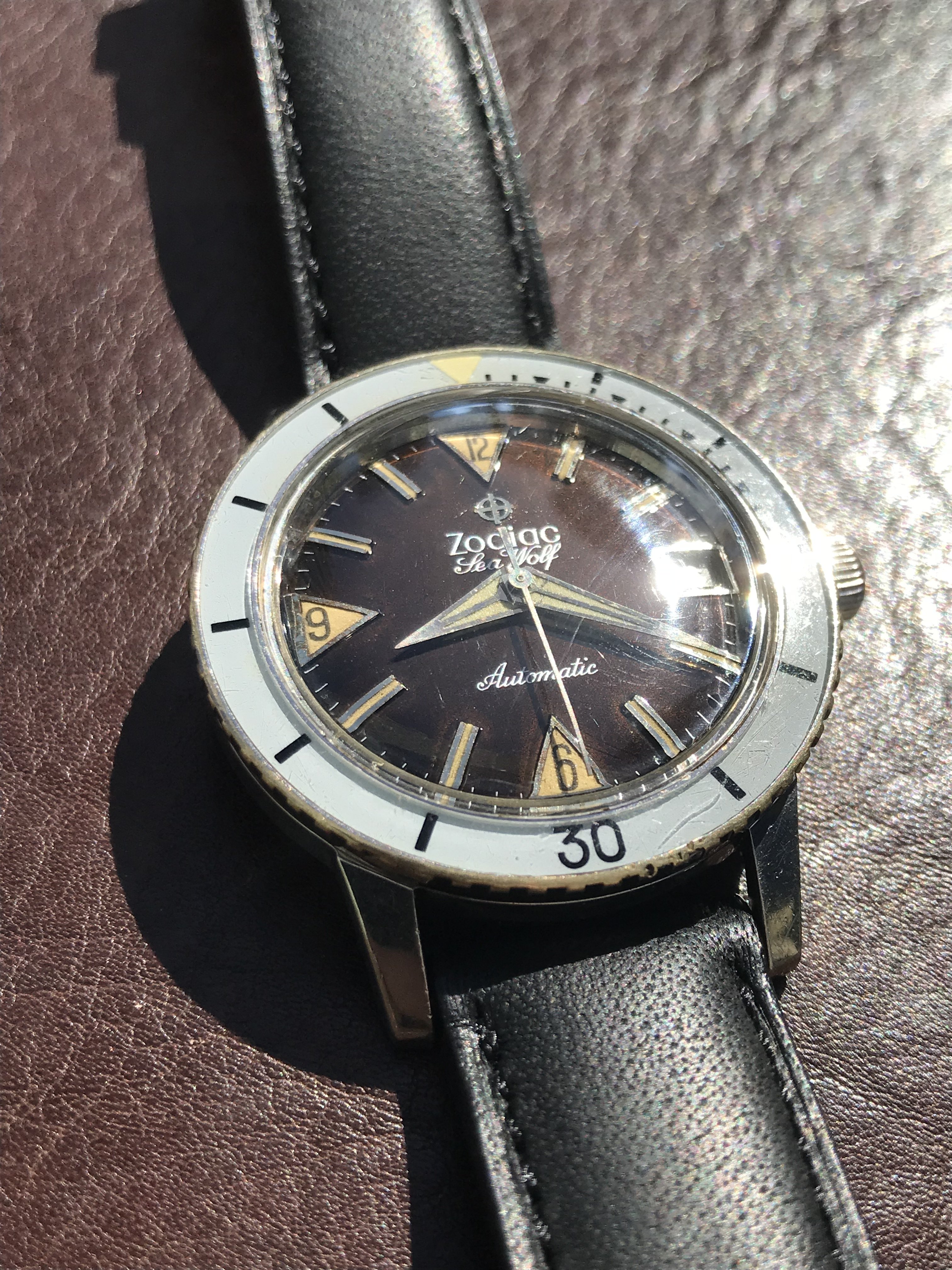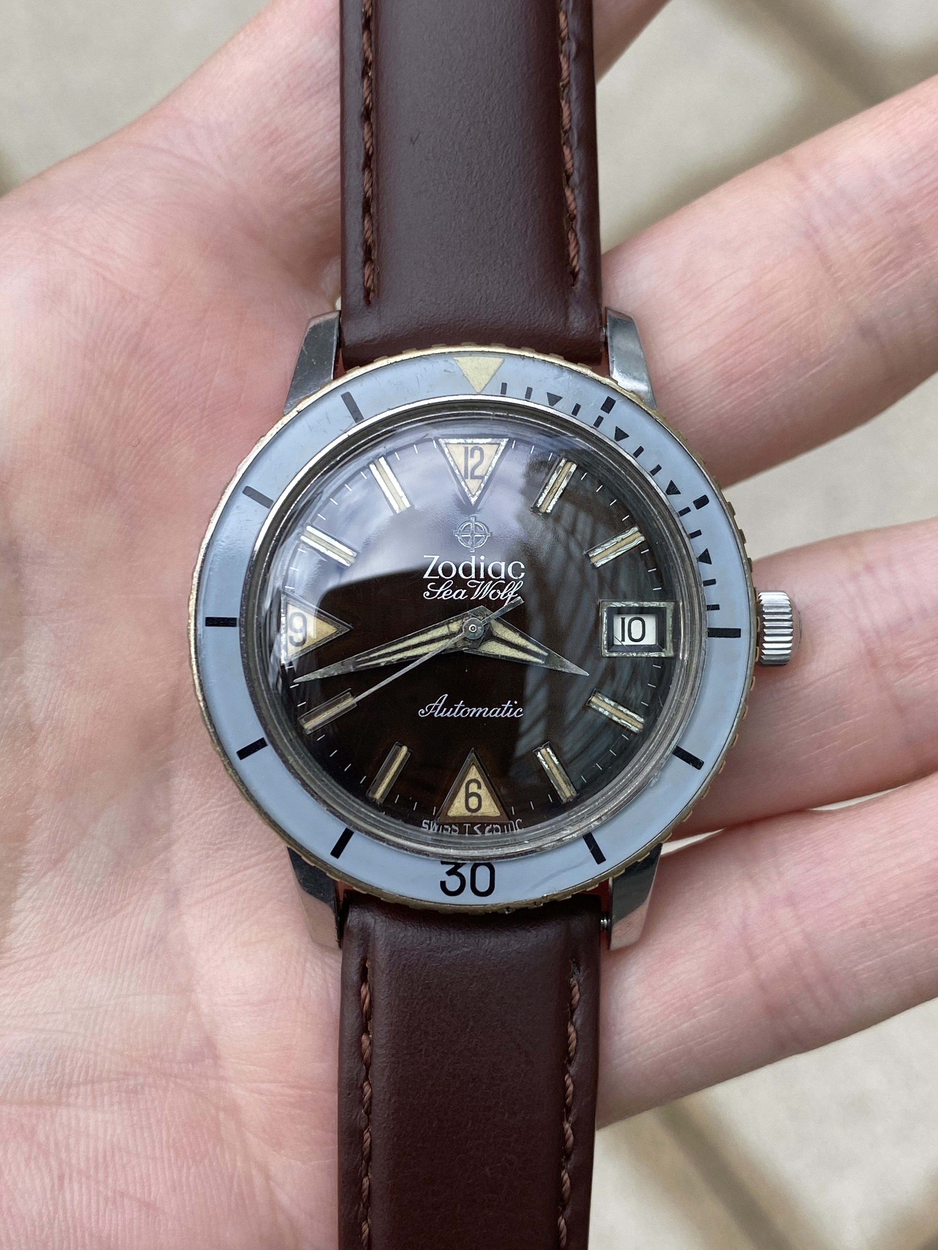 ·Next up for sale is a super nice 722-946B reference Zodiac Sea Wolf with an attractive tropical black dial and unique blue acrylic bezel. The original black dial has developed a subtle brown tropical patina and beautifully aged lume. The bezel and case are in very nice condition. The movement was serviced in April 2020 by Yuriy Vakulenko and is running very well. Sea Wolfs don't get much better than this in my opinion.