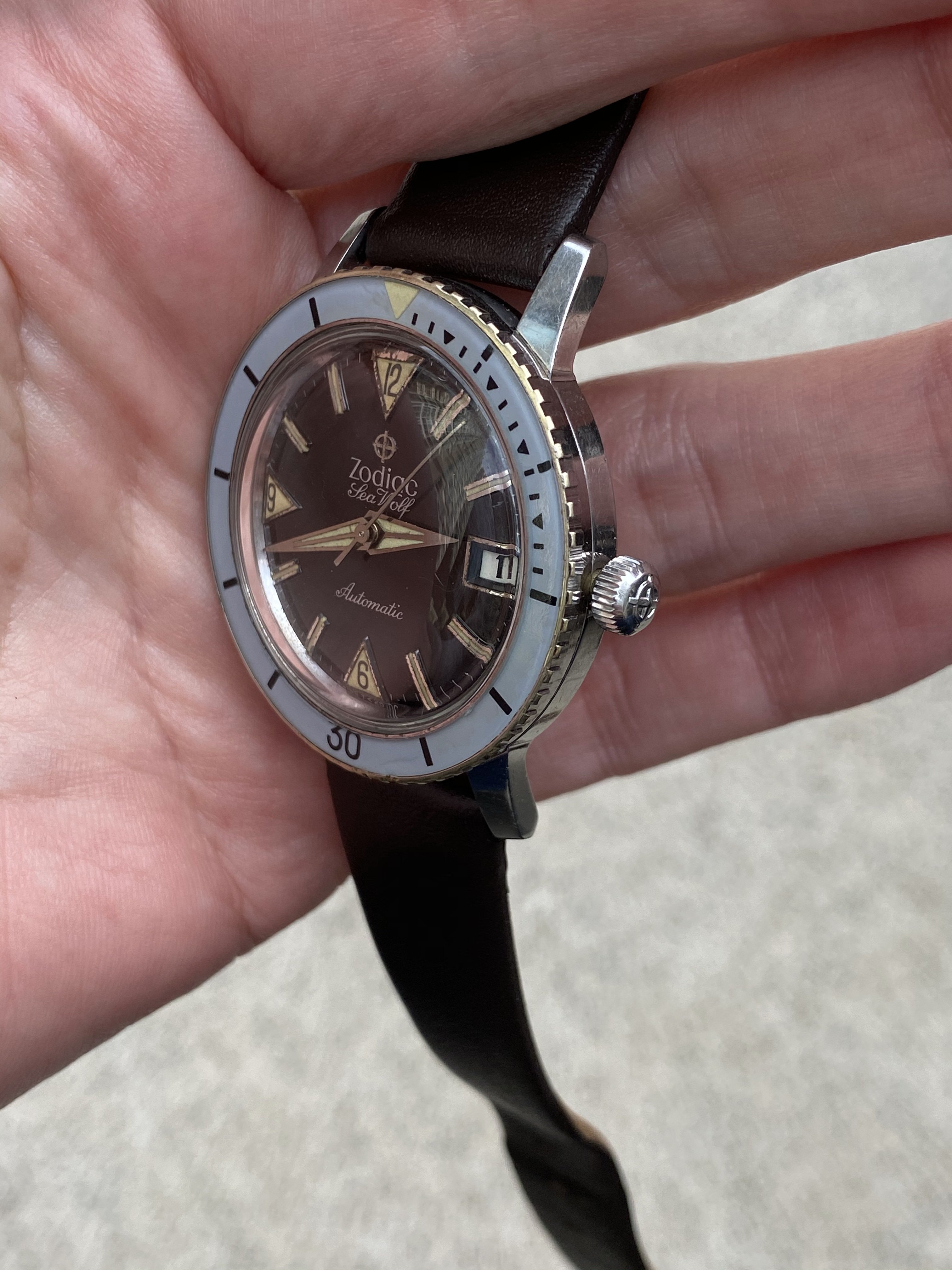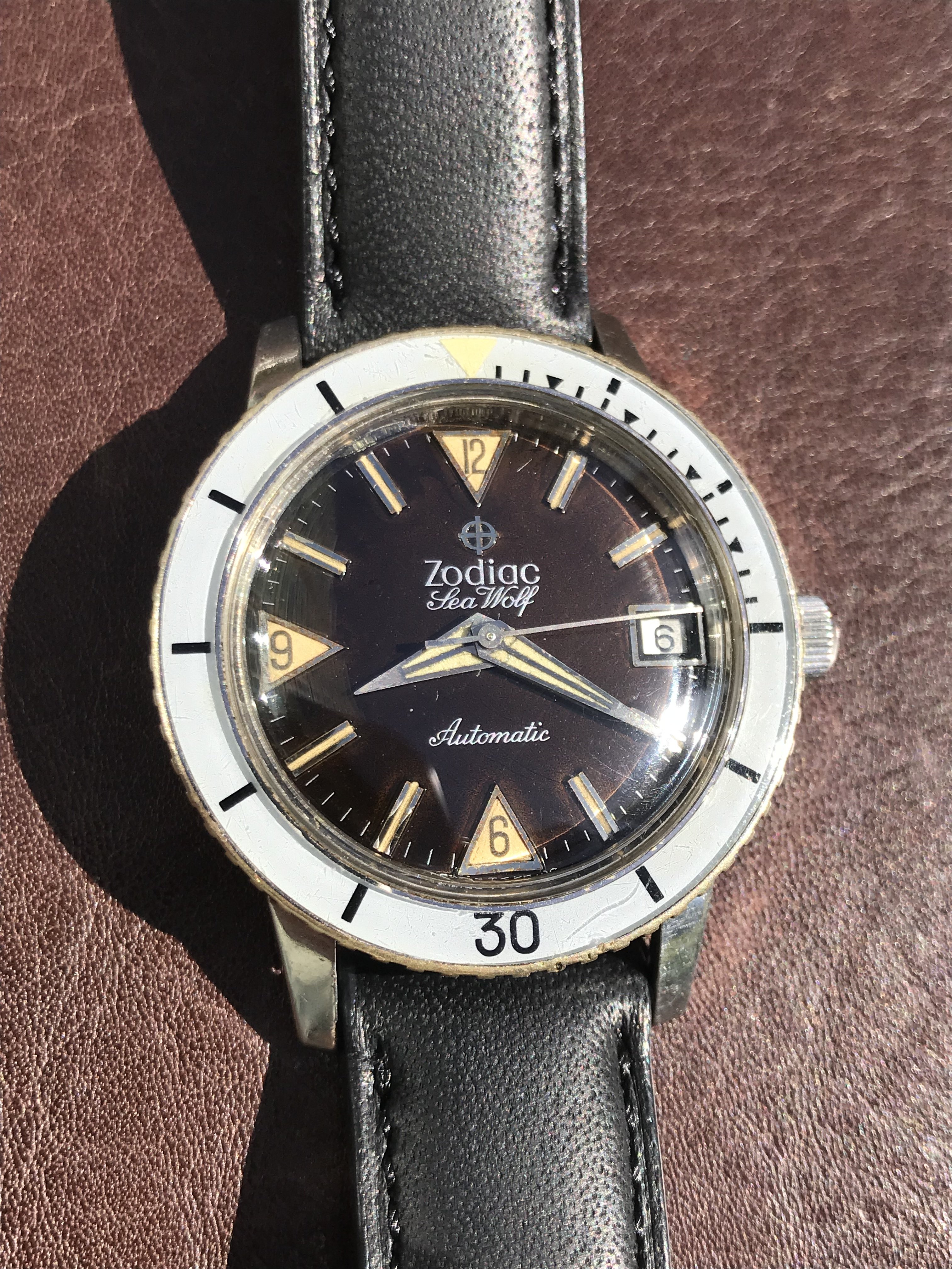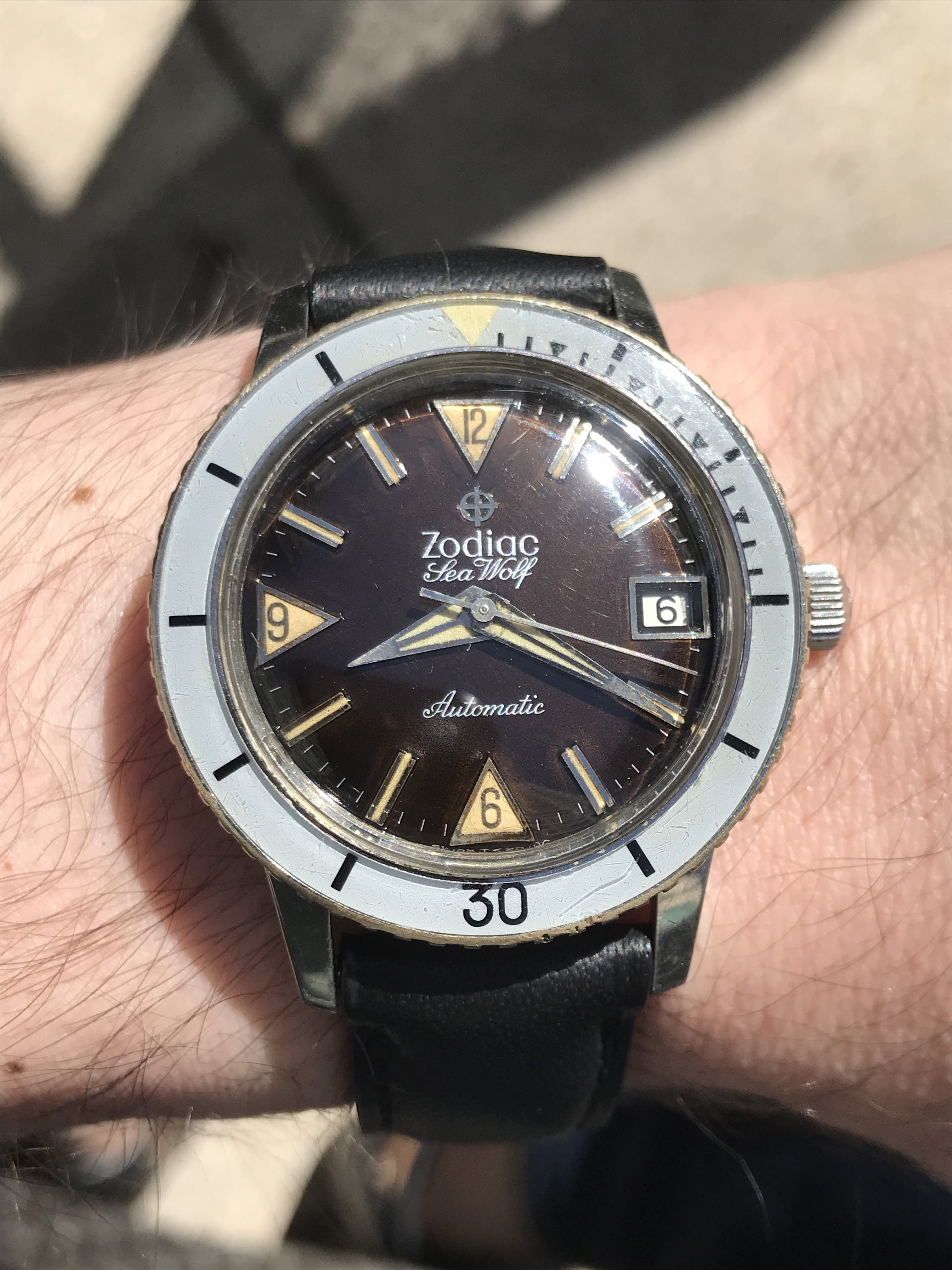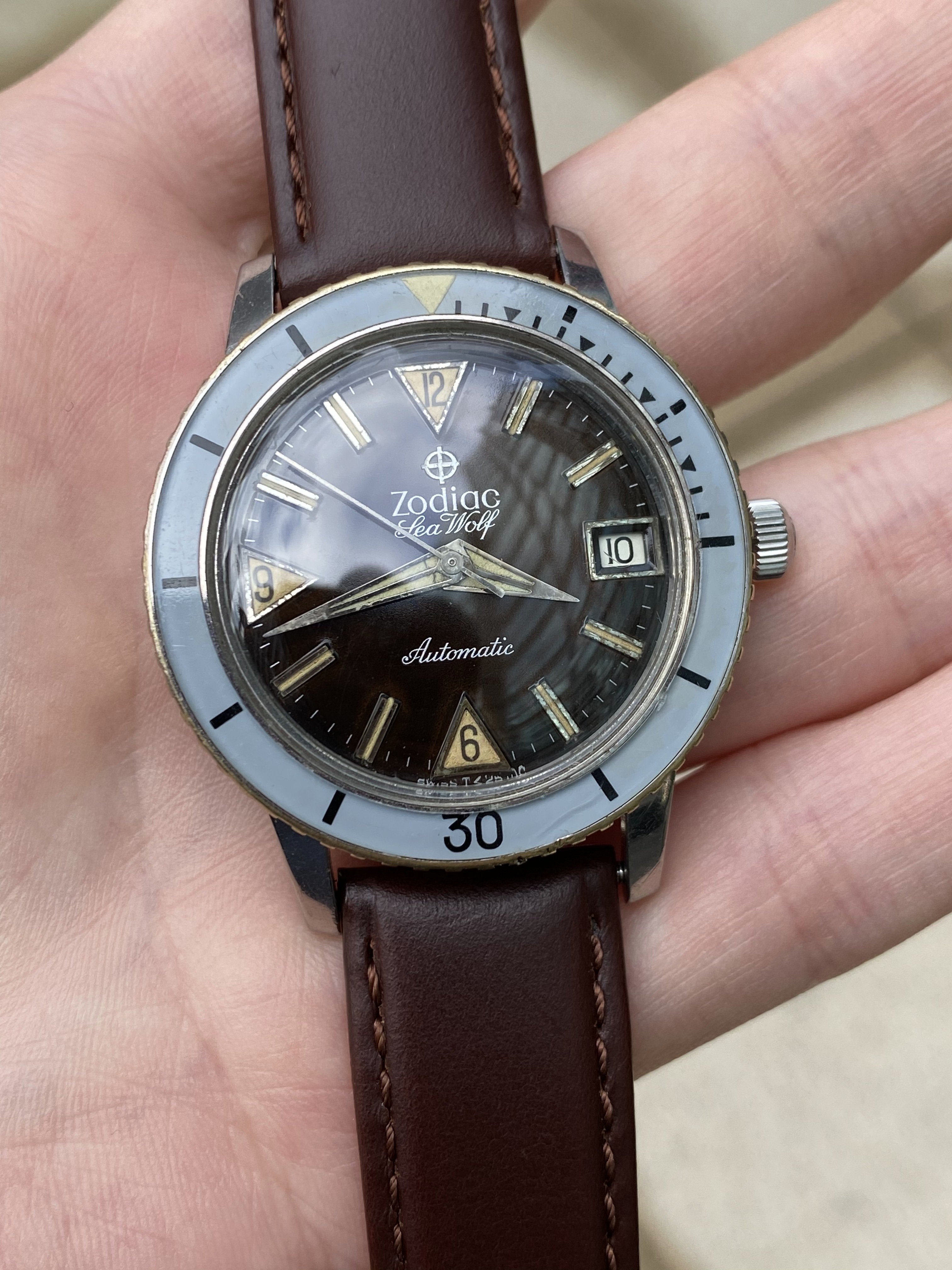·Next up for sale is a super nice 722-946B reference Zodiac Sea Wolf with an attractive tropical black dial and unique blue acrylic bezel. The original black dial has developed a subtle brown tropical patina and beautifully aged lume. The bezel and case are in very nice condition. The movement was serviced in April 2020 by Yuriy Vakulenko and is running very well. Sea Wolfs don't get much better than this in my opinion.