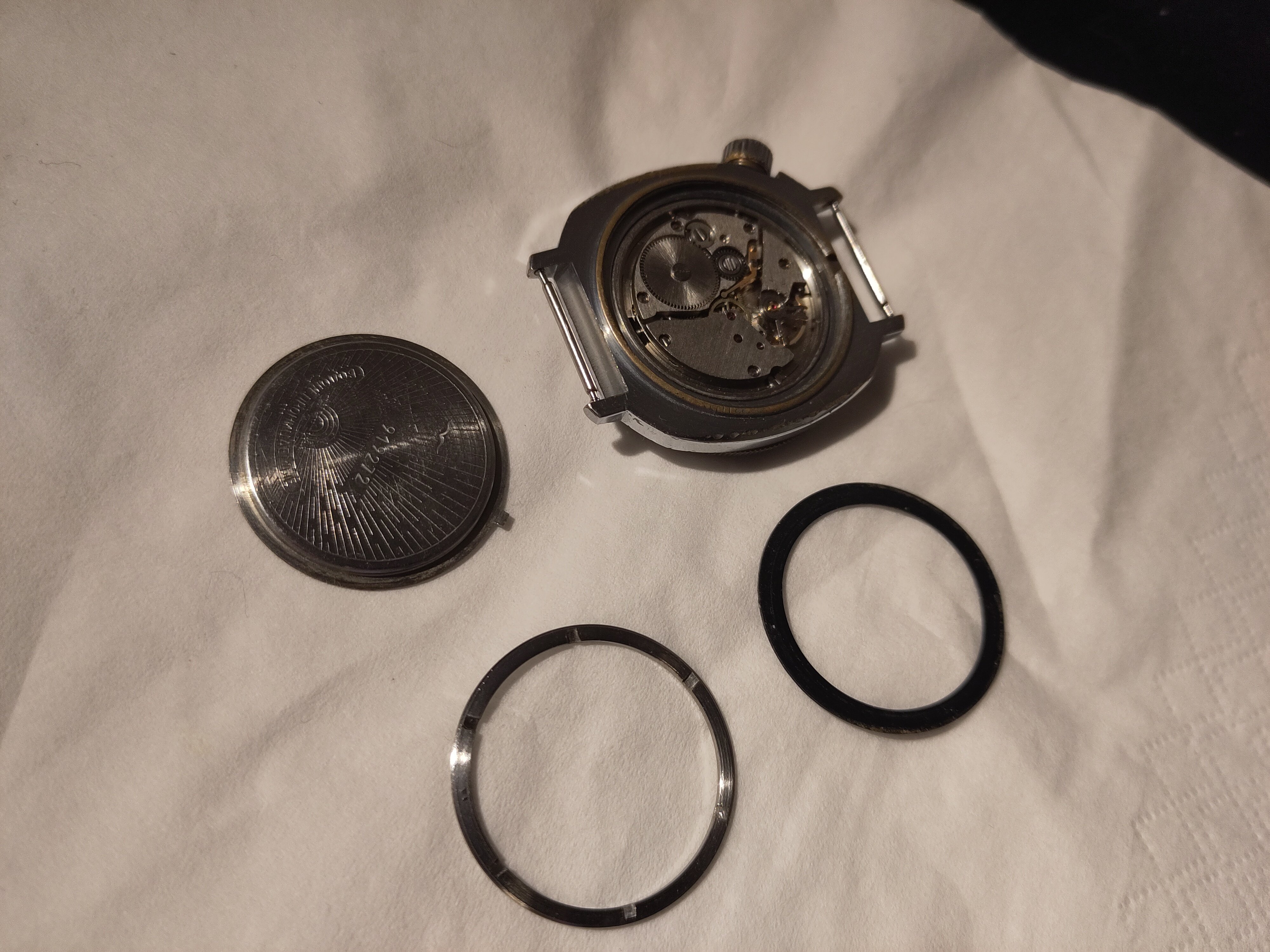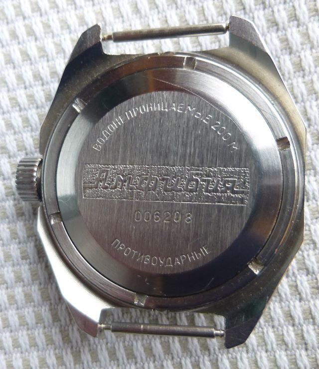 These watches are crude and rugged, but with poor accuracy. They had some interesting solutions to the problems Soviet had in the 60`s, mainly; how to produce a water resistant watch with sub standard machinery and technology. First the case back witch is in two parts, a Case back and a threaded ring to secure the case back against the case and a