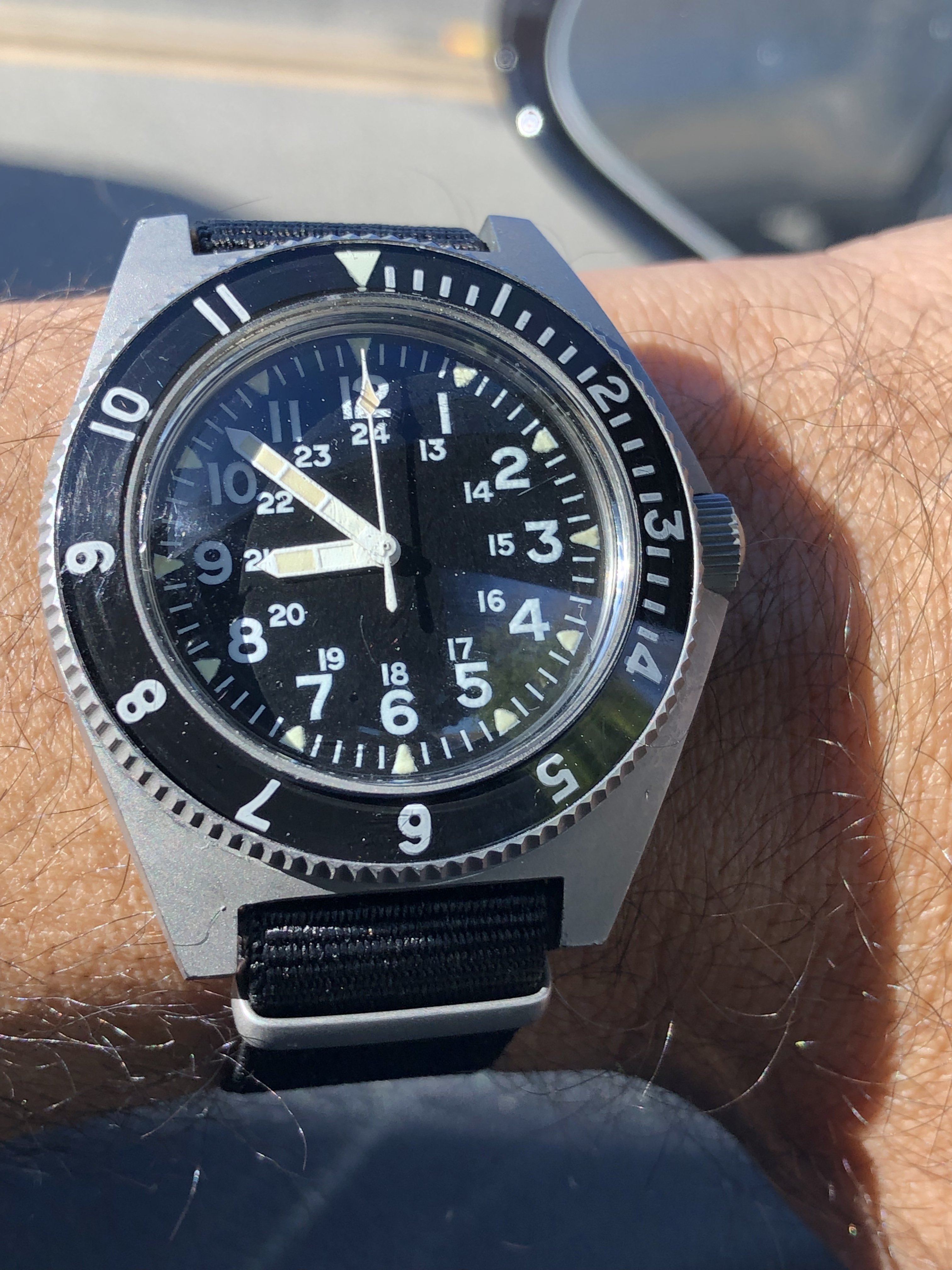 Posts 1,821 Likes 7,258 CdnWatchDoc ·Apr 7, 2019 maanu Shows the scars Mine says hello! According to the seller and watchmaker, this is all original, and the lume has not been touched. Given it was issued in 1974, I think it led a pretty charmed life on a flyboy's wrist...certainly not on that of a grunt in the field!