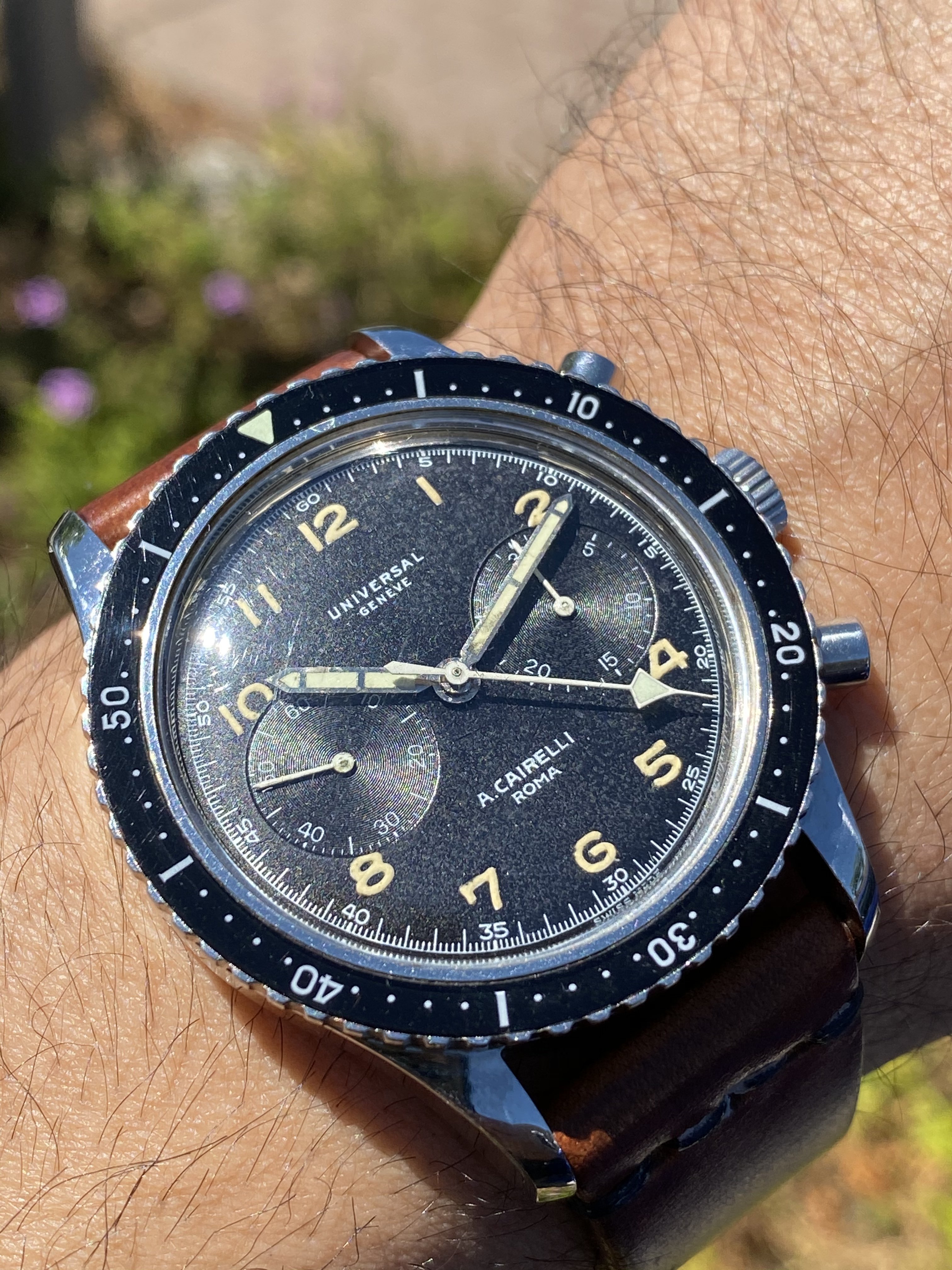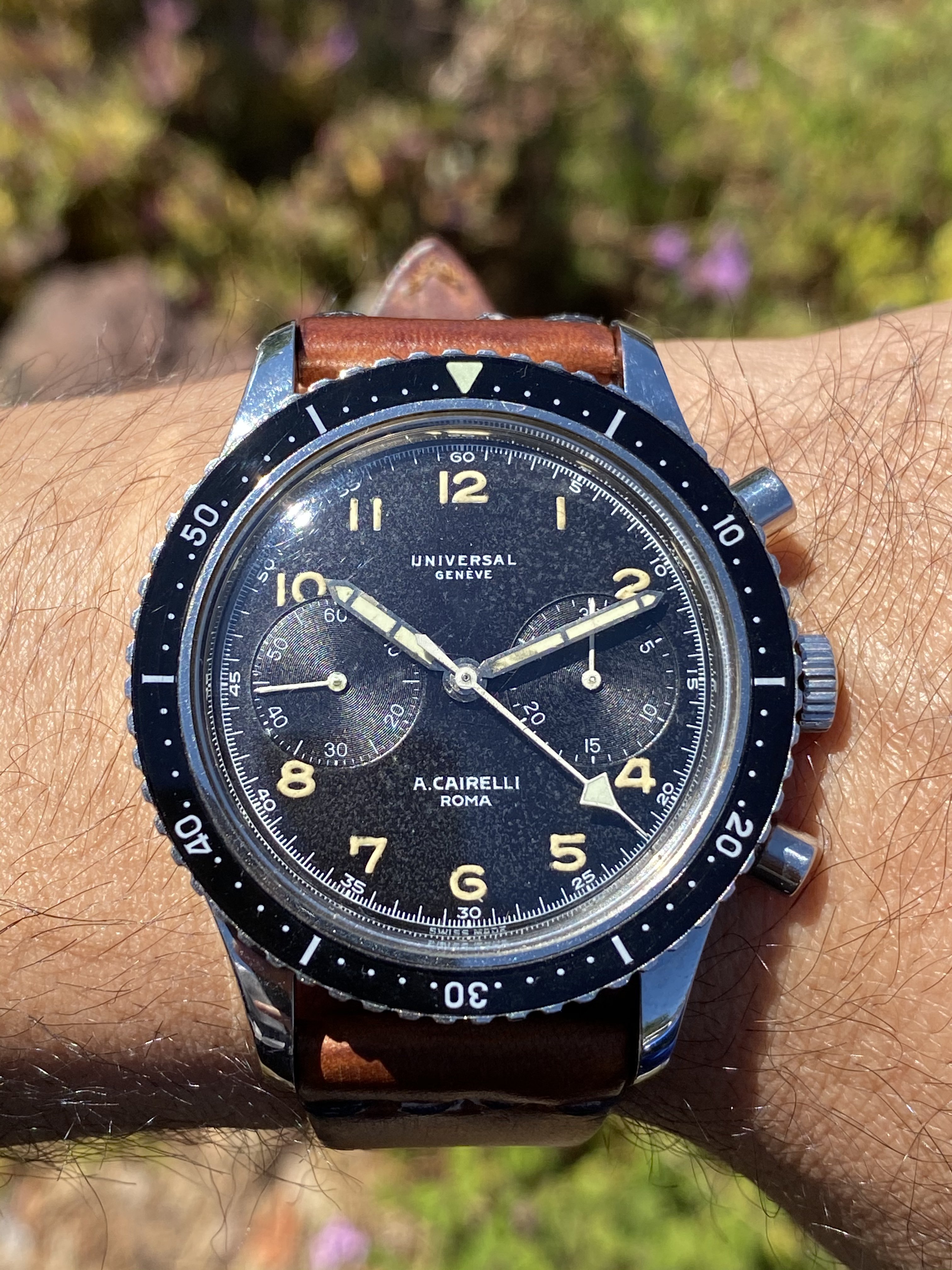 Here's my favourite, A Glashütte Tutima Urofa 59 Flieger chroronograh from 1941. An amazingly beautiful, tough as nails flyback chrono that keeps COSC time. This is a pure tool watch. 39 mm for great legibility, pushers and crown are ergonimically designed for in-flight functionality and the radium hands and markers still have life in them!