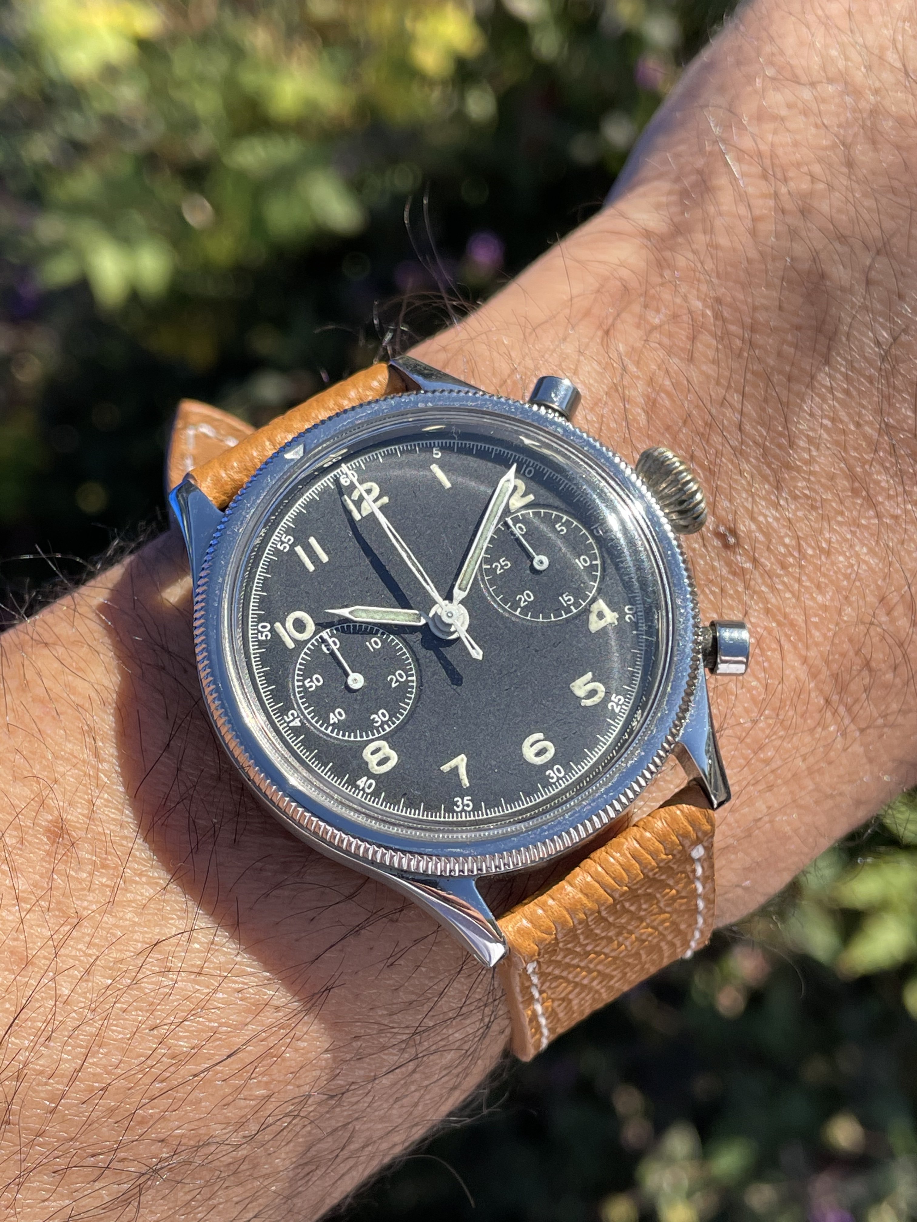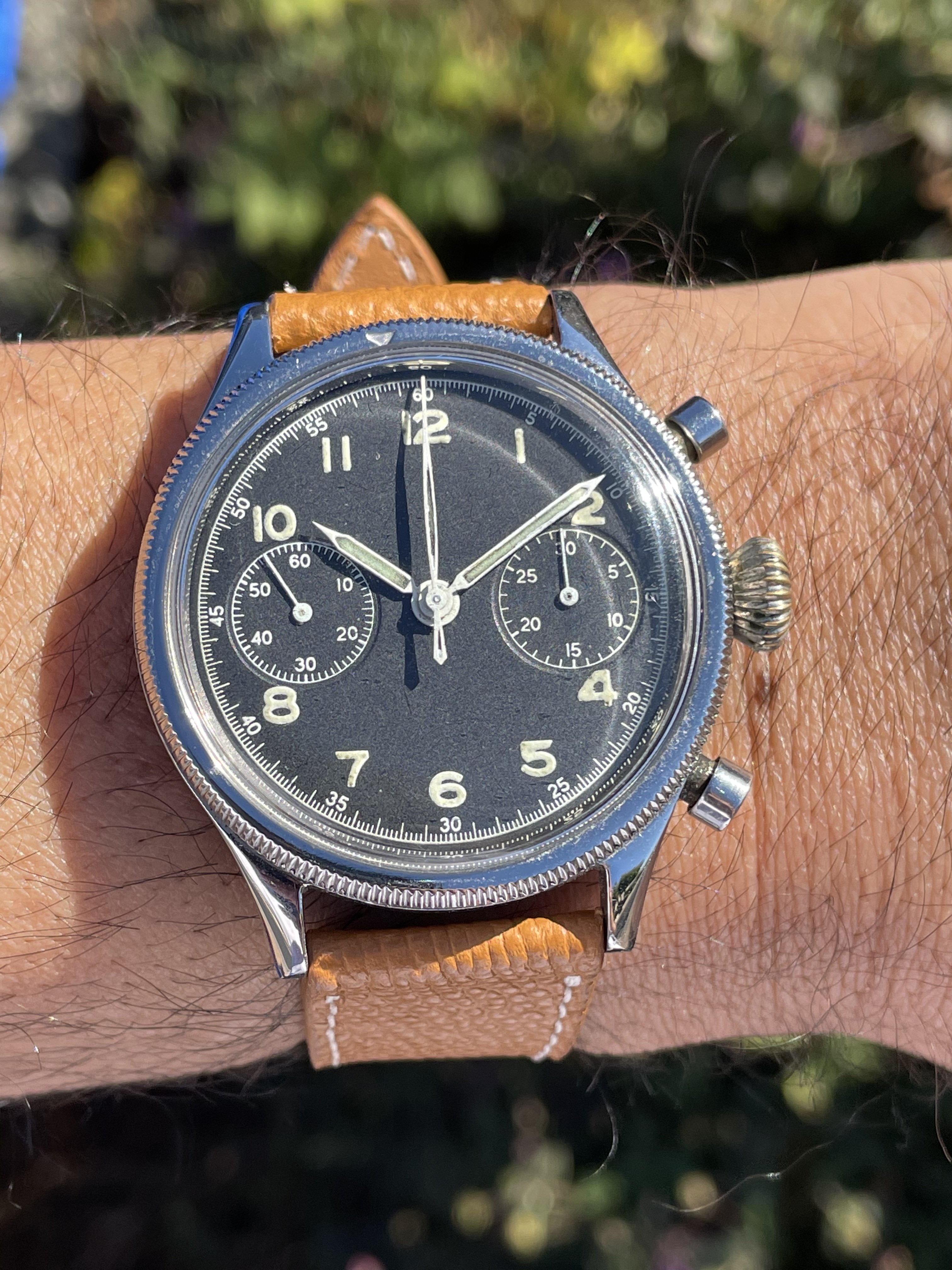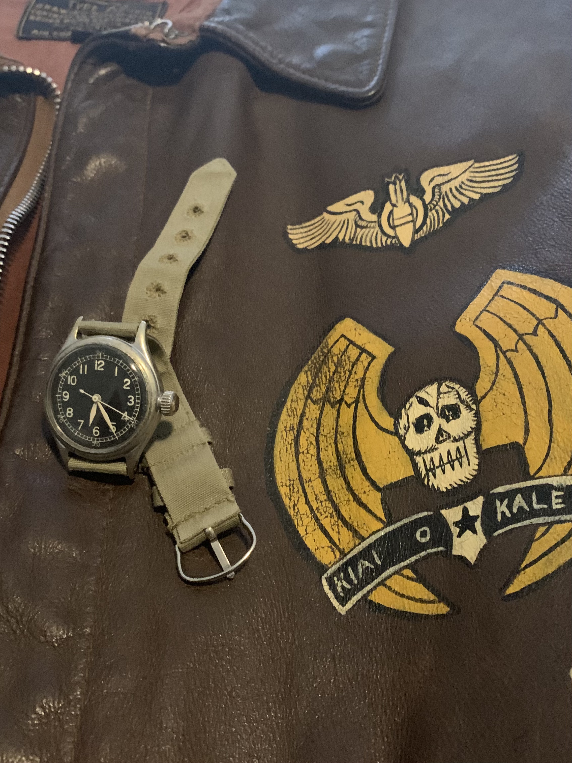 ·Put on my Bulova A11 this morning but took this picture before putting it on. My Grandfathers type A2 flight jacket with the watch. Both date from approximately 1943 and he was likely issued a similar watch when issued the jacket. Jacket was worn while serving with the 13th US Army Air Force in the South Pacific.