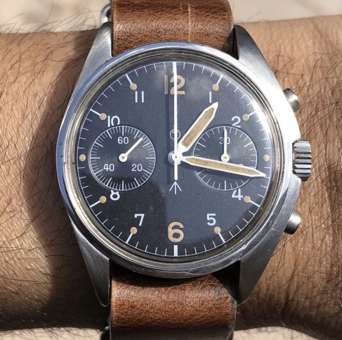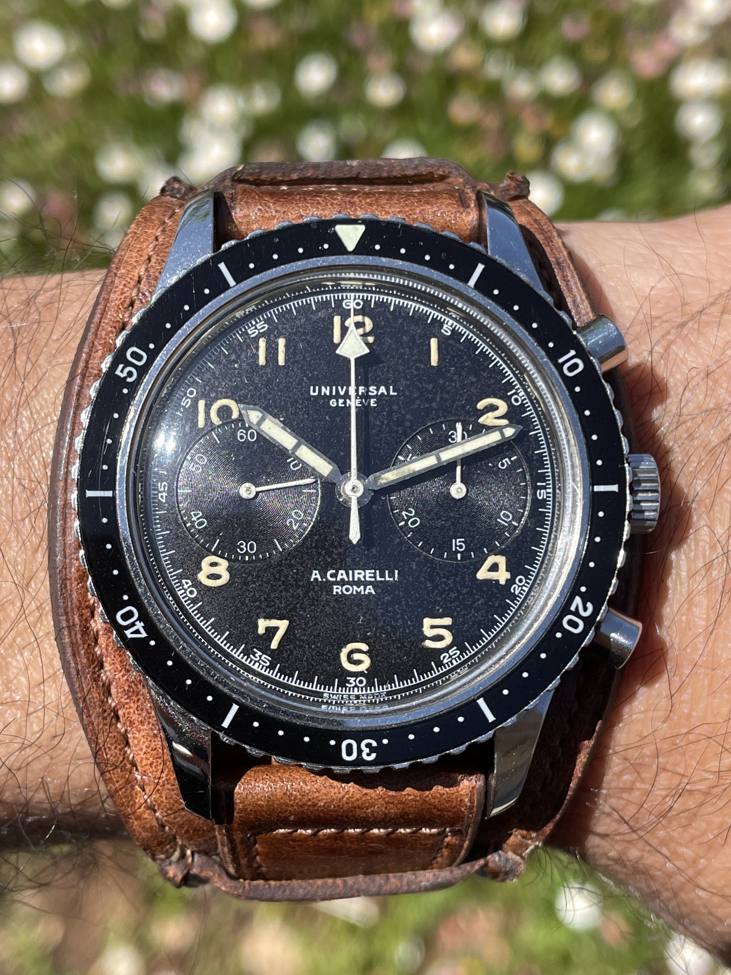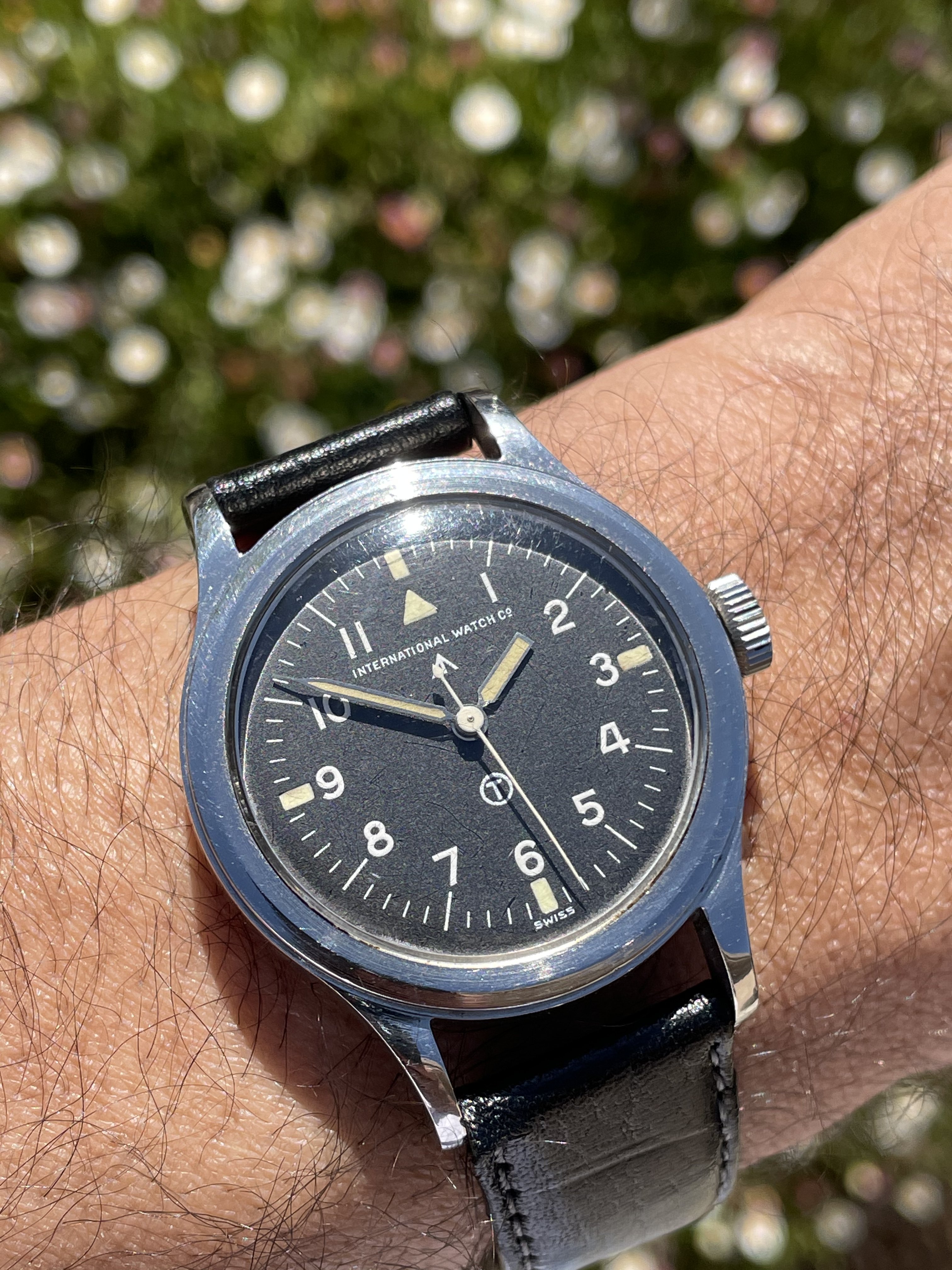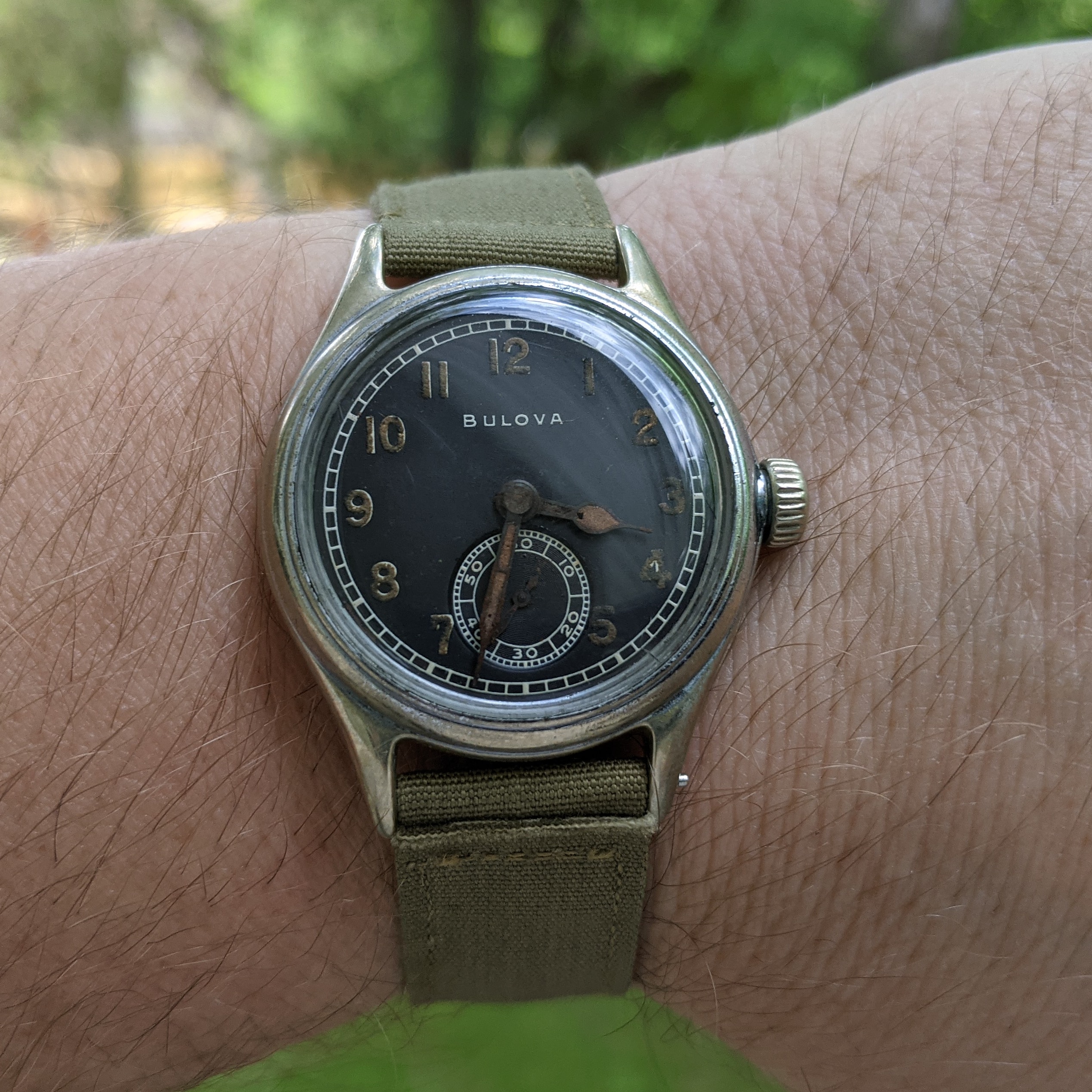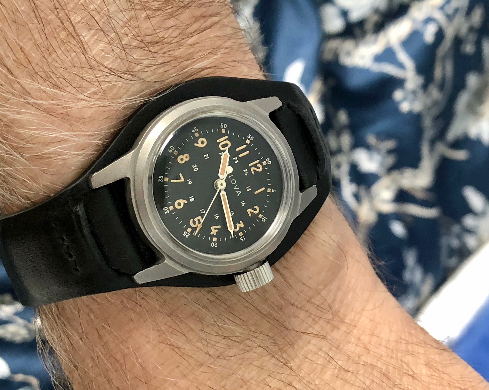 Put on my Bulova A11 this morning but took this picture before putting it on. My Grandfathers type A2 flight jacket with the watch. Both date from approximately 1943 and he was likely issued a similar watch when issued the jacket. Jacket was worn while serving with the 13th US Army Air Force in the South Pacific.