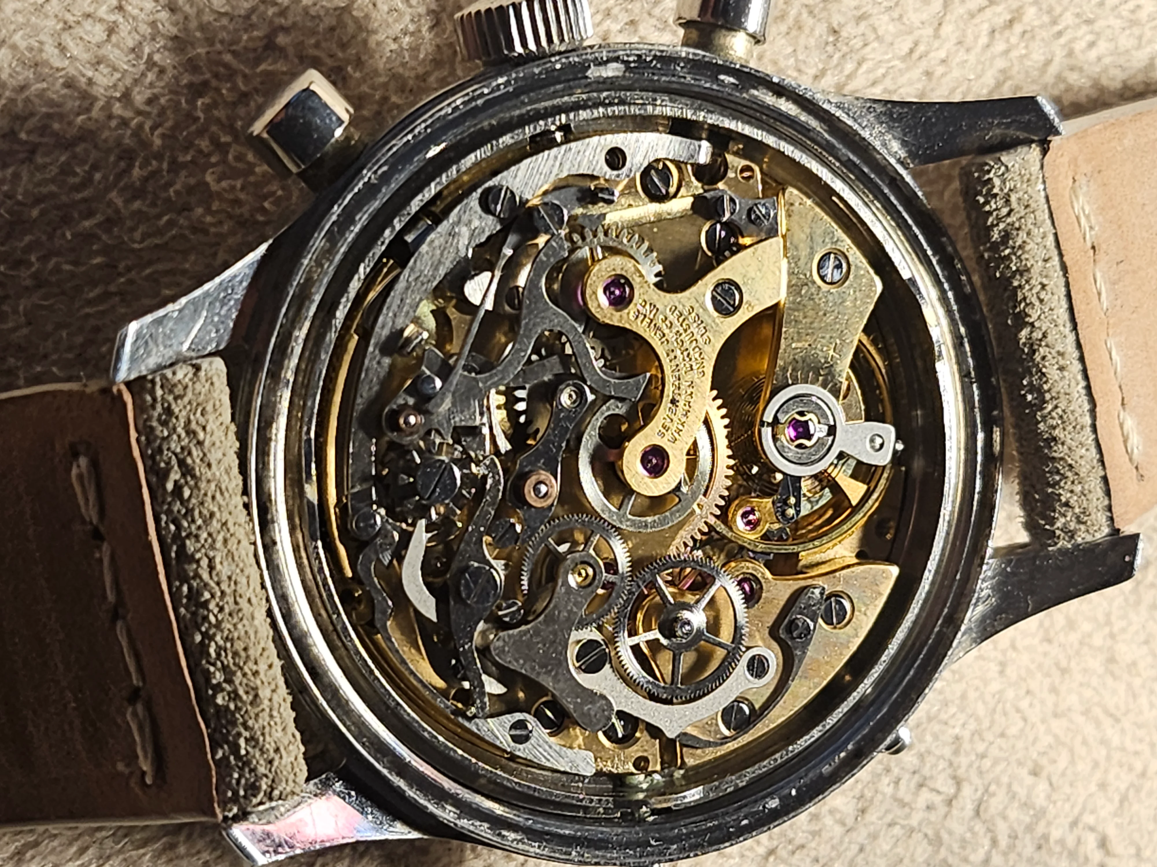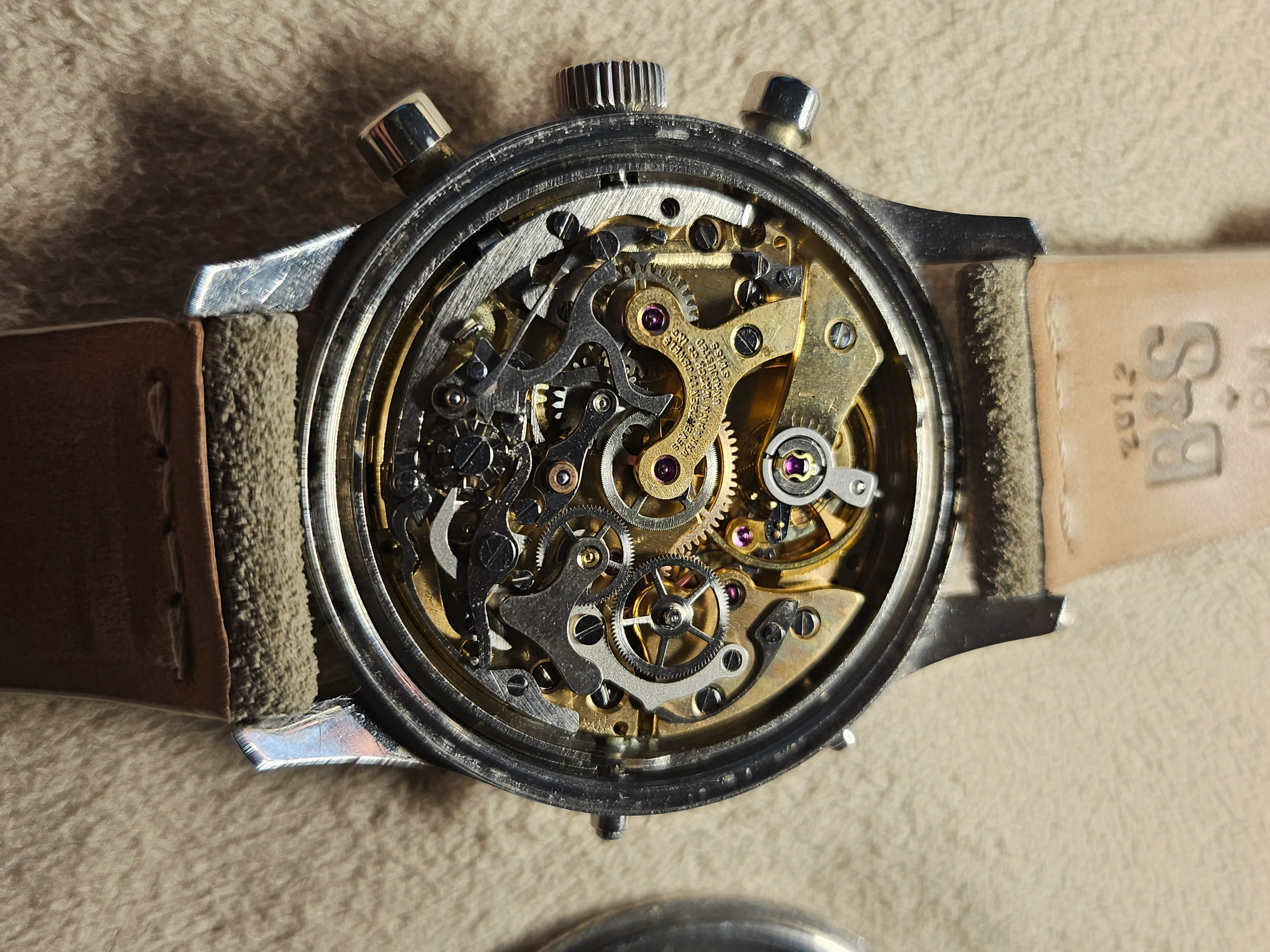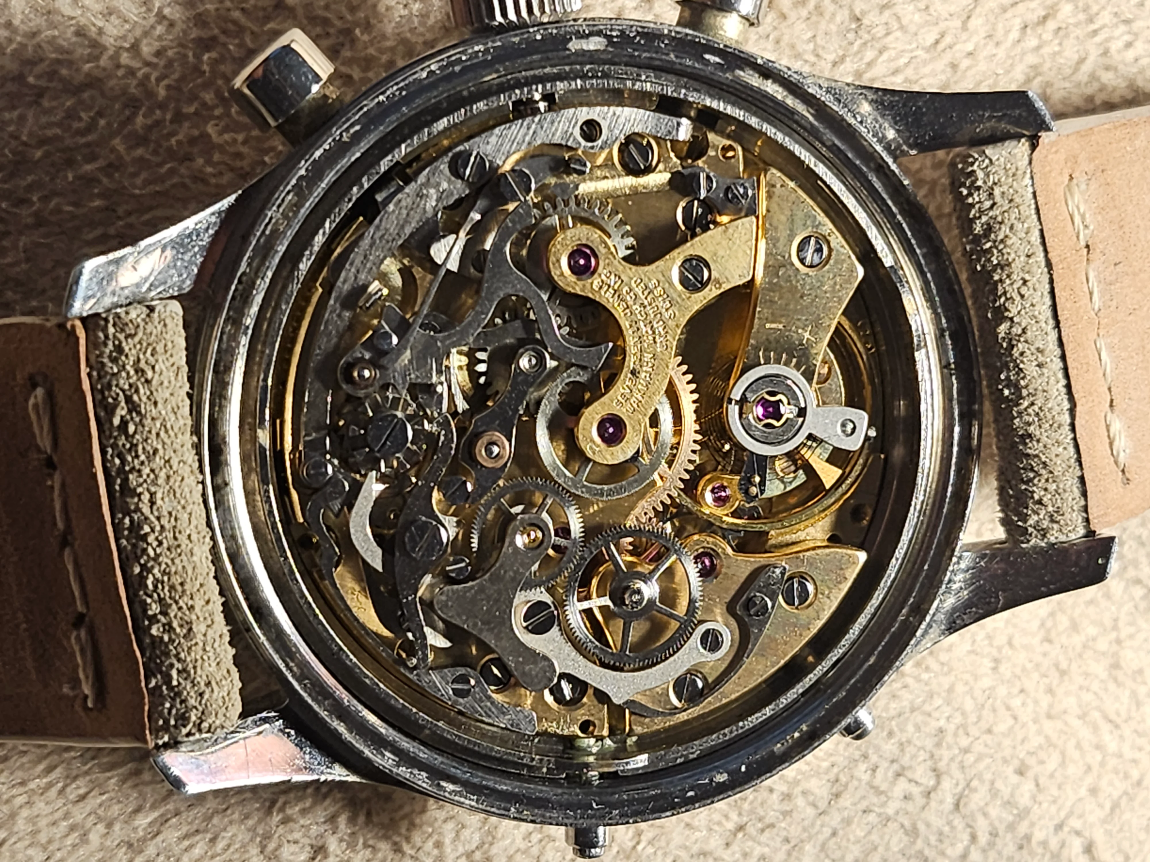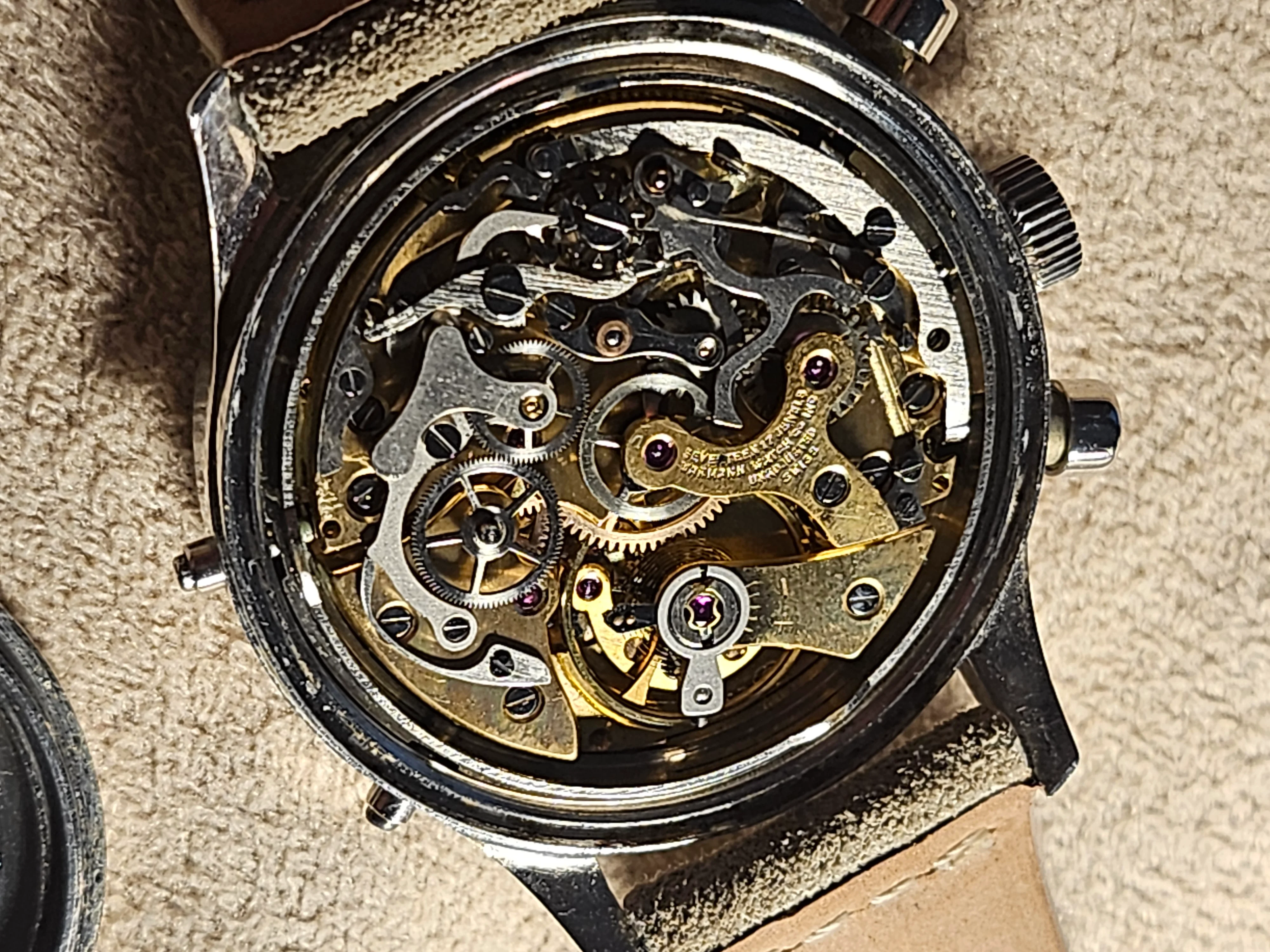 Condition: Watch is fully functioning as it should (dates flipping over, actuation of chronograph, reset, actuation of manual knobs for date adjustment). Did not service it in my ownership, unknown service history beforehand. Movement is very clean.