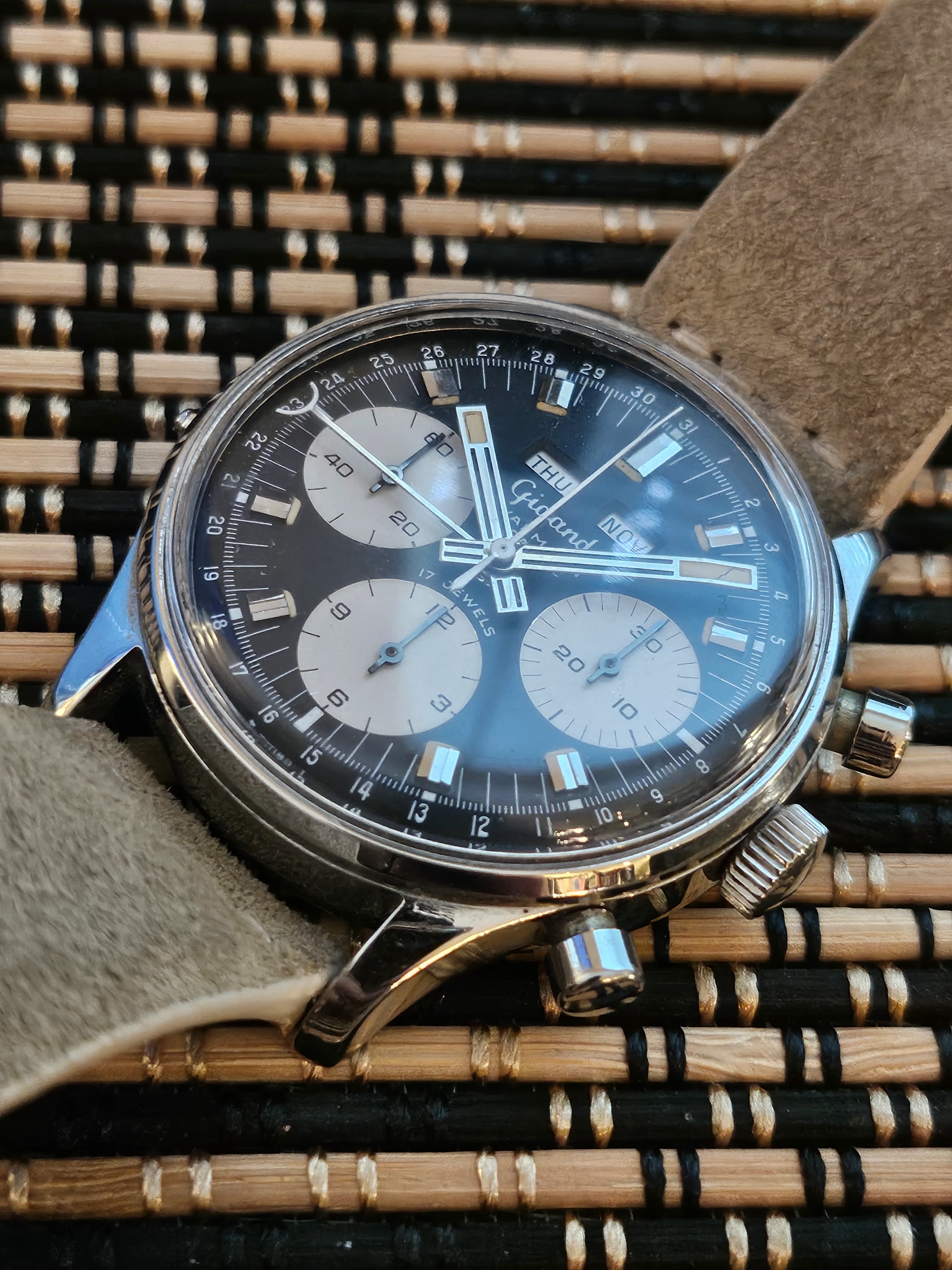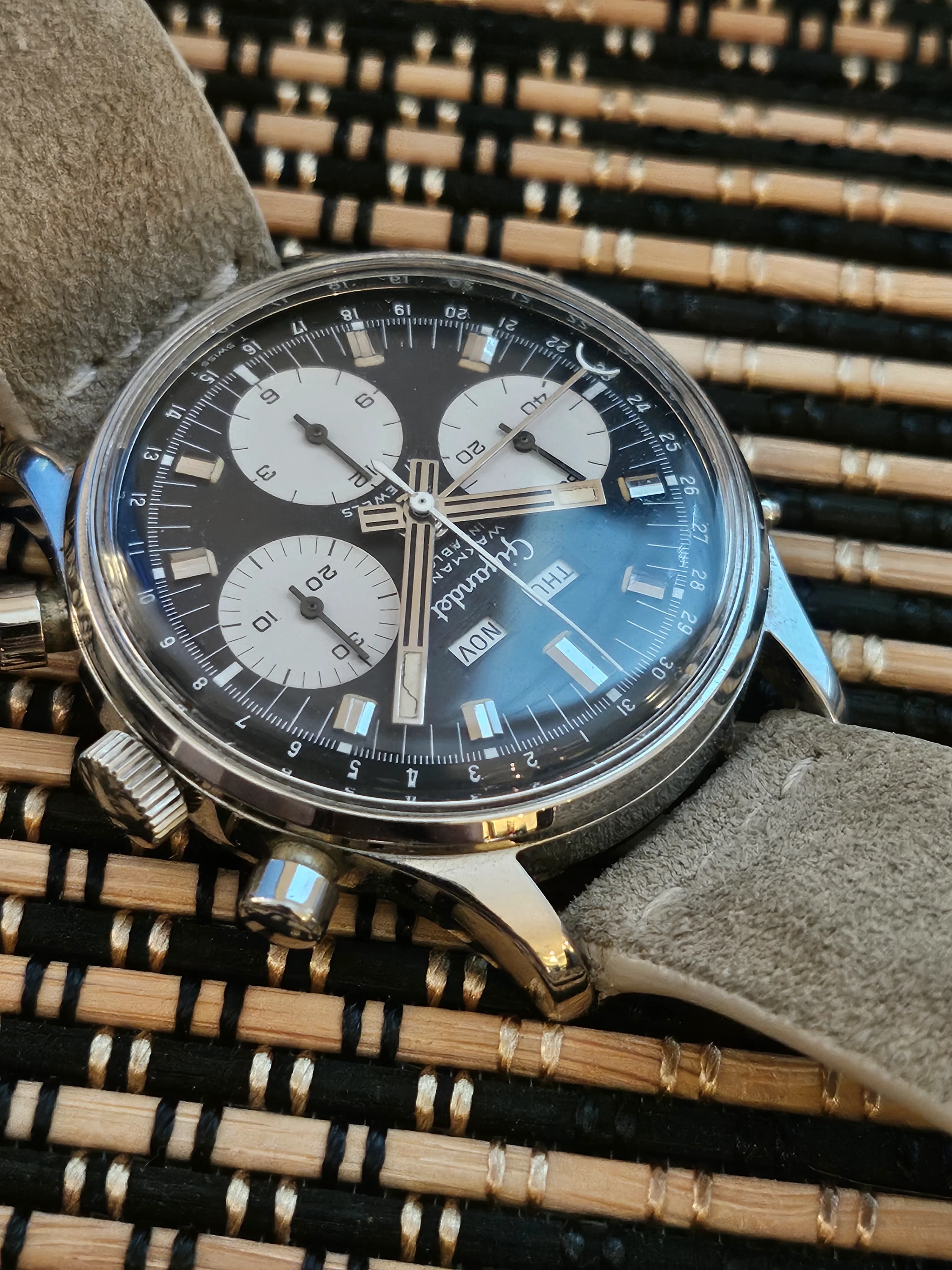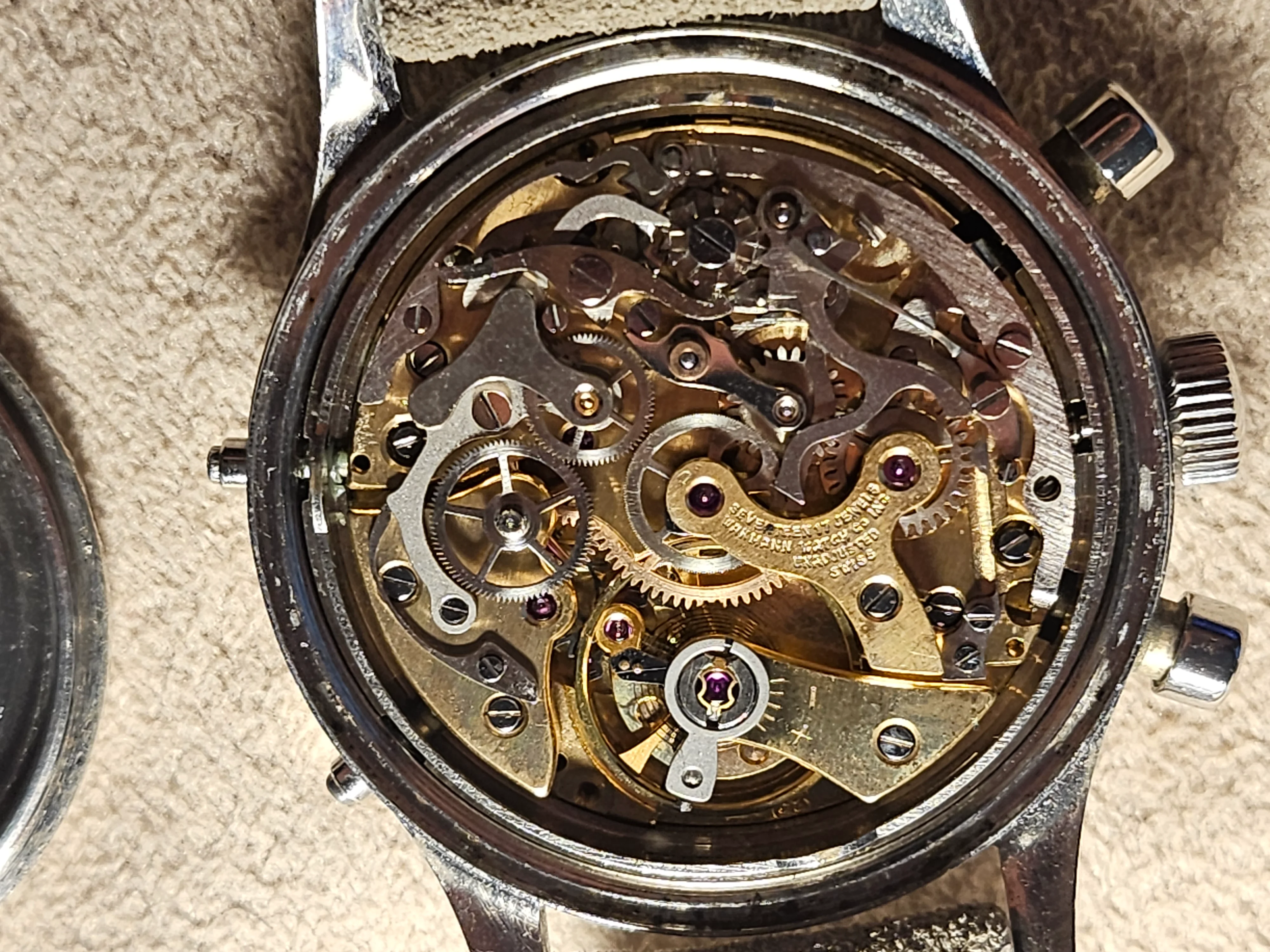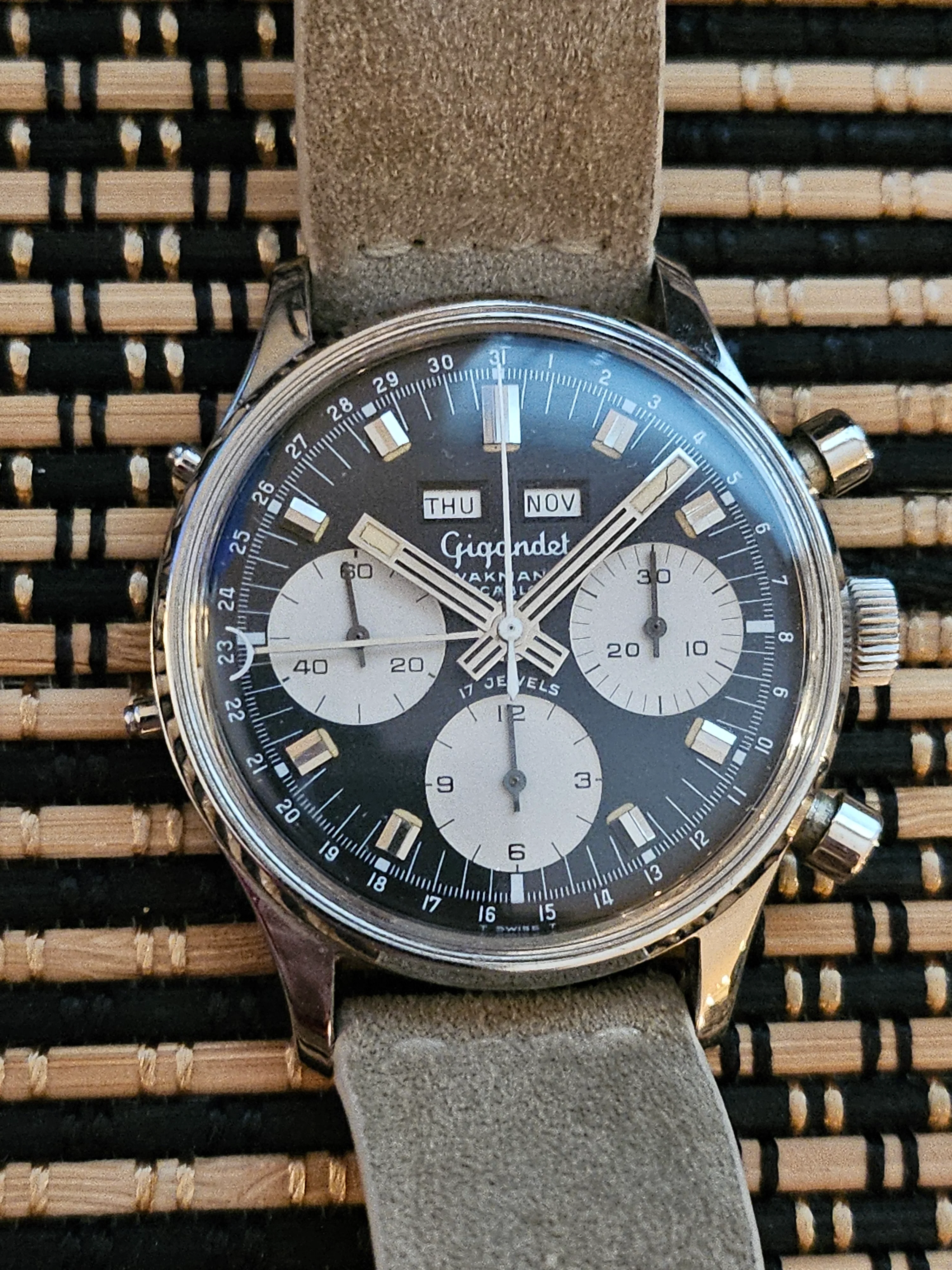 Condition: Watch is fully functioning as it should (dates flipping over, actuation of chronograph, reset, actuation of manual knobs for date adjustment). Did not service it in my ownership, unknown service history beforehand. Movement is very clean.