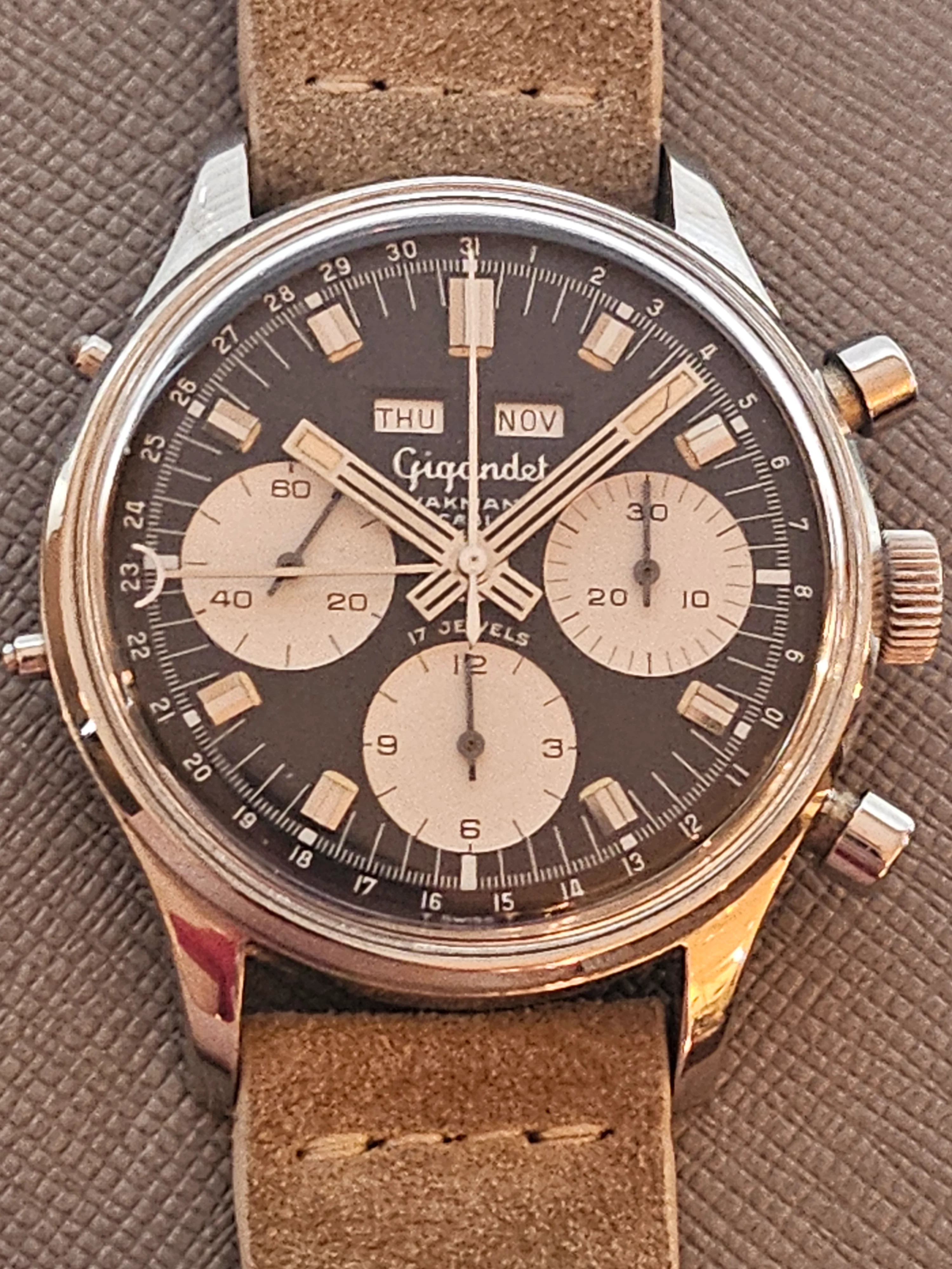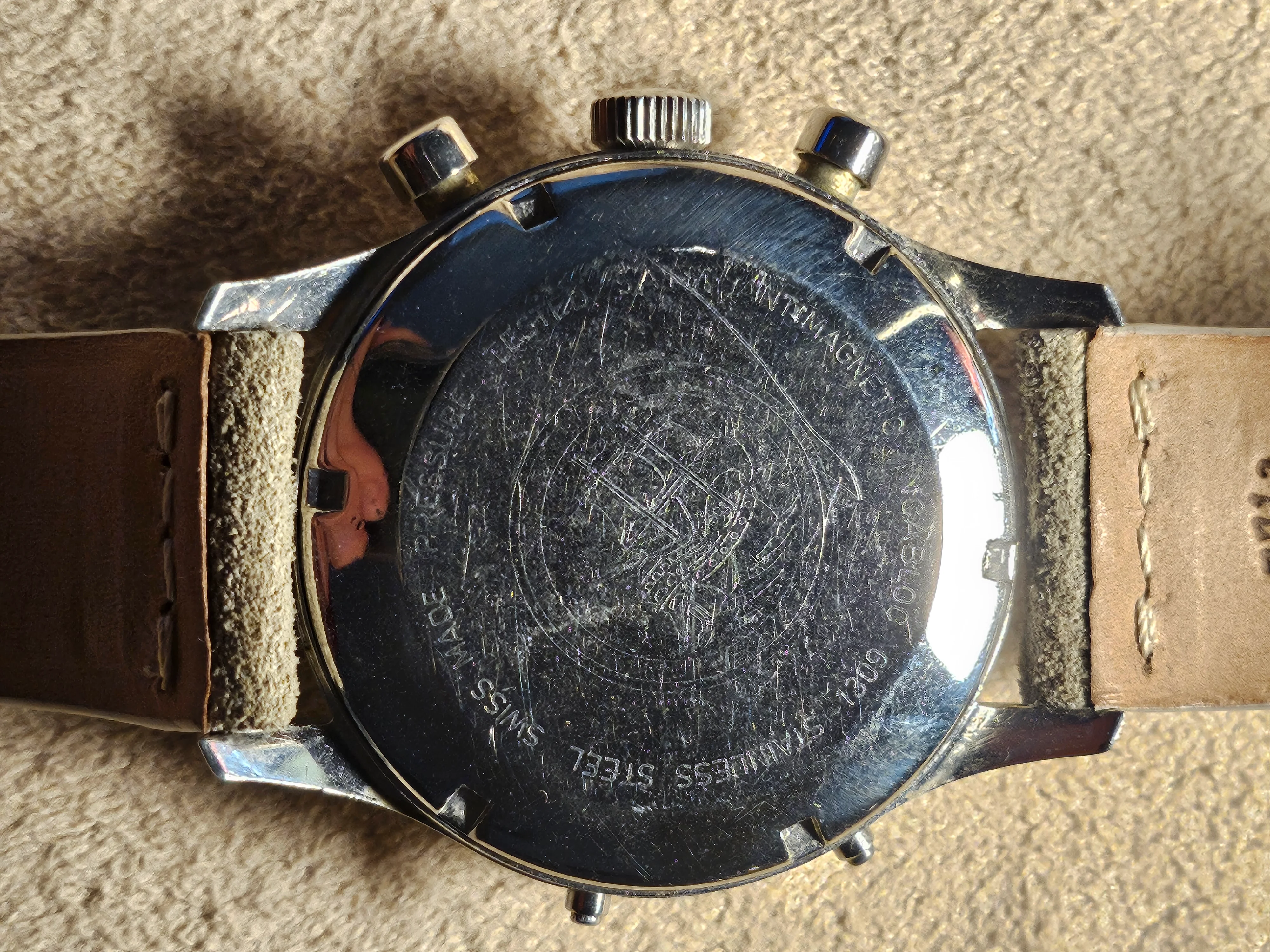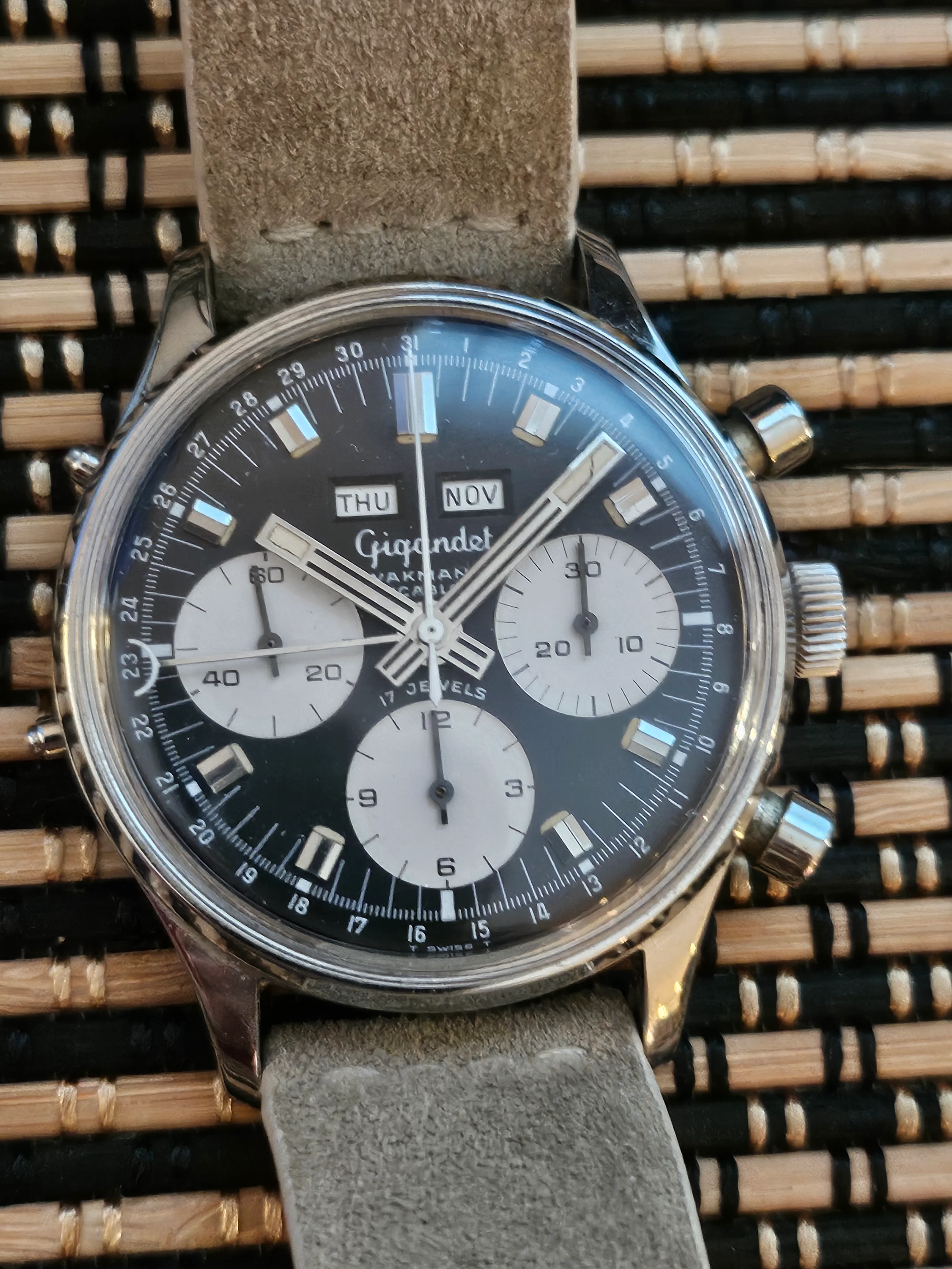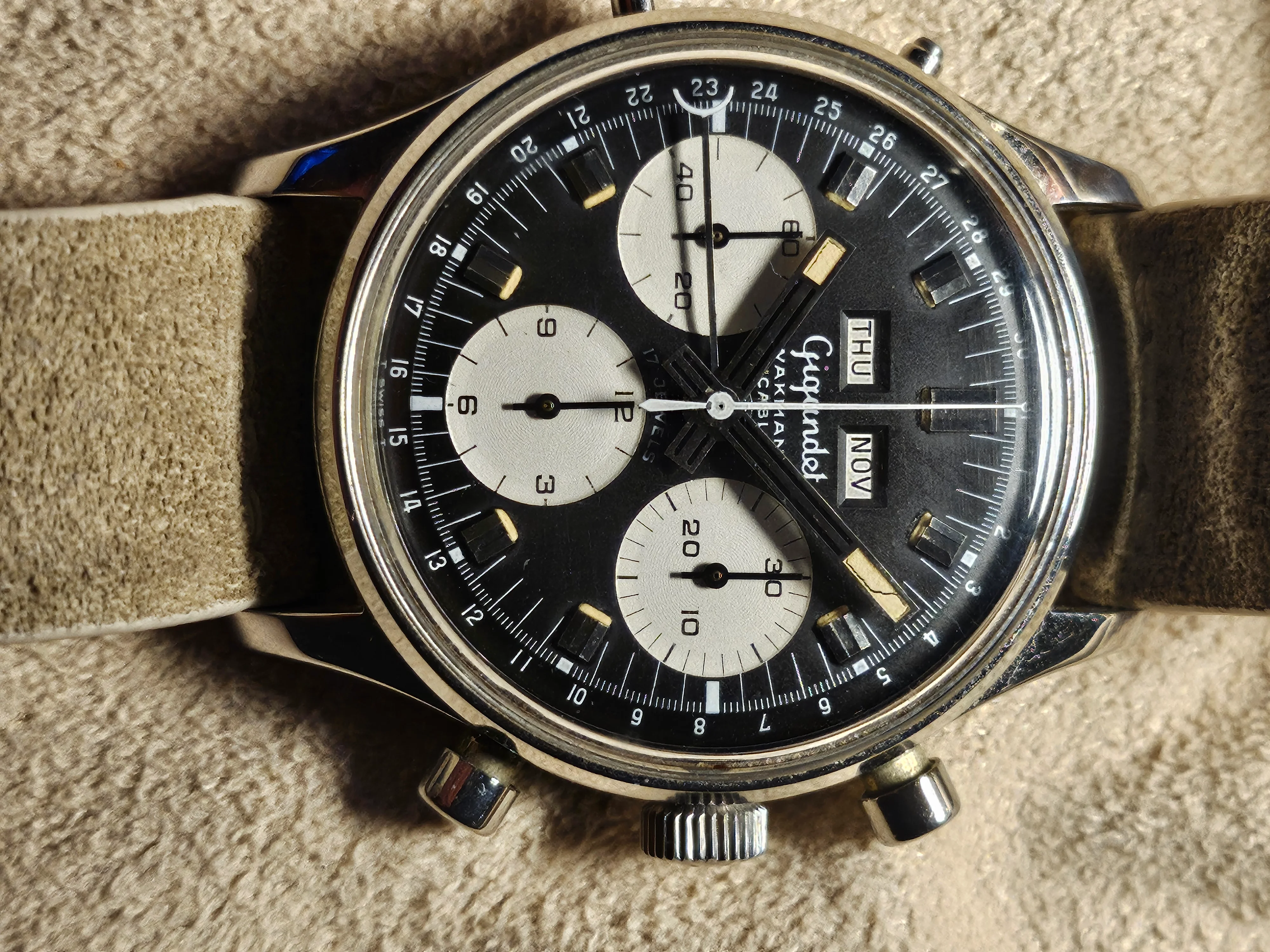 Condition: Watch is fully functioning as it should (dates flipping over, actuation of chronograph, reset, actuation of manual knobs for date adjustment). Did not service it in my ownership, unknown service history beforehand. Movement is very clean.