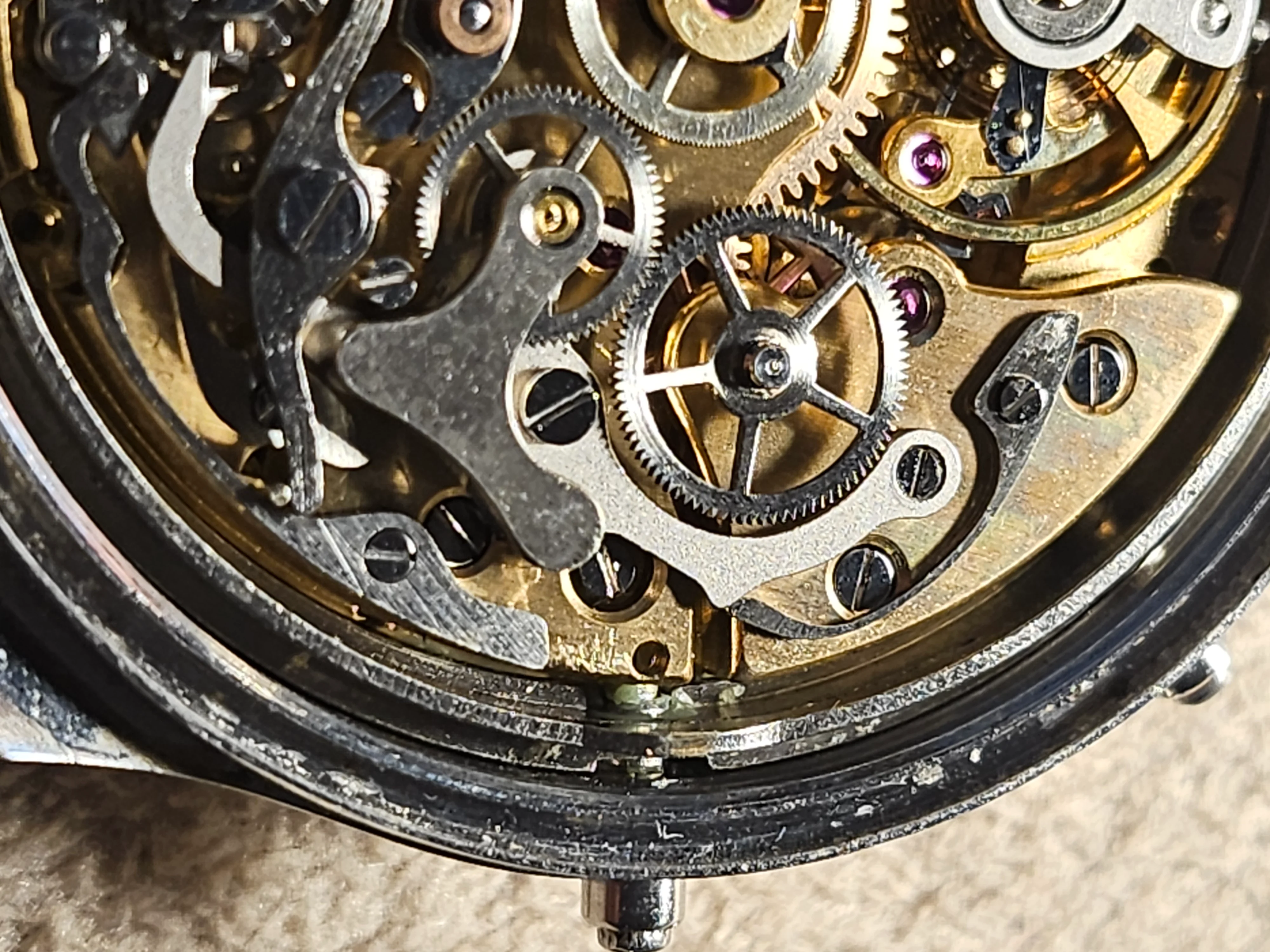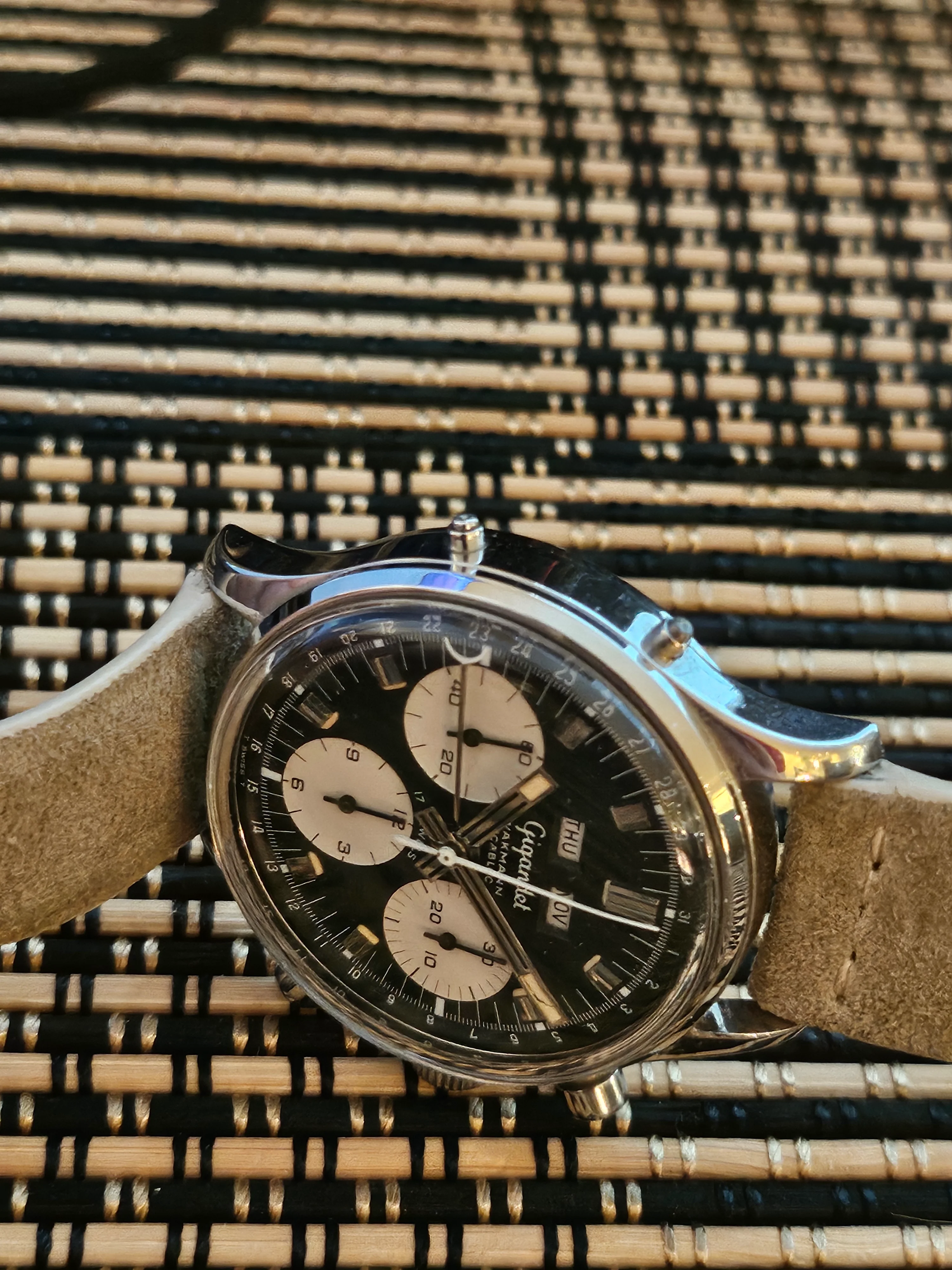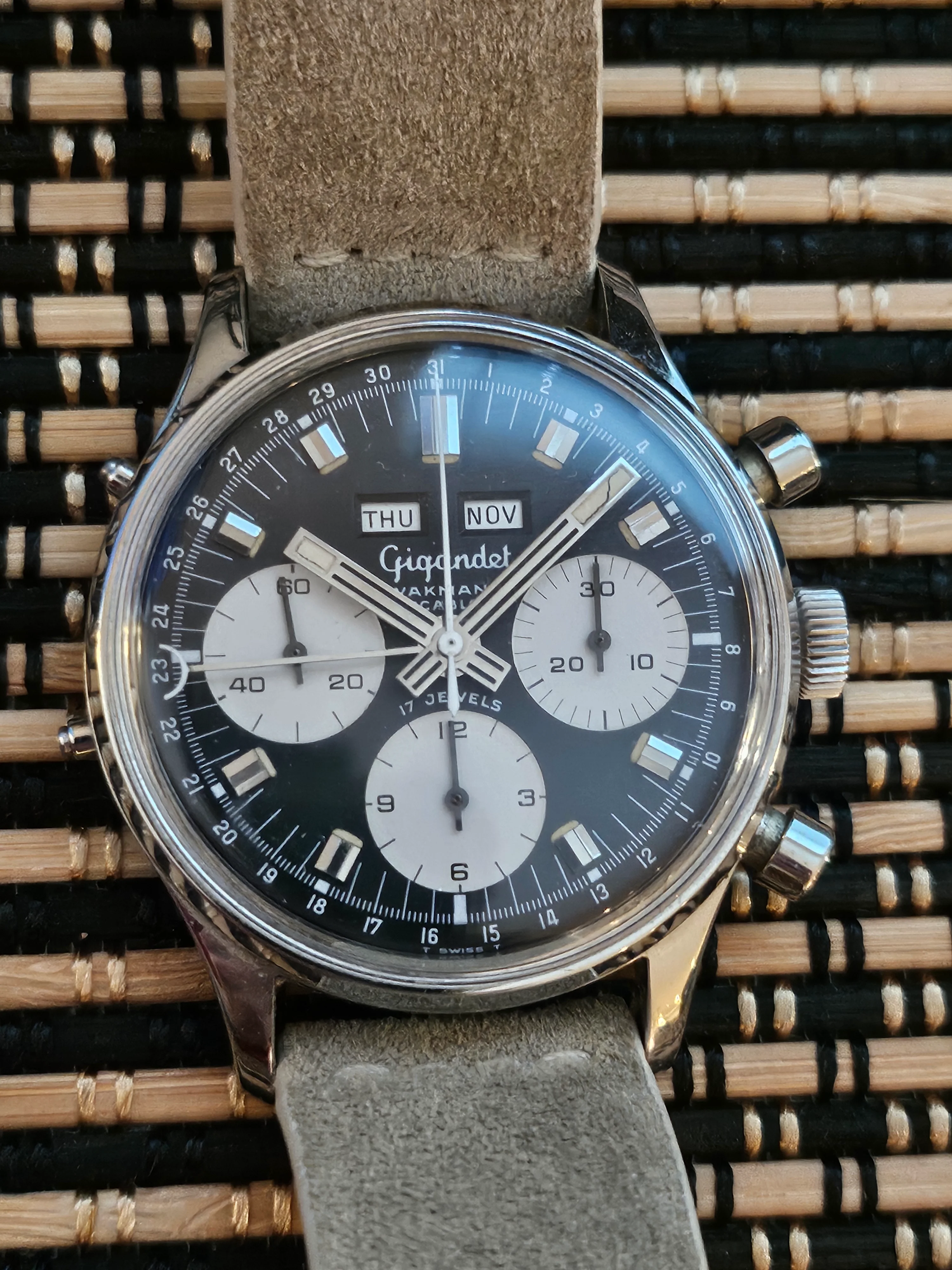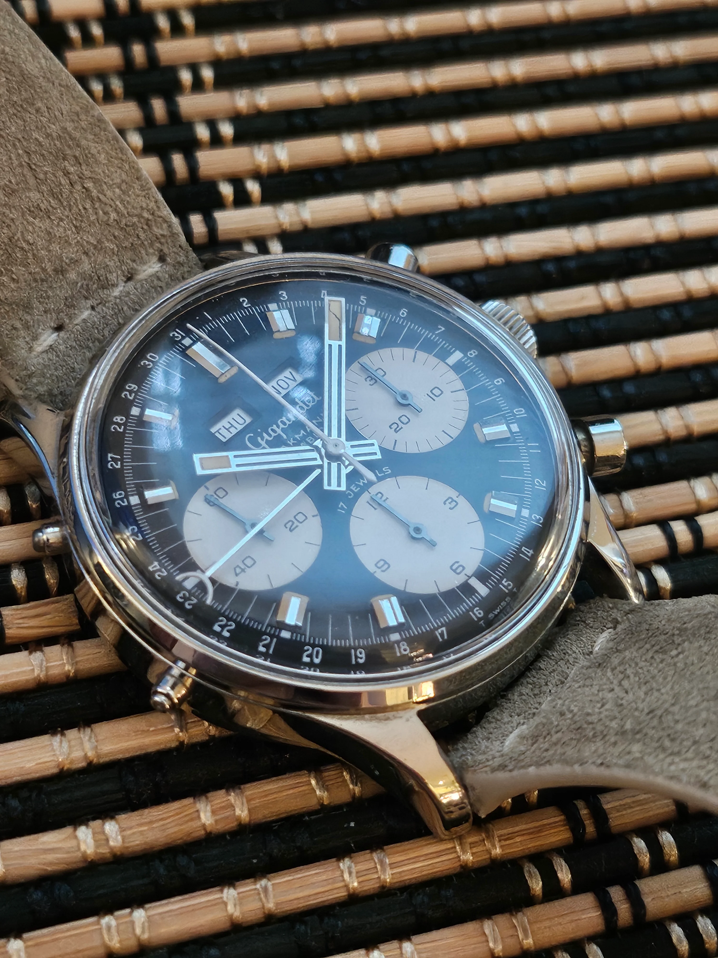 Condition: Watch is fully functioning as it should (dates flipping over, actuation of chronograph, reset, actuation of manual knobs for date adjustment). Did not service it in my ownership, unknown service history beforehand. Movement is very clean.