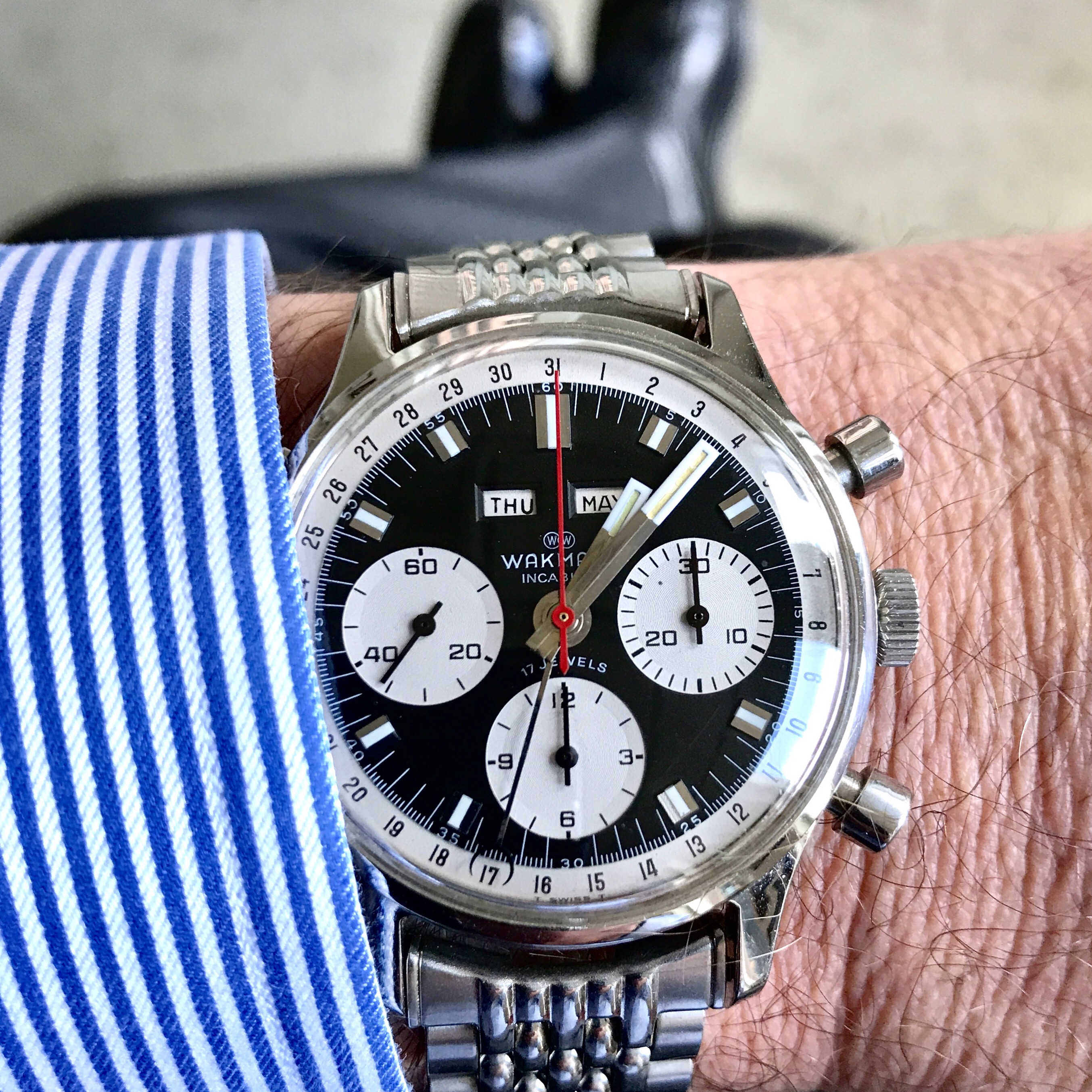 Well, I took the leap and bought one. It should be here in a few days. I wanted the larger 39mm size and found a pretty nice one. Mark, yours has some differences from most I've seen. Does it have a different maker name? Oh, now I see. It doesn't have the white outer ring. I like it. And Dan, sorry. I made the underwhelming comment when I thought they were all 36mm. The larger size should be just perfect. Excuse my ignorance. Imagine if someday there is a "Triple Date Only" book printed for your coffee tables and Wakmann geeks discuss the finer points and variations of the Wakmann Triple Date Panda. Does anyone know the reference numbers for the two sizes? We may need our own SUB FORUM! Carpe Wakmann!