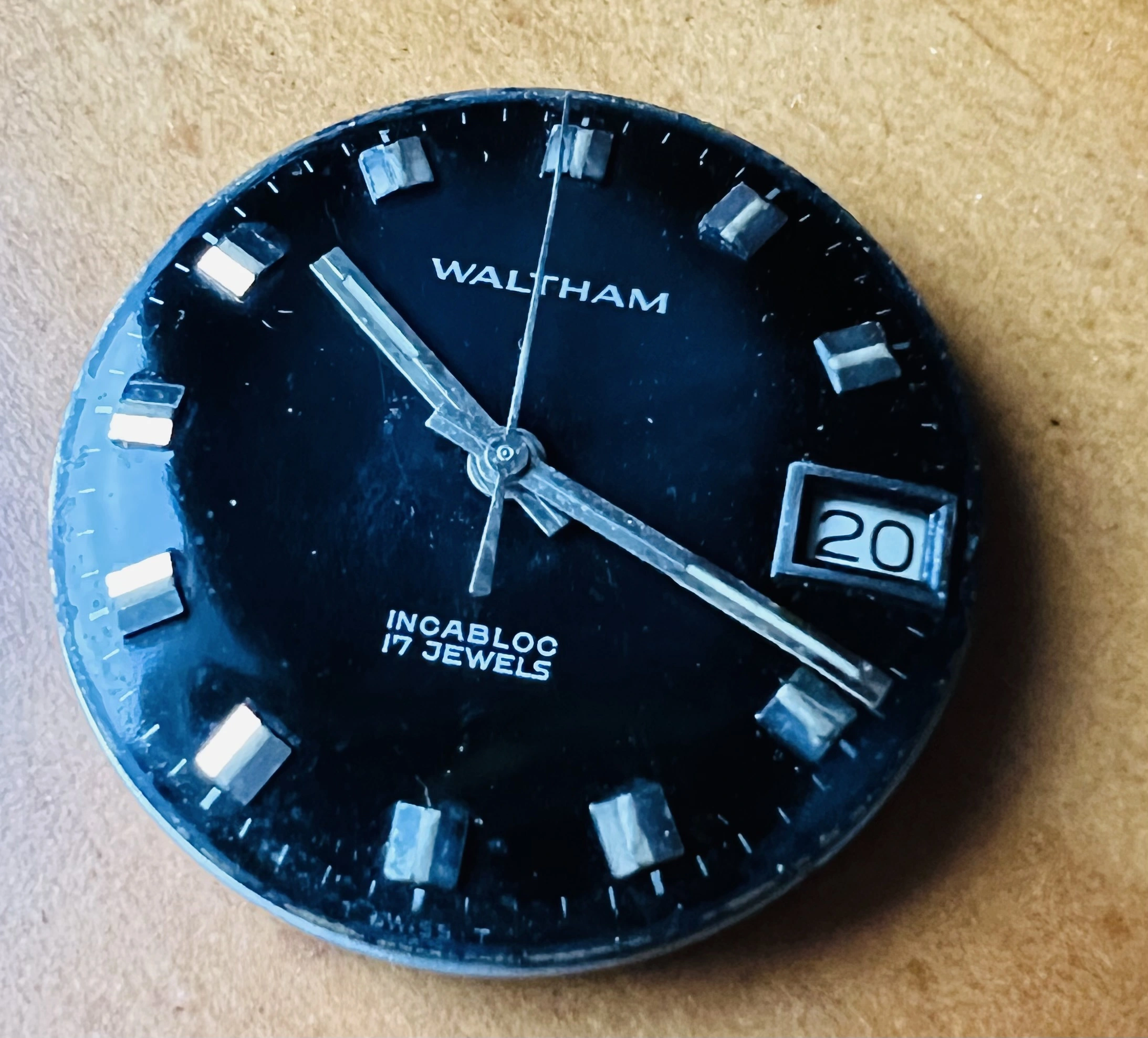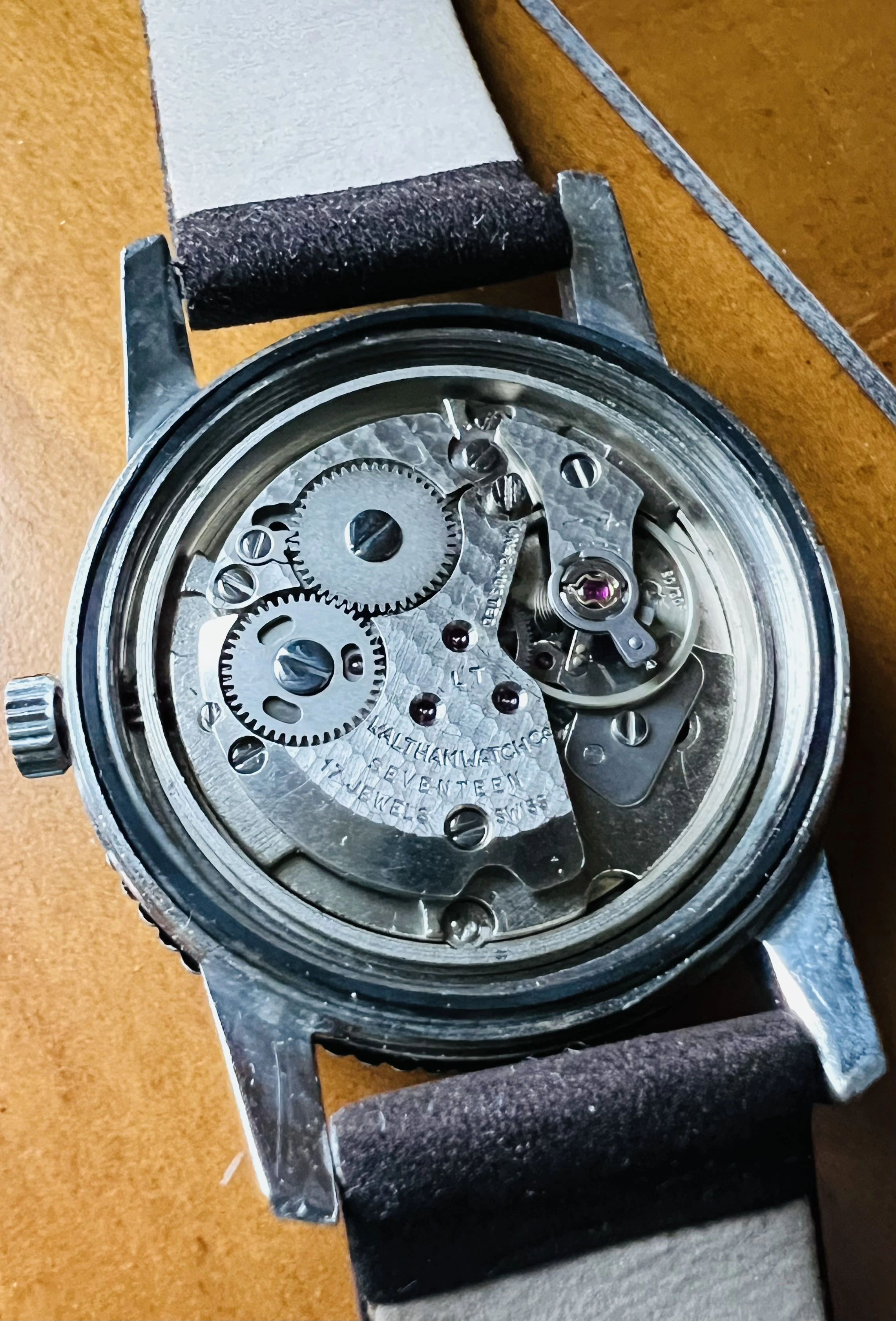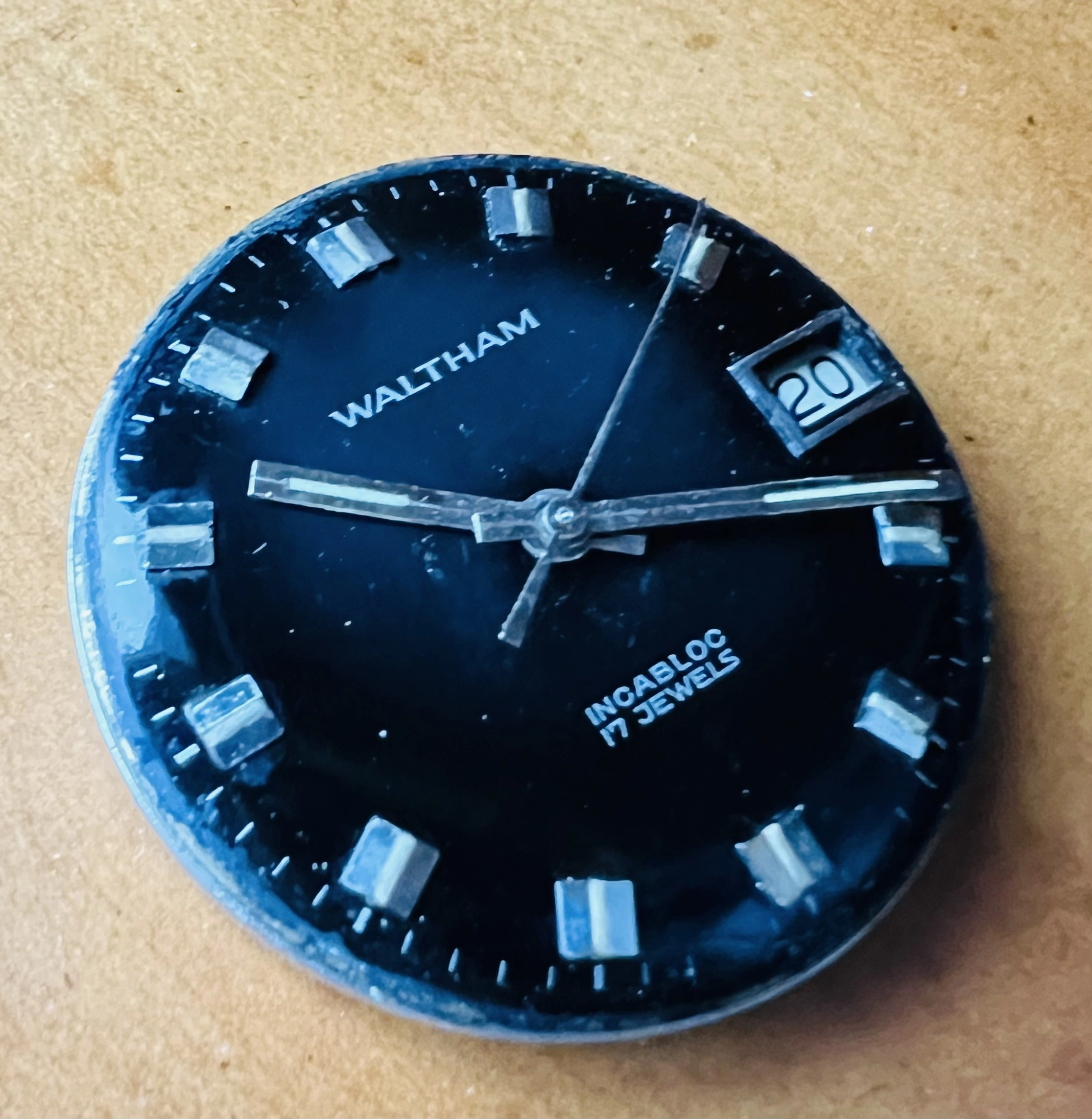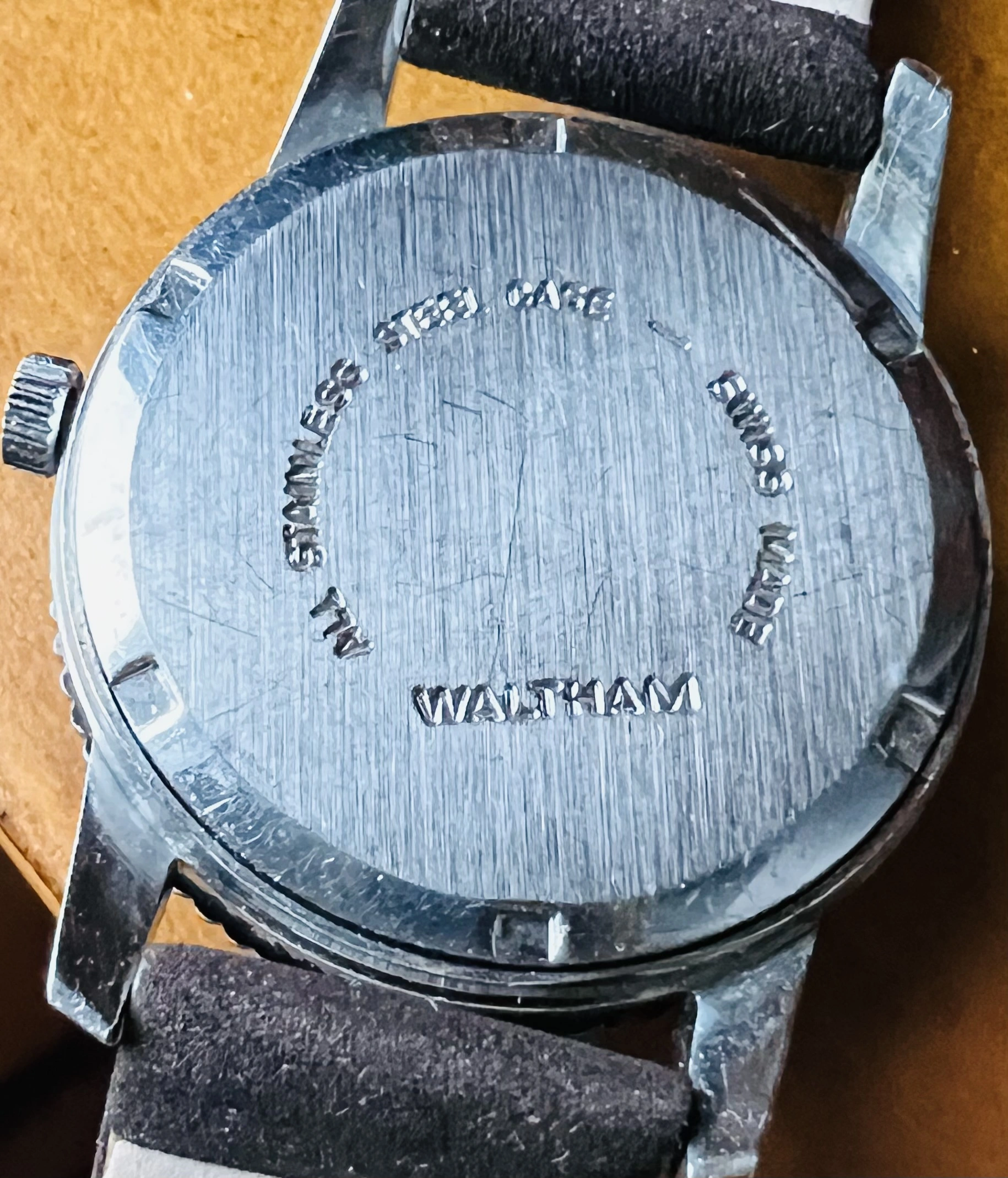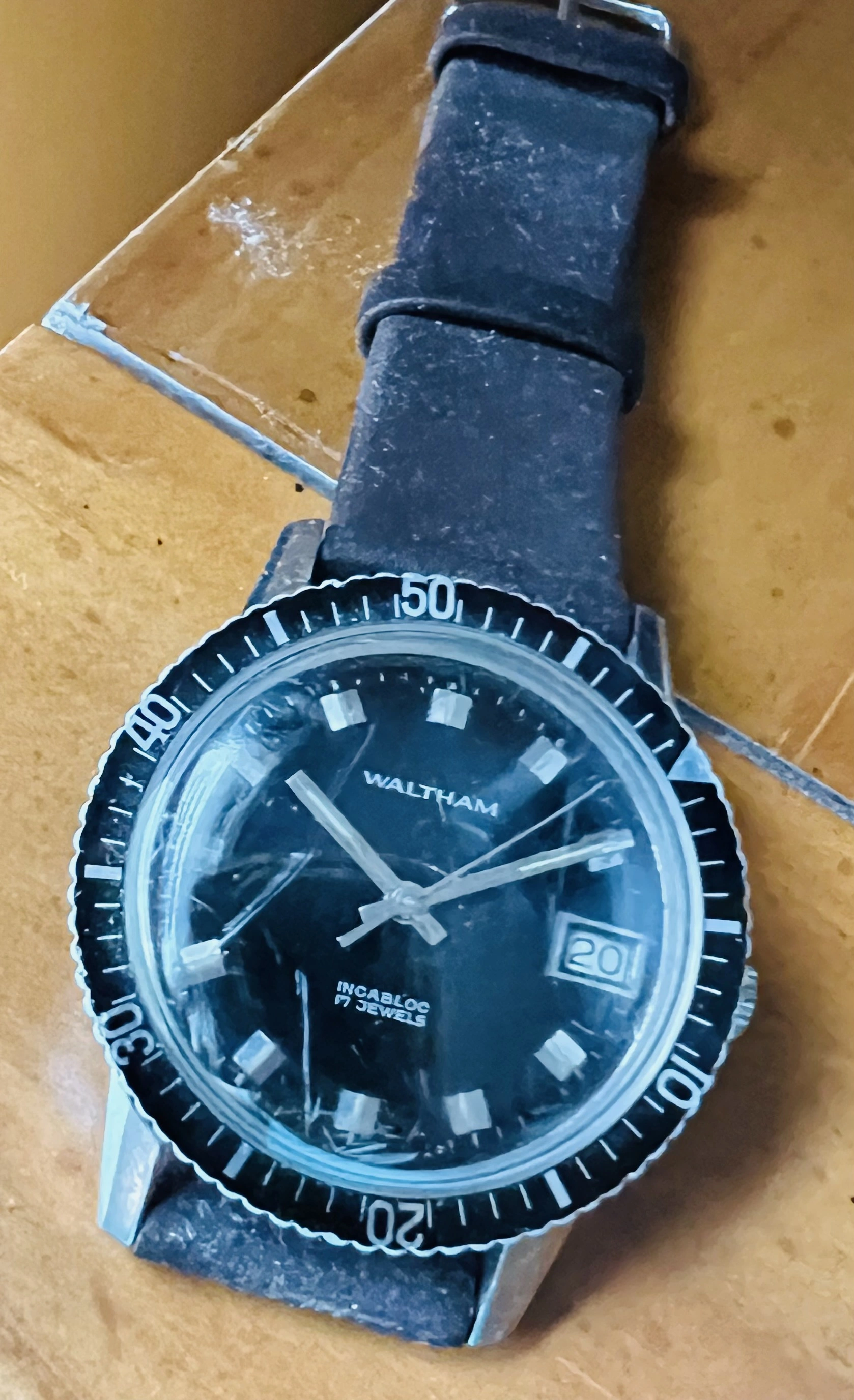 ·Up for sale is this reliable Waltham skin diver utilizing a 17j manual wind movement. The all stainless steel case is 36mm diameter with 18mm lug width and doesn’t appear to have been polished. The scratches are on the crystal as can be seen on the dial photos. The glossy black dial retains its original lume and has a mild pleasant patina. The bidirectional bezel has minimal wear. Although service history is unknown, the watch operates without issues. This would make an attractive daily wearer especially once the crystal is replaced. Price is $400 with free shipping within the CONUS. International buyers to discuss shipping.