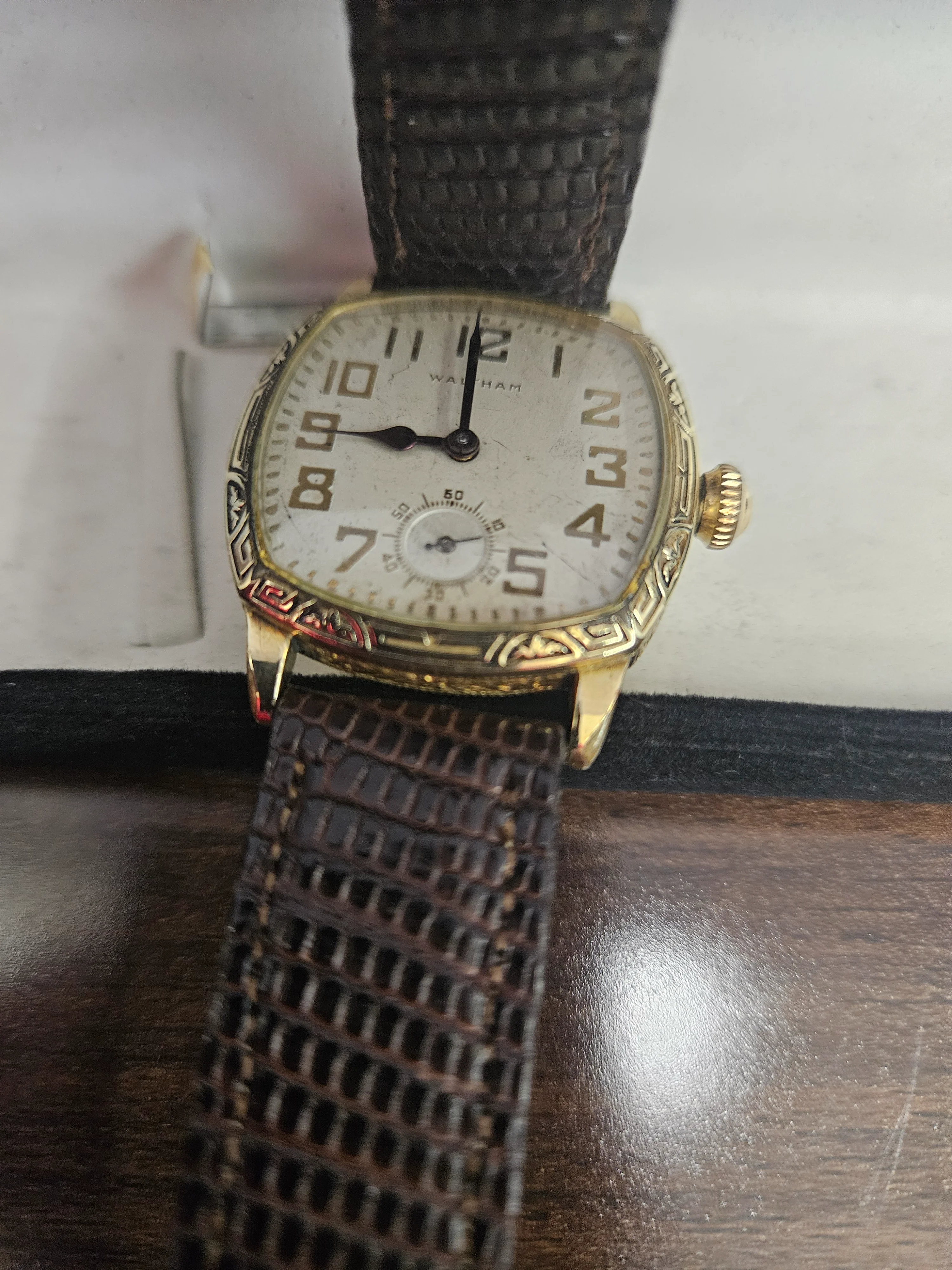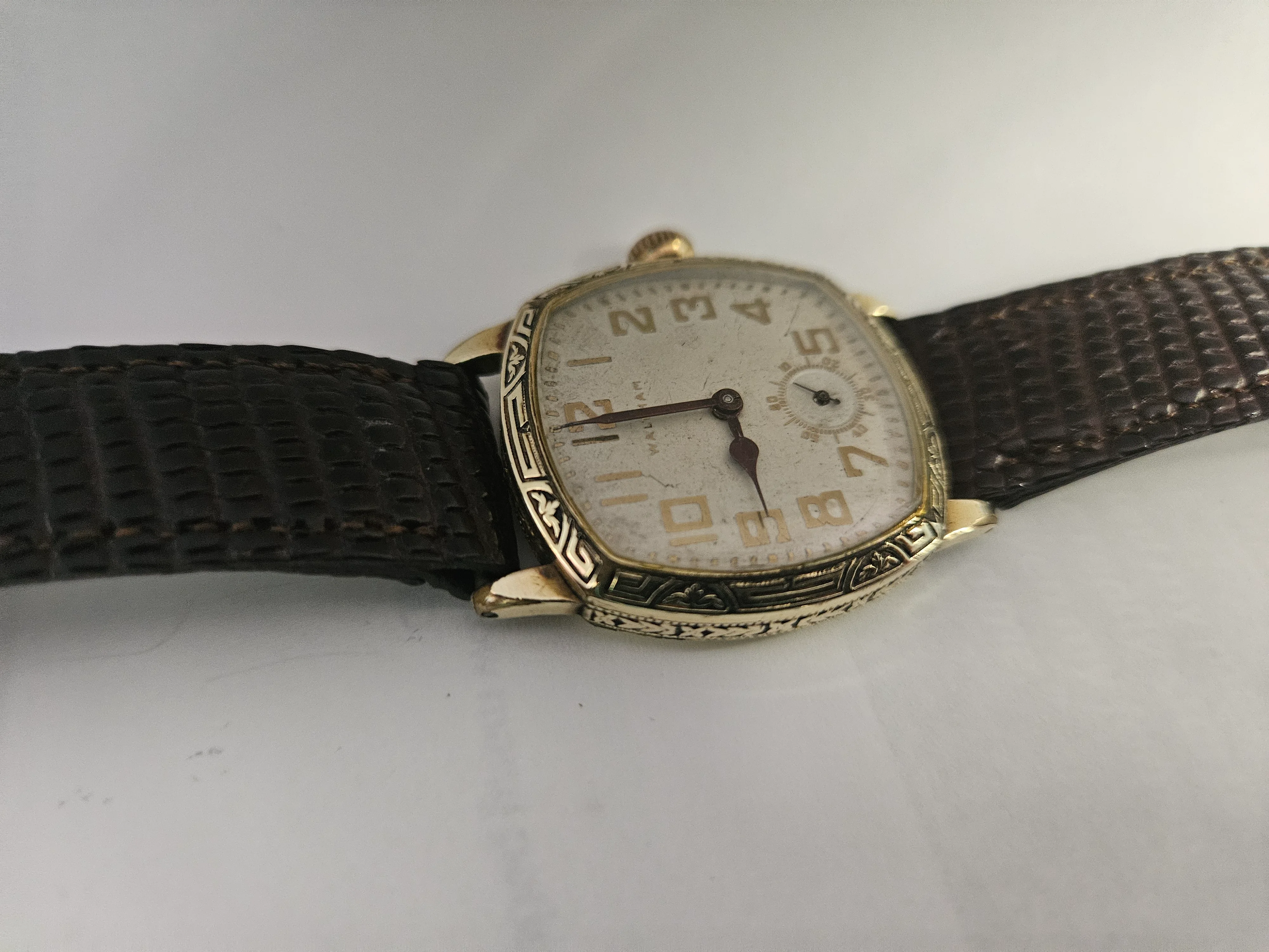 Great old Waltham you've found. These are excellent wrist watches, but do not offer any shock protection, so be careful of hard surfaces when you wear it. @gatorcpa is absolutely correct in saying that it is gold filled, you can see brassing on a couple of the lugs and the corners of the bezel. The Pocket Watch Database is an excellent resource, you won't be disappointed by it.
