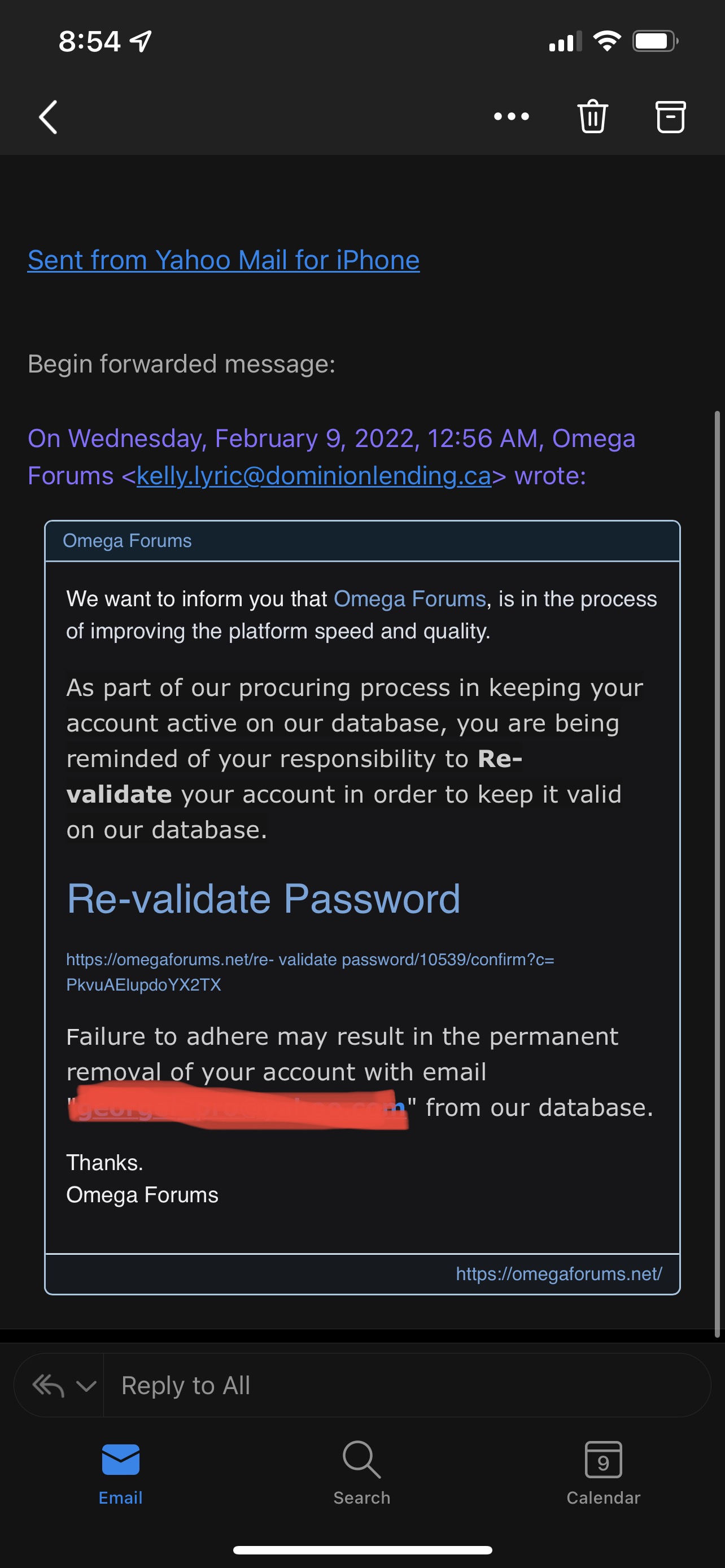 The ONLY place to ever type your password is Omegaforums.net and make sure you type it yourself into the address bar.