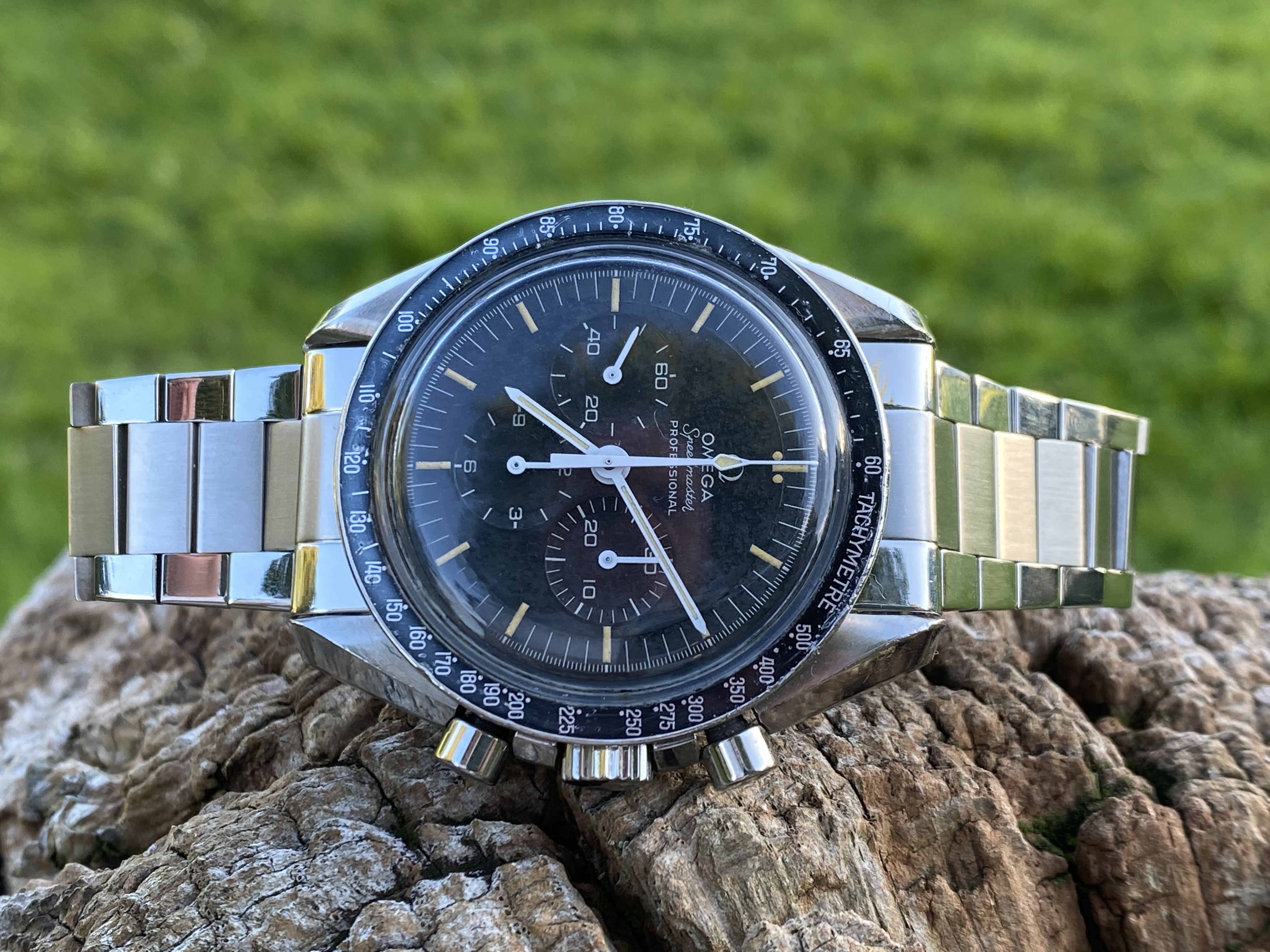 ·I like to poke fun at speedmaster buffs but it's all in good fun. Fact is we own a few of them but don't indulge ourselves into the intricacies of them. Here is one of ours that always results in someone grabbing my wrist for a closer look-see at watch shows or on 47st in Manhattan as well as the Chelsea weekend antique flea markets. It's the bezel insert that stirs them up and then the band.