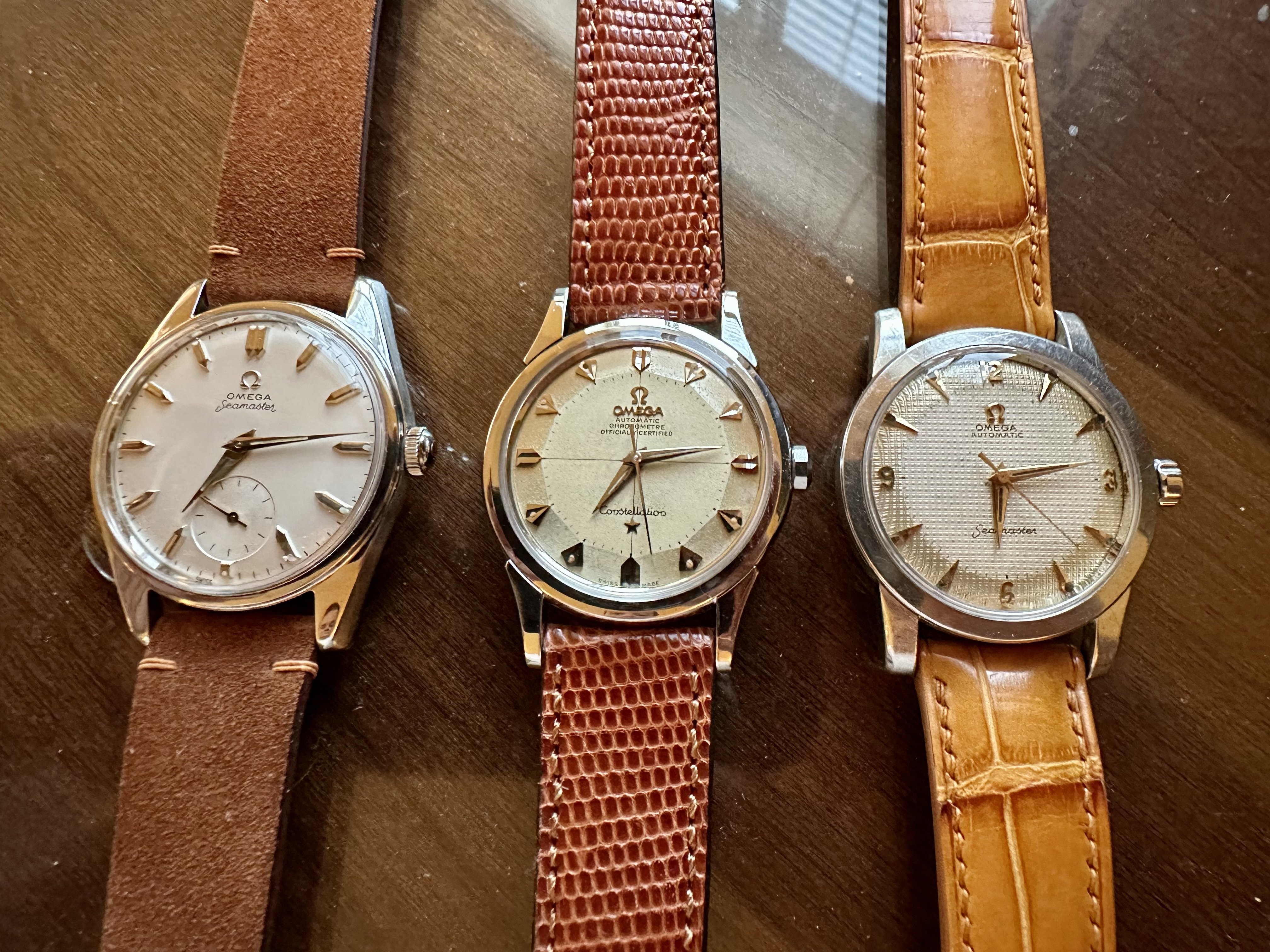 From left to right: Seamaster “Seachero” 2990, Constellation 14381 and a Seamaster 2577 with a two tone hobnail dial. 🥰🥰🥰