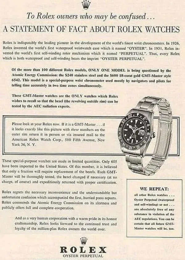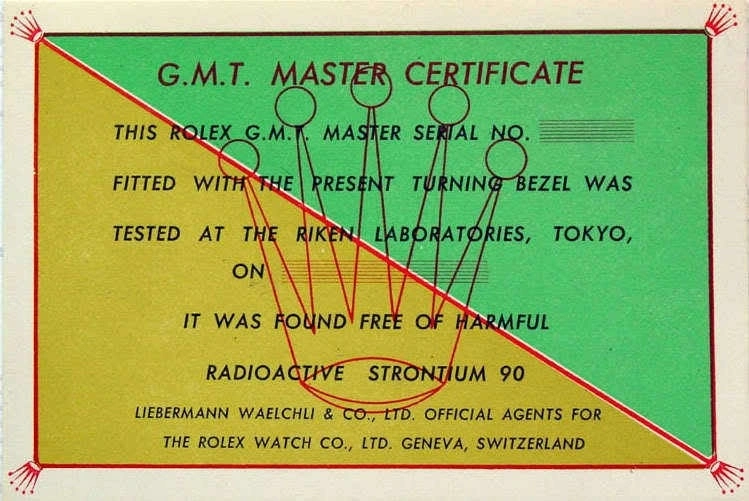 ·While I was sifting through general watch sites , one particular site I accidentally found had the following image of a certificate issued by Rolex claiming that it tested the bezel to be free of Radioactive Strontium 90 ( another deadly calcium tracker like Radium)