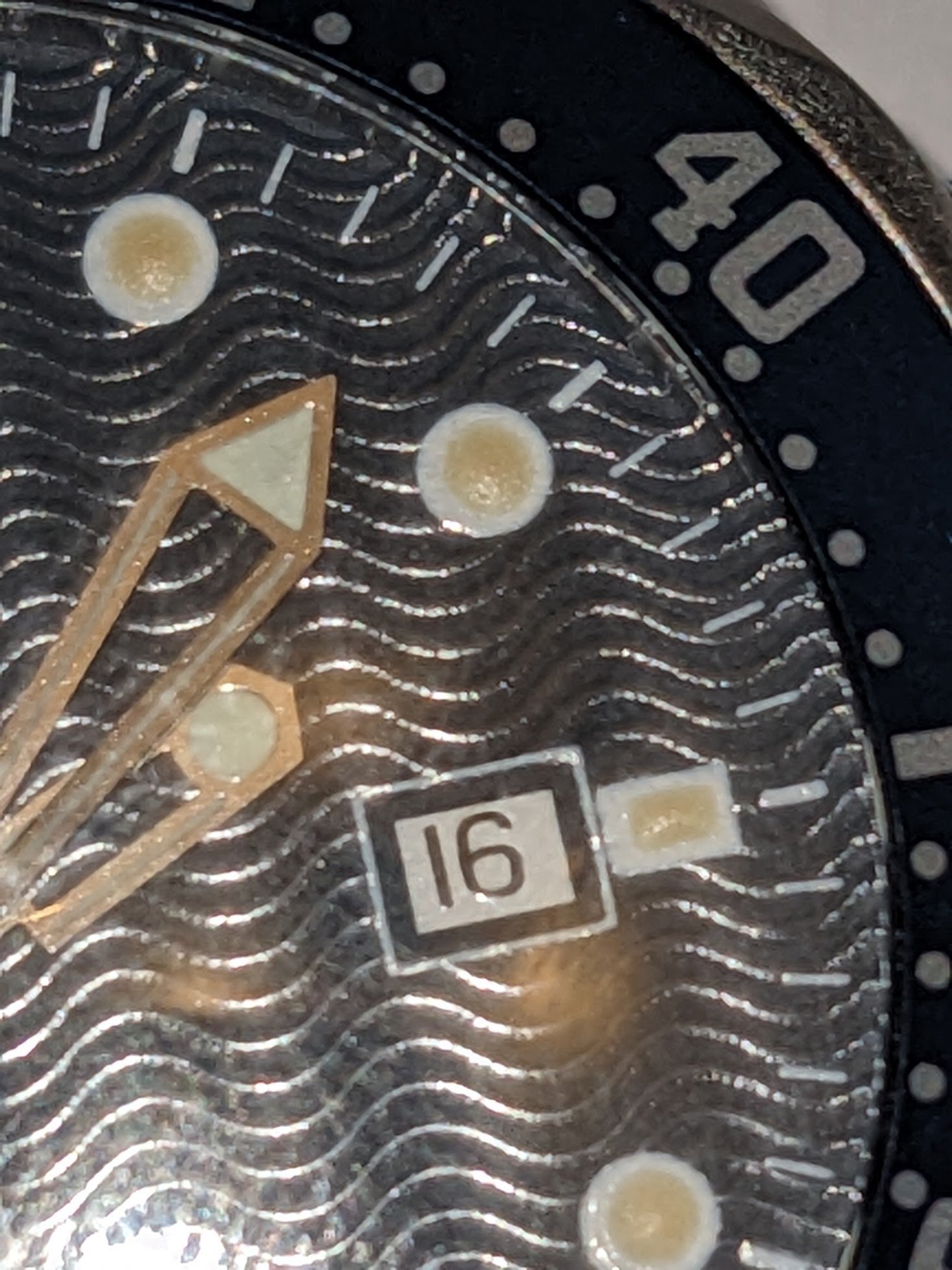 I'm not sure if it may have had a dial replaced. Its Luminova has a patina, as expected for a 20+ year-old watch. It is very bright for only a few seconds after using a UV light, fades almost entirely within 10 seconds, and basically nothing left after a minute.