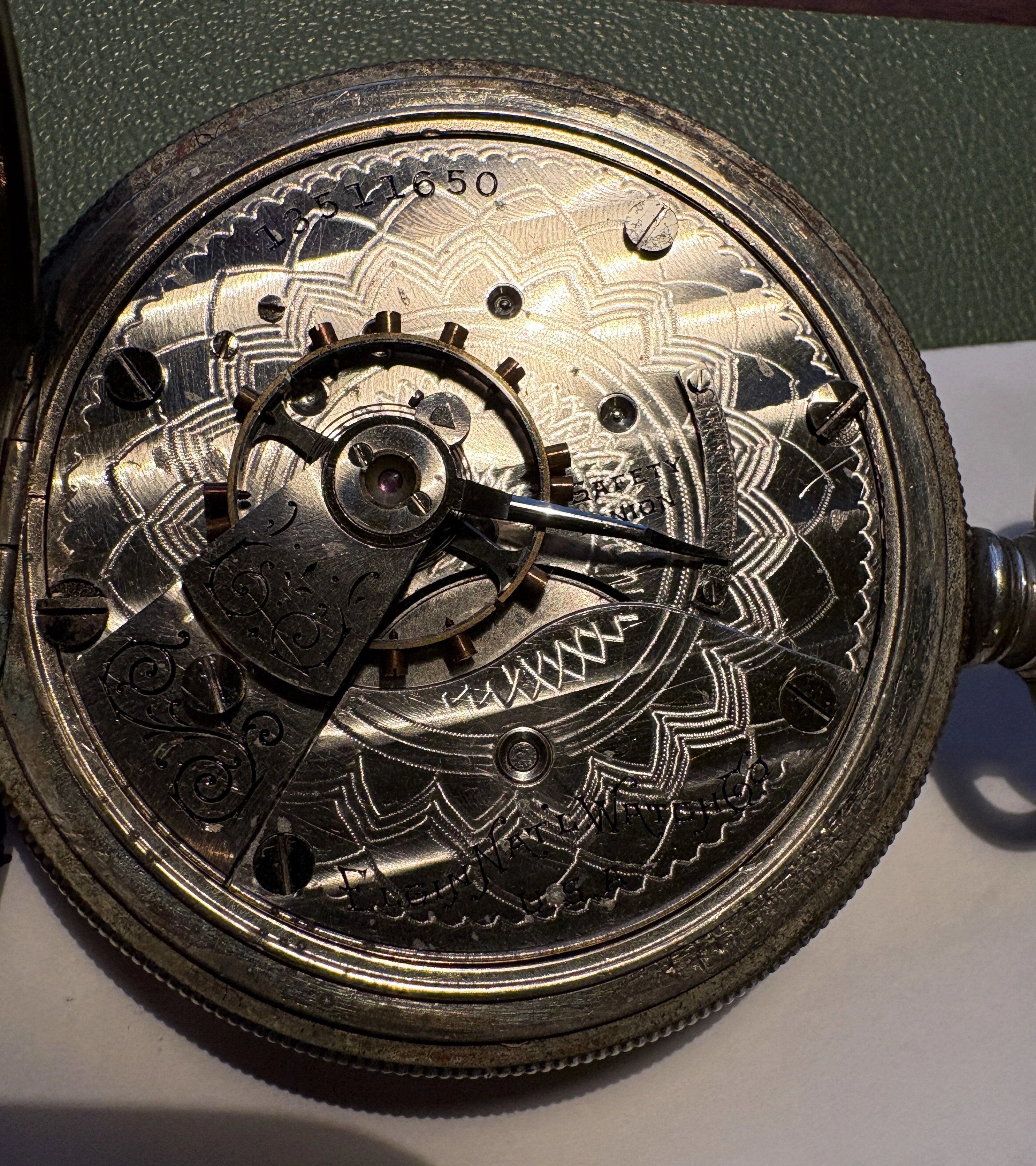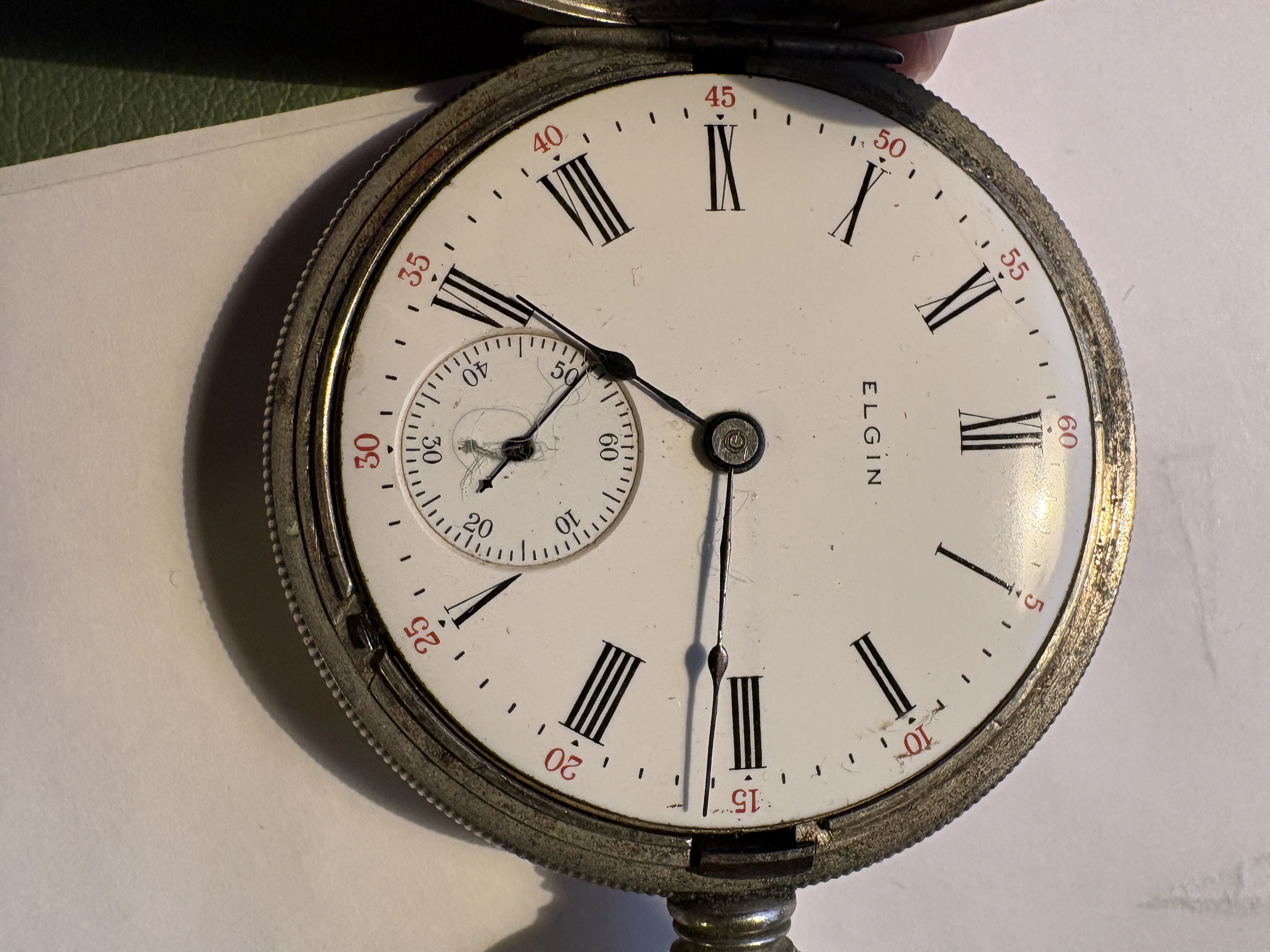 Oh, the Elgin. It's a size 18S, grade 287 from 1909. Seems to be a mid-grade watch, all there and in good cosmetic condition, but wound tight and not running. Maybe someone will want to fix it up. Let me know and I'd be happy to send it along.