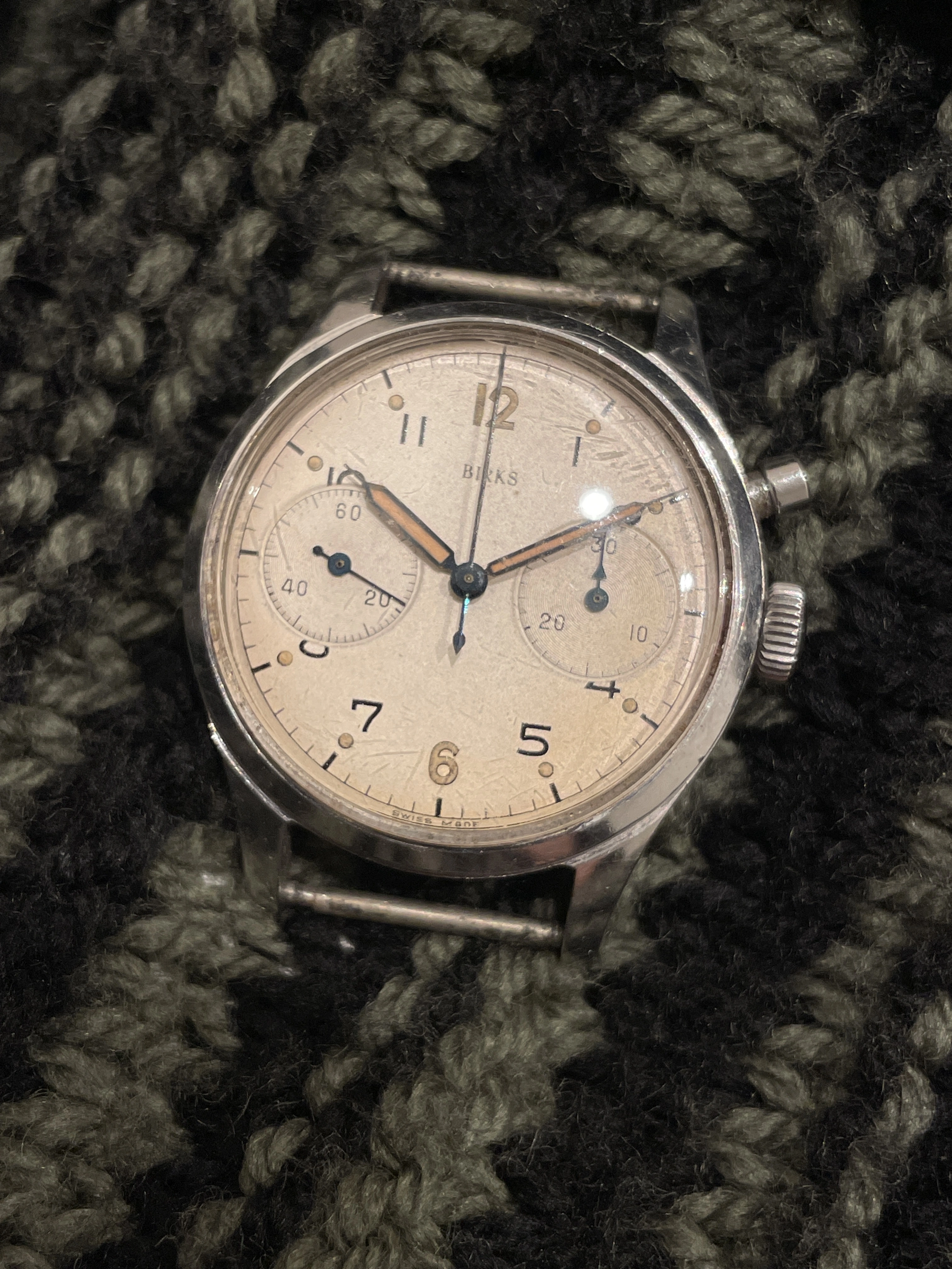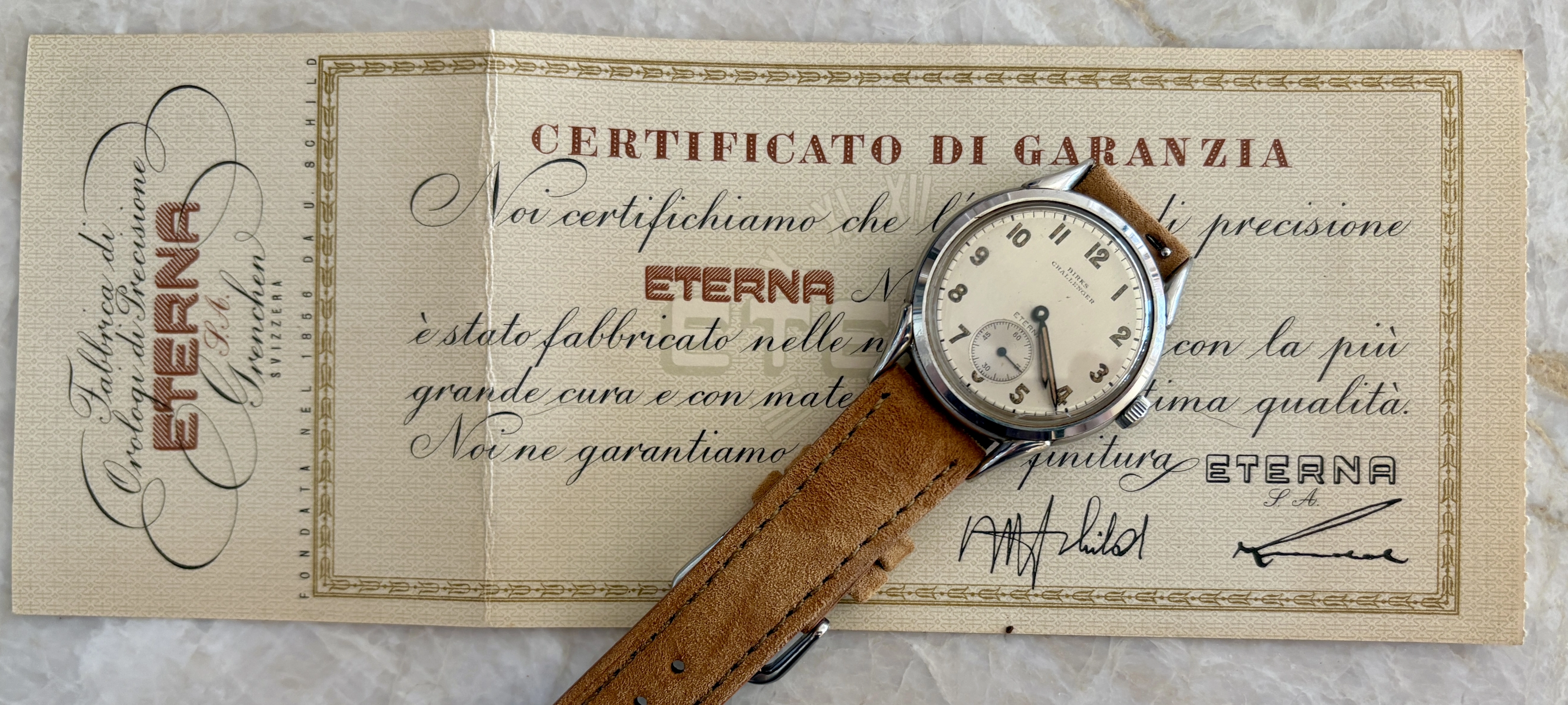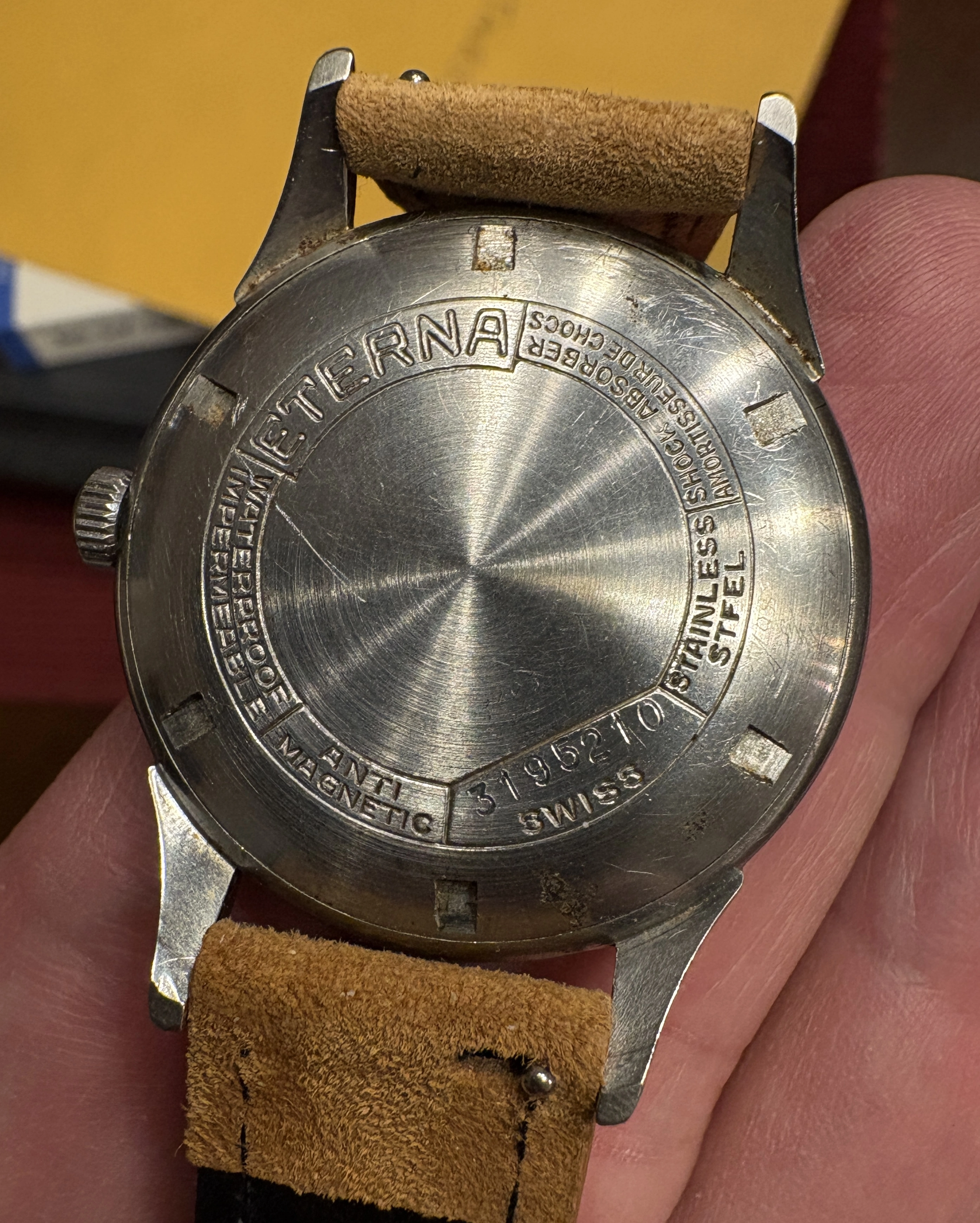 Pretty exciting paperwork: JLC, Movado, Titus, Eterna, Citizen. So I zoomed in and ... crap, nothing. Oh wait, what's that at left? Looks like "Birks" (i.e. the Canadian Tiffany), and down below the pinion a barely visible "Eterna"! The lot was listed at the auction house that sold no watches, mostly furniture, so this was probably just part of an estate. Nothing in the listing about the watches at all. The Eterna looked good to me at first glance. I chatted with @Tony C. about it, and he also liked it (many thanks, Tony).