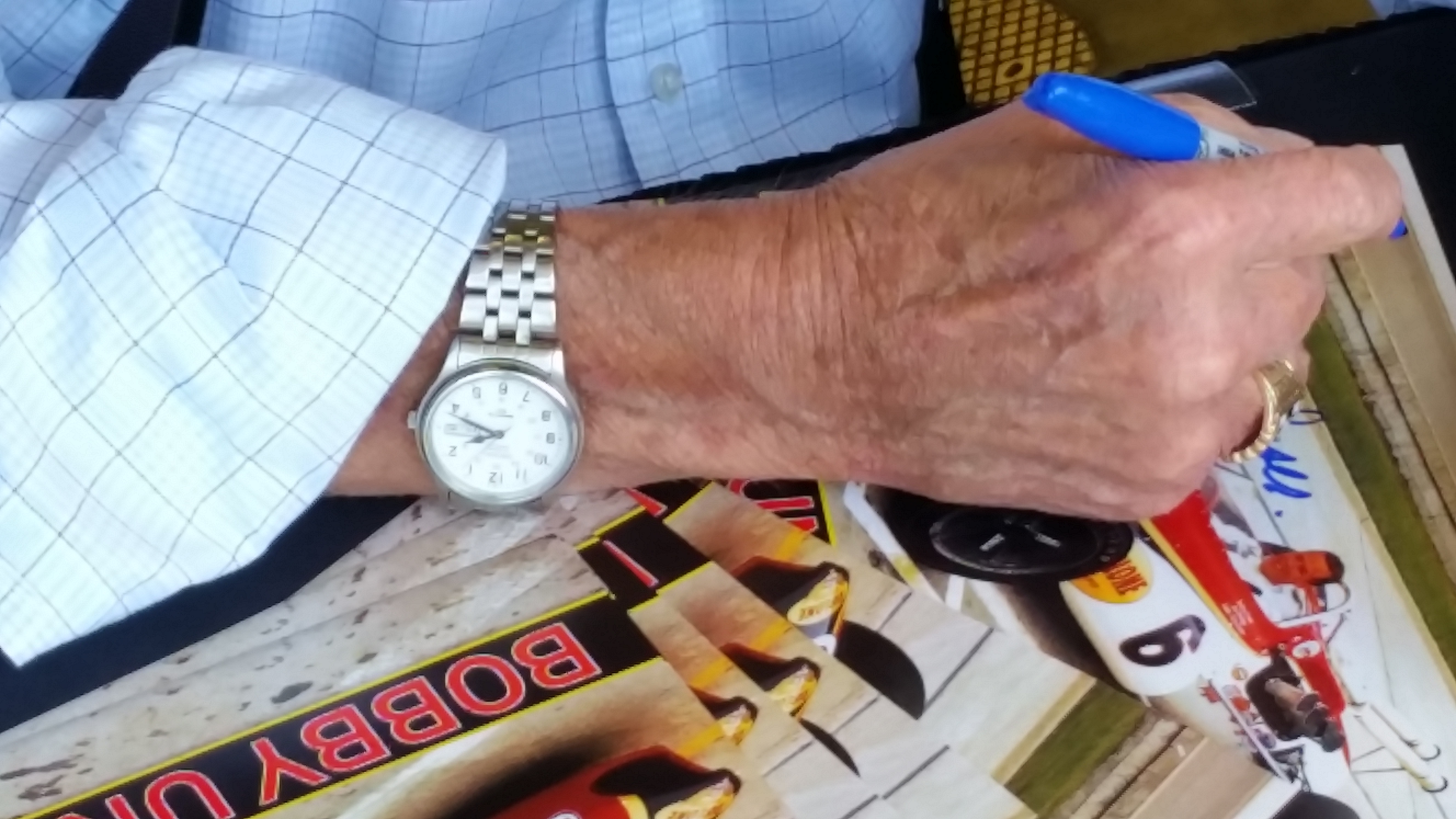the gentleman in the blue shirt is racing legend Bobby Unser. I couldn't tell what he was wearing looks like a Seiko.