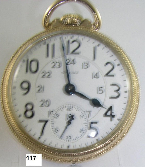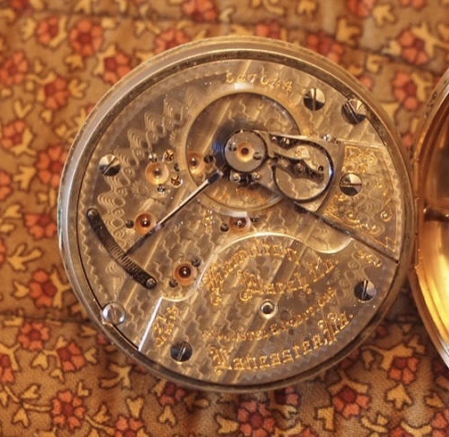 Hamilton, 18-size, grade 944, 19 ruby jewels, adjusted to 5 positions, lever set, double roller, full plate, jewelled motor barrel arbor, patent Goldthwaite regulator, double-sunk vitreous enamel, 24-hour dial, Canadian made gold filled case, made circa 1906. Made by the Hamilton Watch Co. of Lancaster, P A. This was an era before watch manufacturers over-used the term “limited edition”. There were only 6,590 grade 944 Hamilton’s made. Its brother, the Hamilton grade 940 was probably the most popular 18-size railroad standard pocket watch produced by Hamilton, but I like the 944. If this watch had been fitted with a Hamilton marked dial rather than the name of a Canadian retailer, it would have been snagged long before I got to it.