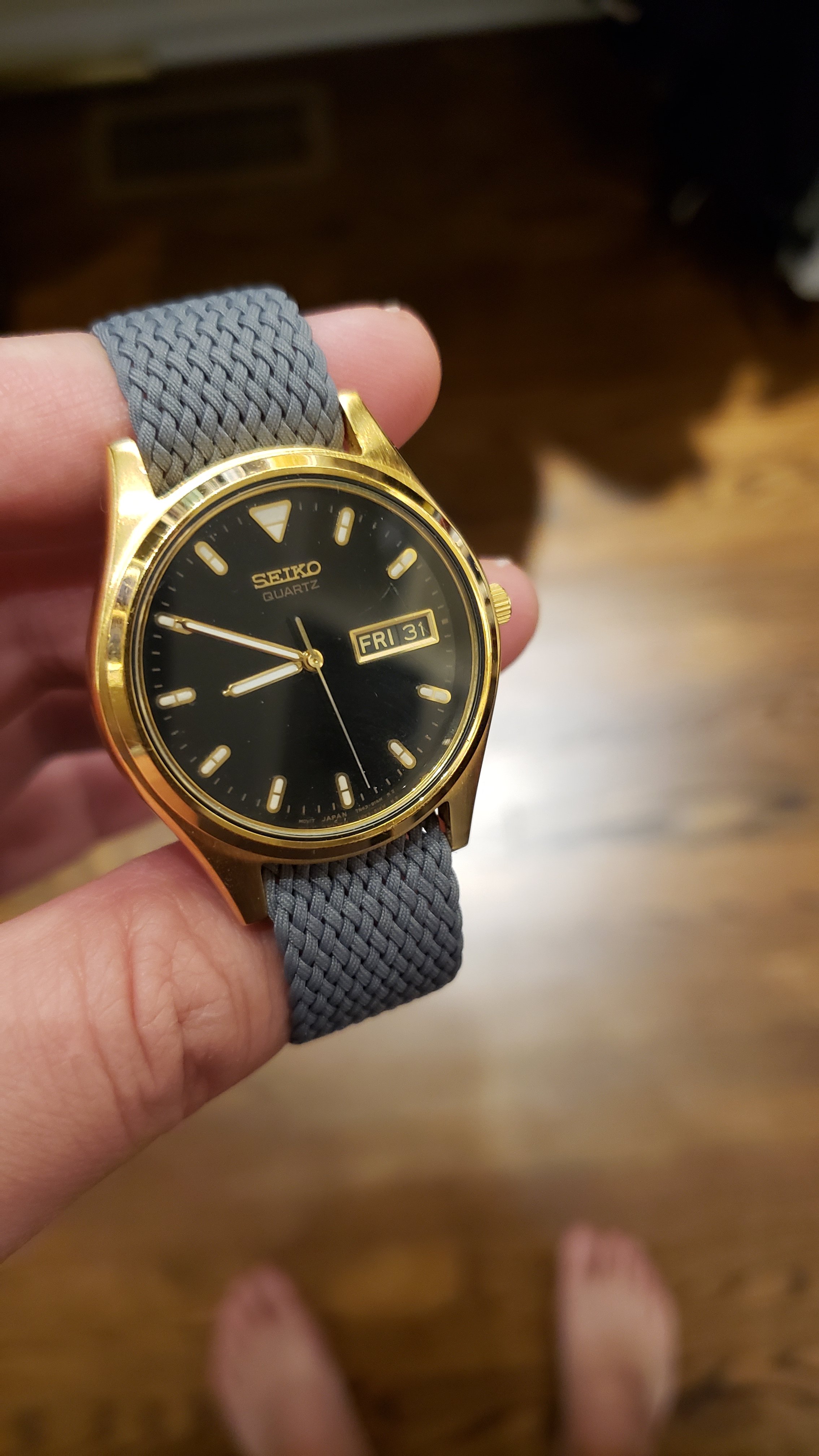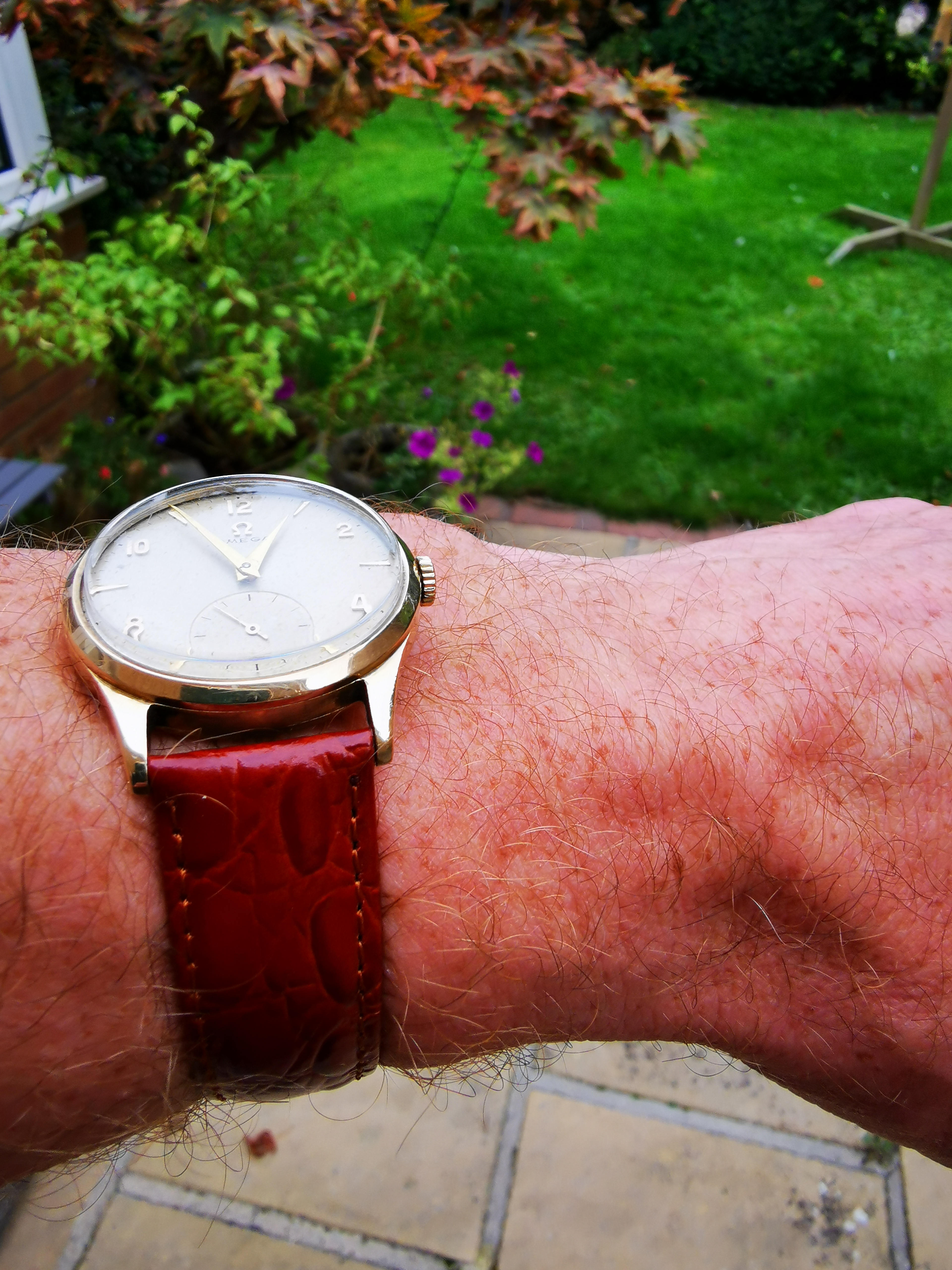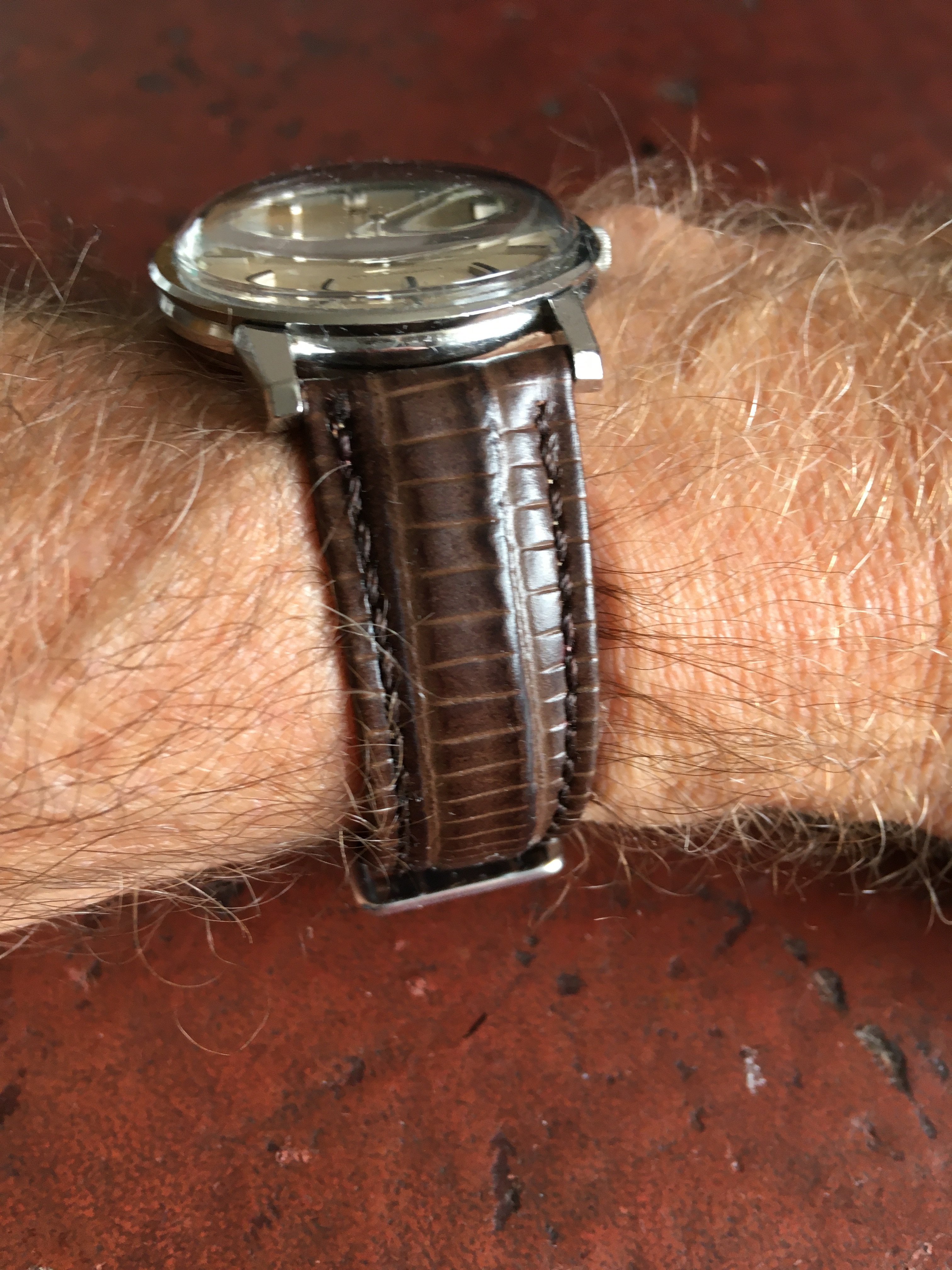 You could fit a leather strap of any colour to this watch. Personally I’d go with a honey brown as it would match the tone of the watch