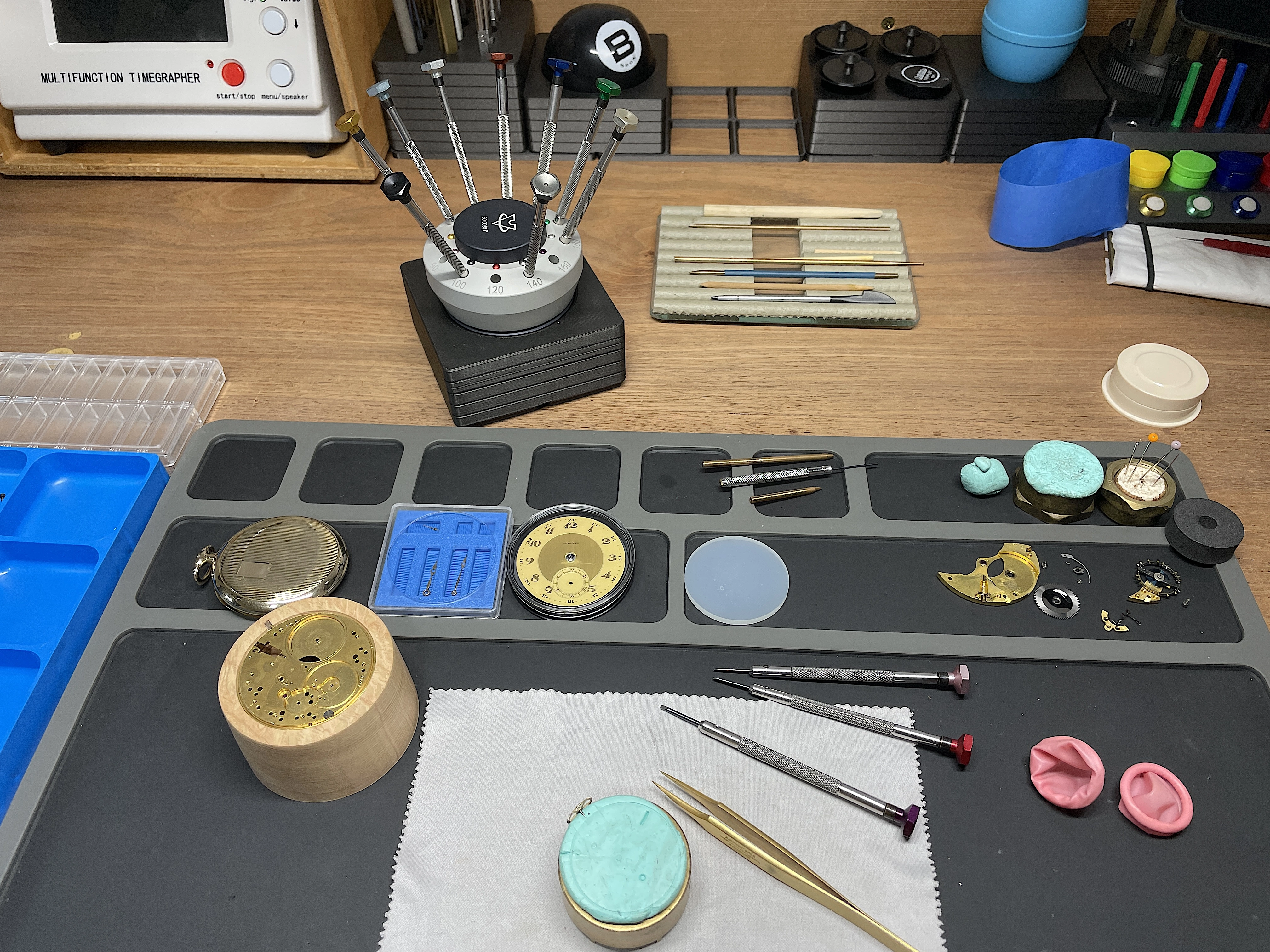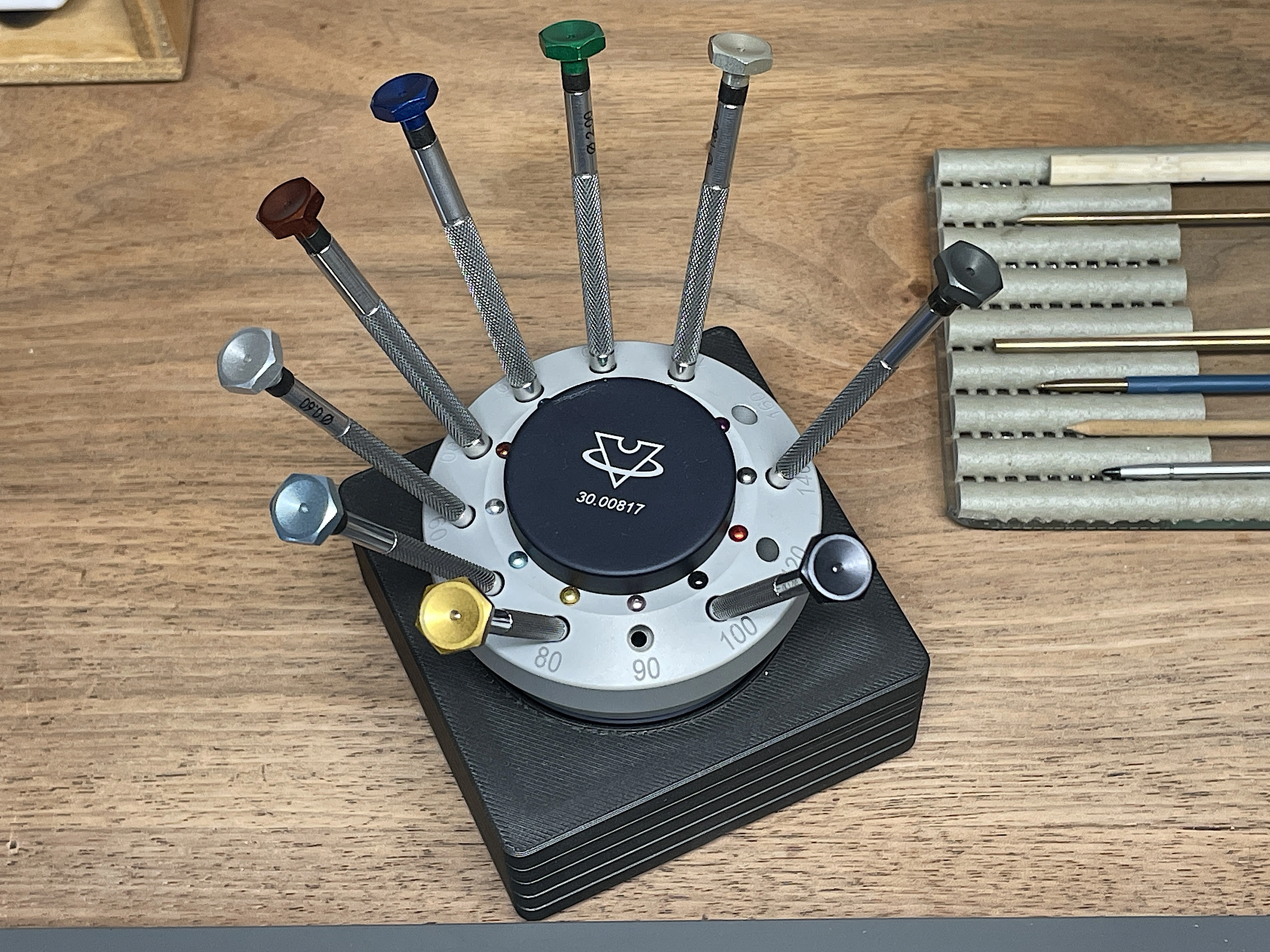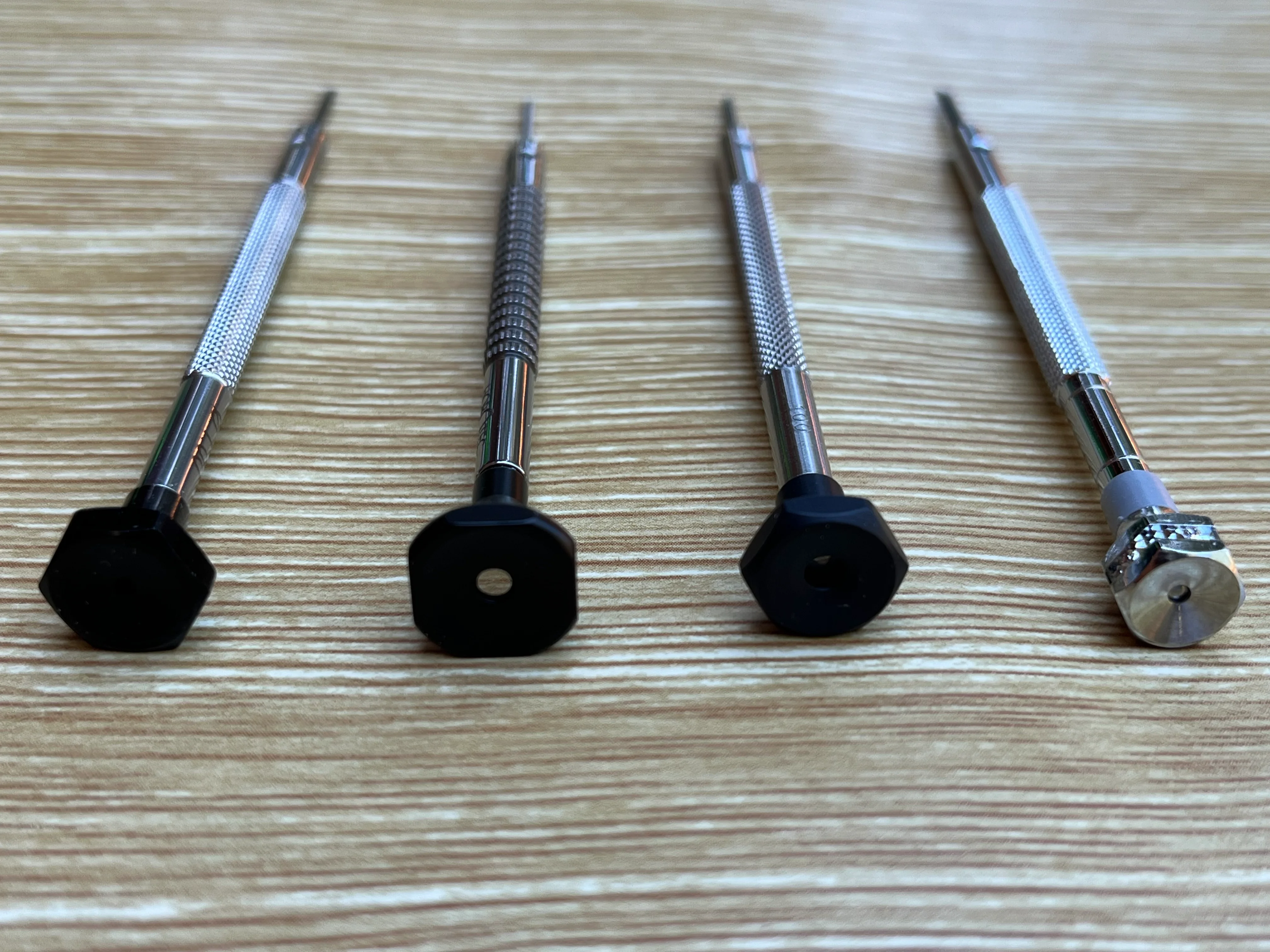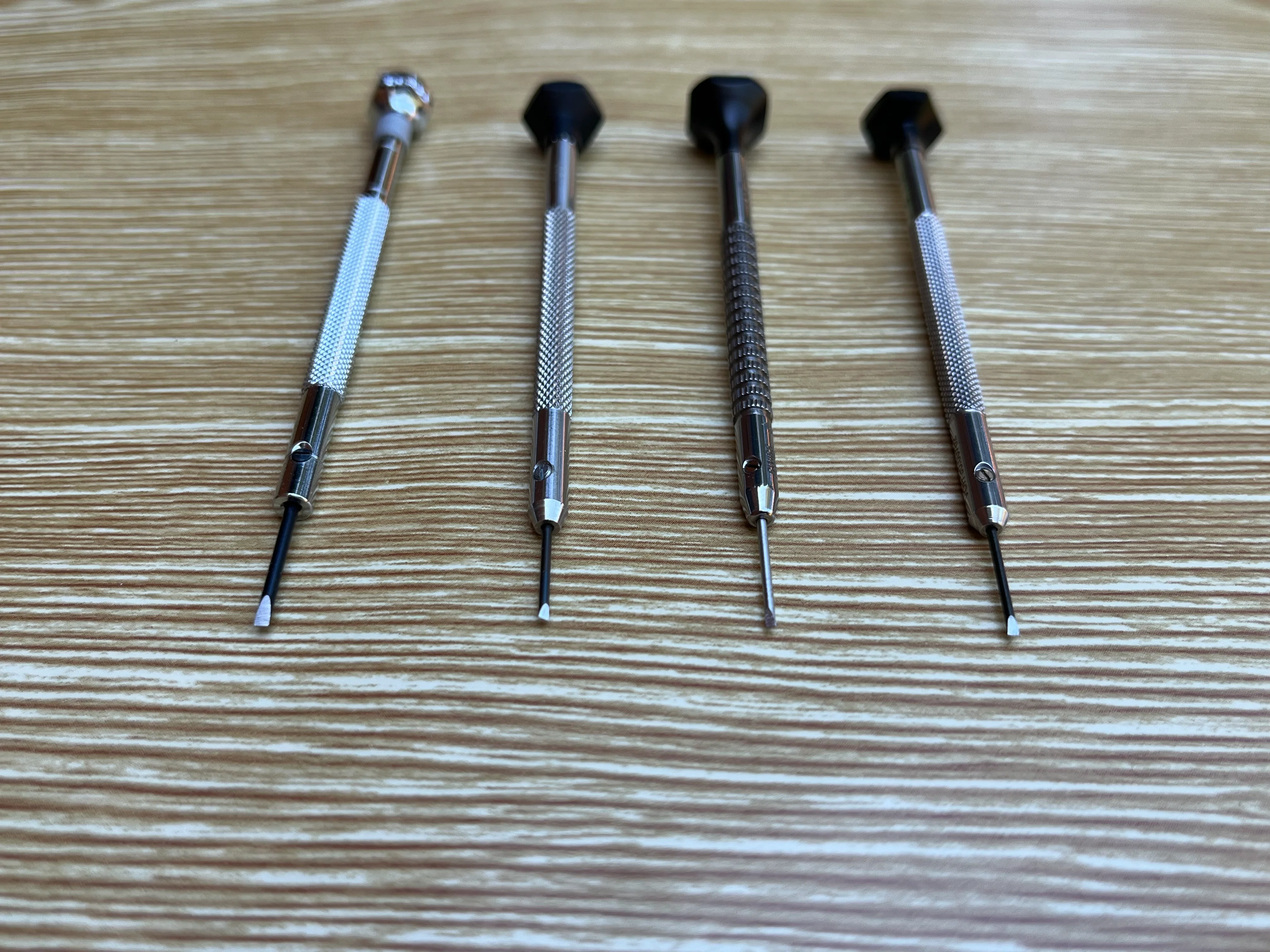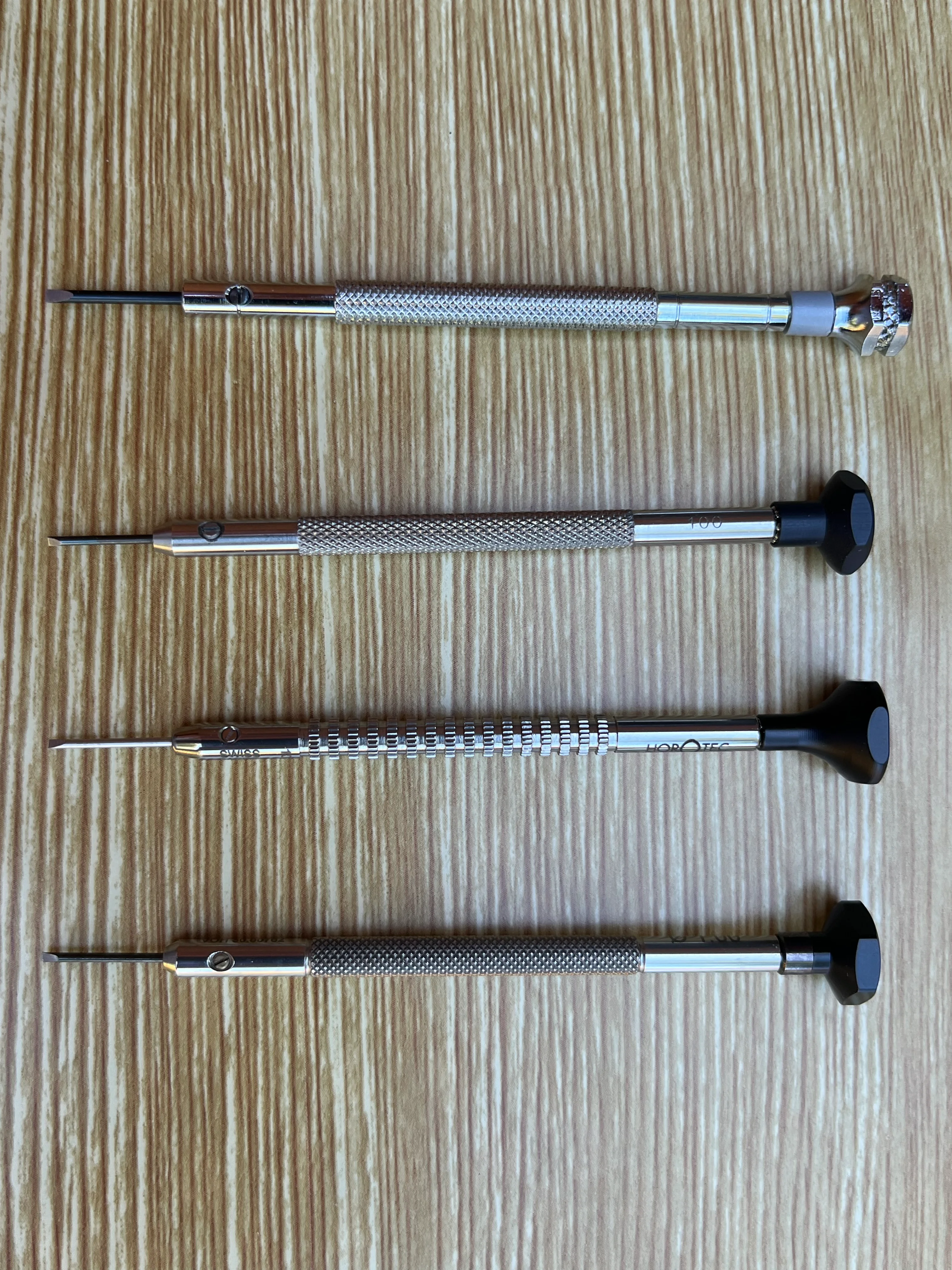 Here are the 4 screwdrivers to show the differences between AF Switzerland (France) design, old stainless steel Horotec with ball bearings, new stainless steel special knurled Horotec with ball bearings and VOH - also stainless steel, ball bearings. AF Switzerland is size 1.40 with the grey plastic band at the top. Old Horotec is next to AF Switzerland, new Horotec is between the old Horotec and the VOH.