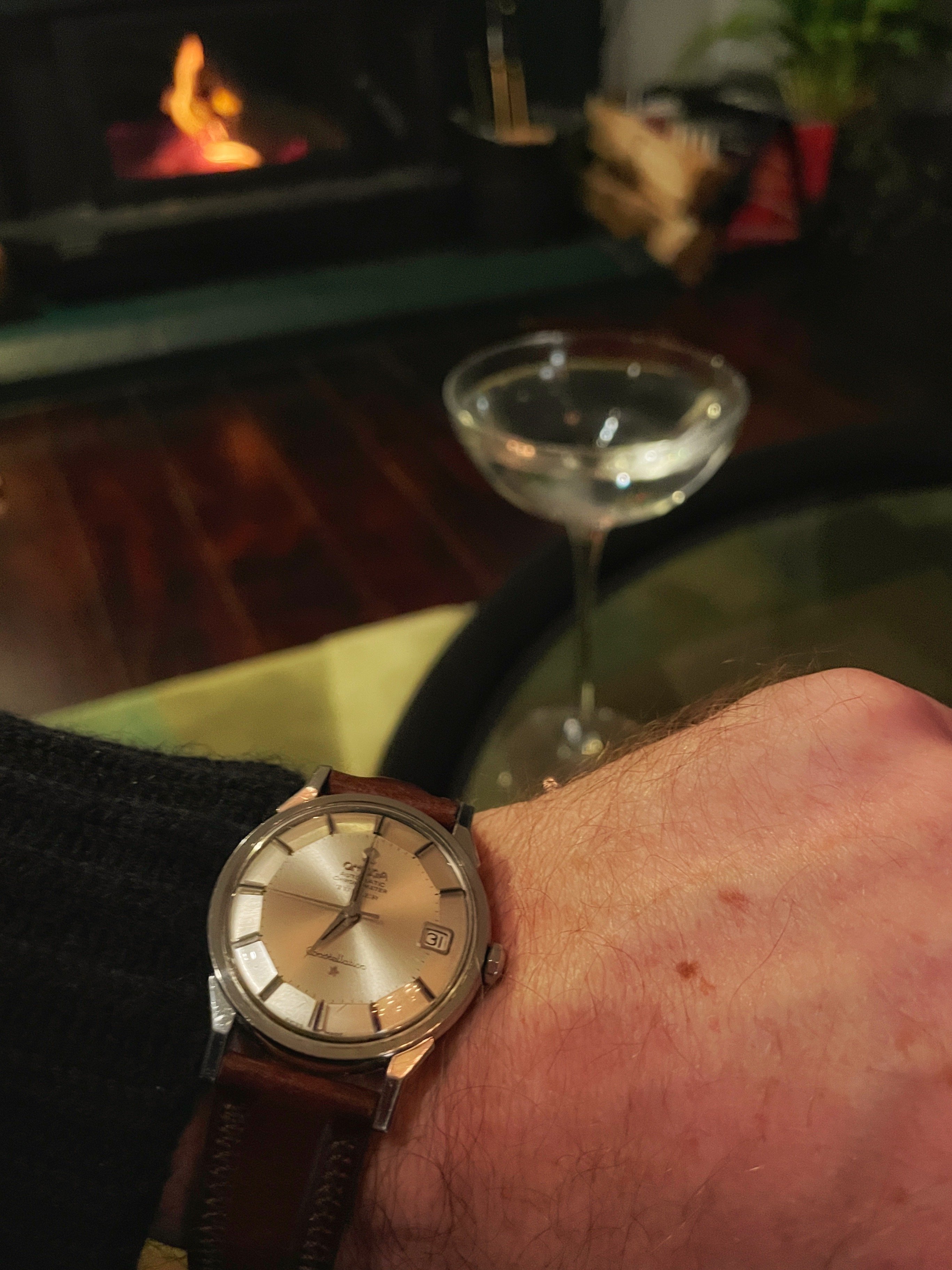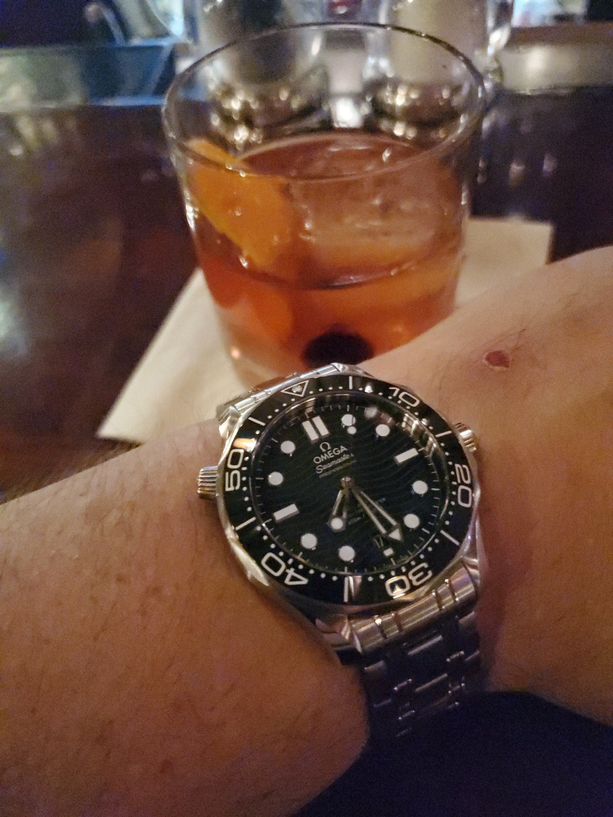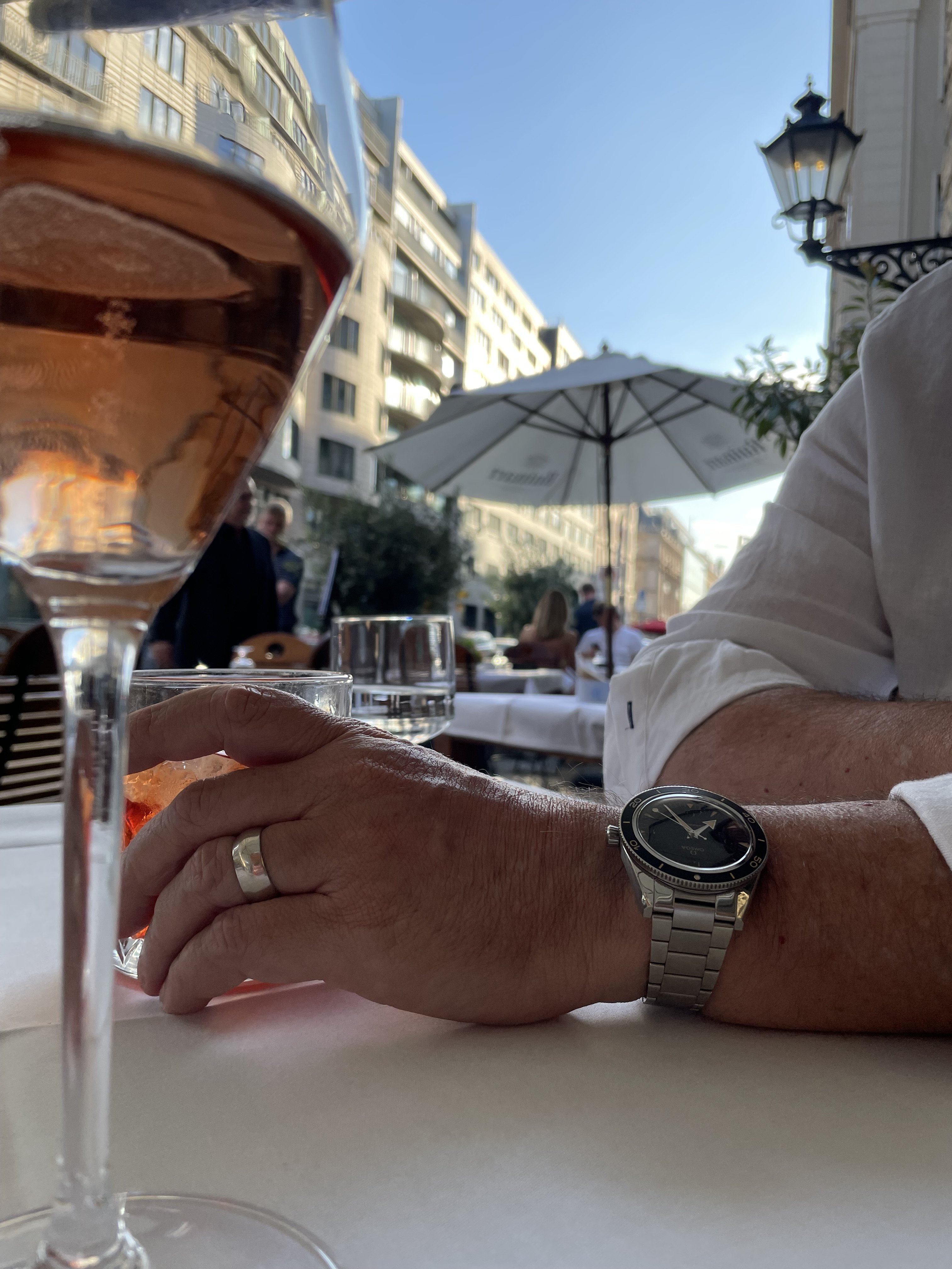Although it’s not my favorite, I’ve been enjoying Negronis recently. My wife snapped this photo on our recent trip to Berlin. Me, my Seamaster 300 heritage, and a nice Negroni. She was enjoying a Kir Royale.