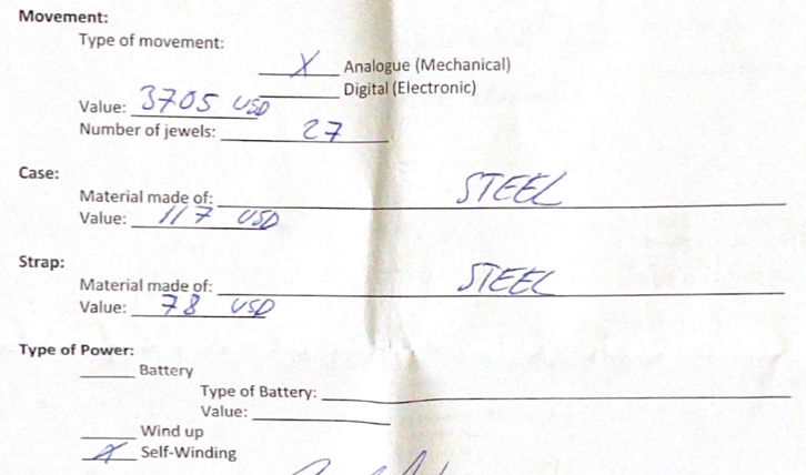 And for reference, here is a section of the customs form, filled out by the seller, showing the breakdown of values on a watch I imported into the US.