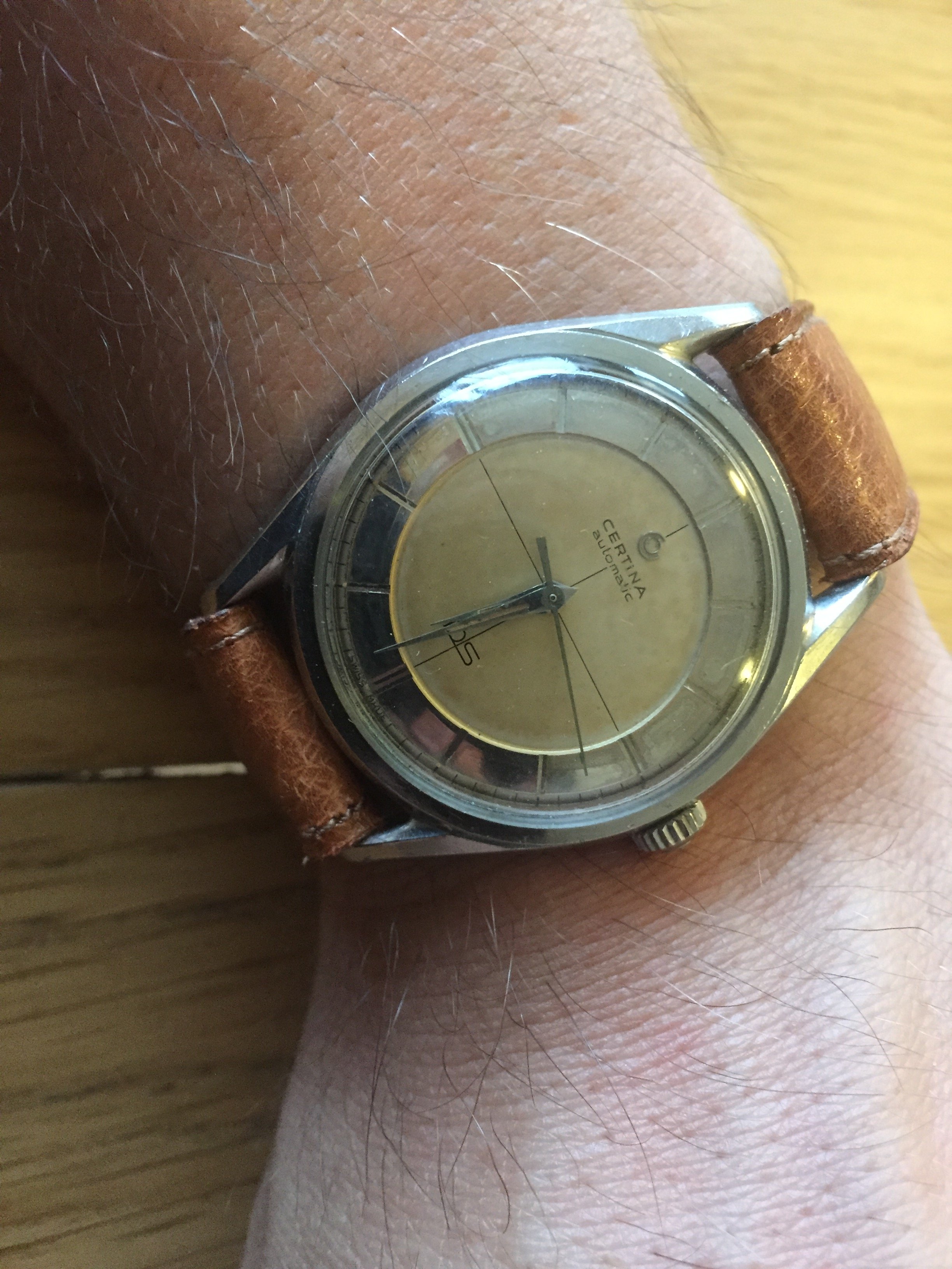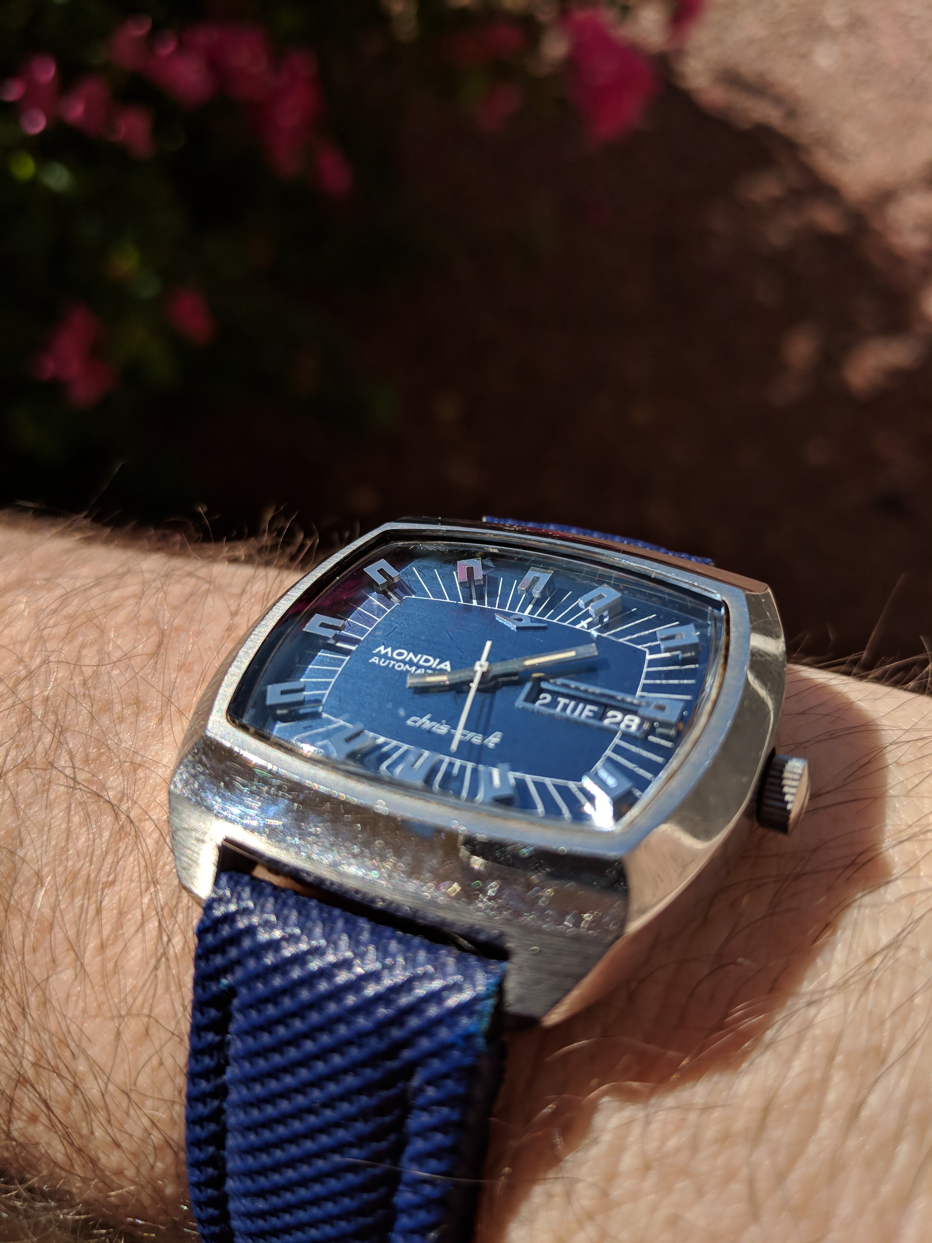 So this is one I picked up for $35 on ebay, probably 5 years ago or so. It came with the original bracelet too, but I swapped it for a blue strap that complements the face. This is from the same period when Mondia was part of MZM - Mondia, Zenith, Movado, although the movement inside it is an A.Schild. The indices are all three dimensional, and the blue of the dial is one of the best I've seen. When I got this there were no references to it elsewhere online. Now if you google it there are a couple, mostly out of Europe, but none in blue. I'd be surprised if there were more than 20 of these around based on what I've been able to find.
