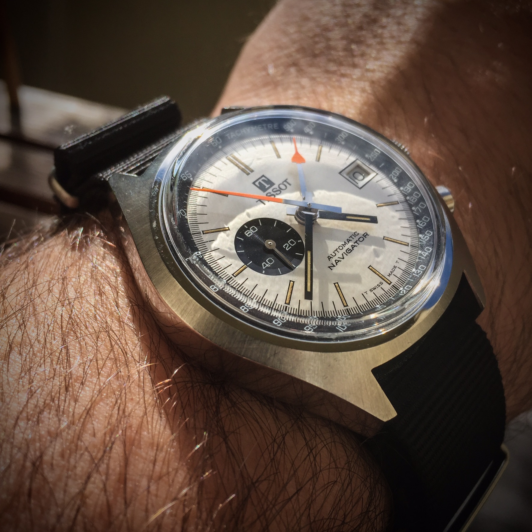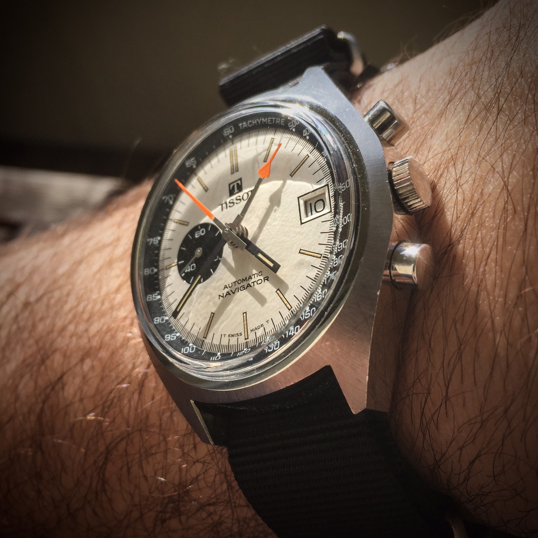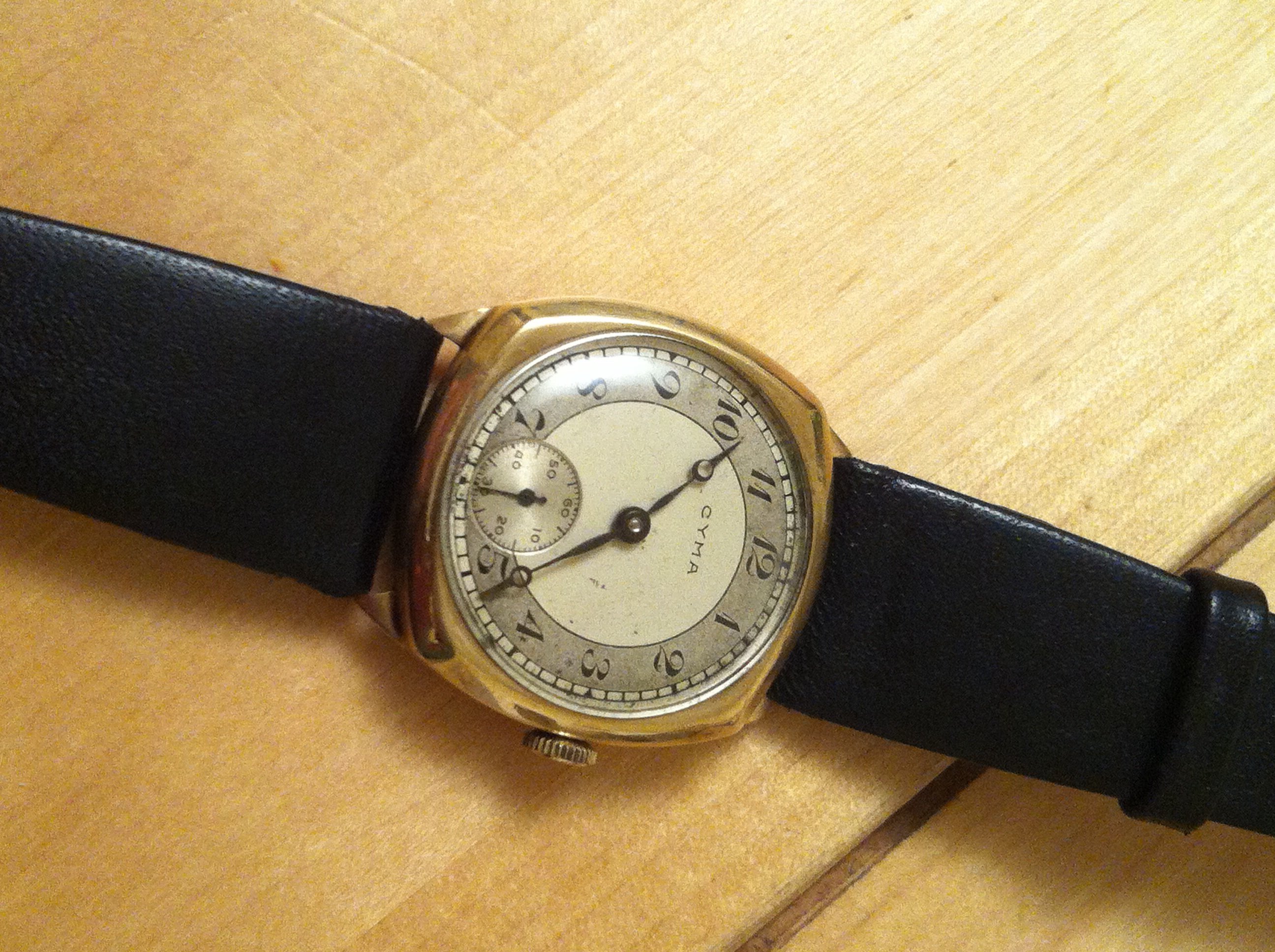 30's Zais (Breitling..Venus movement) bubble back Chronograph..allegedly used by the Italian airforce. I don't wear it at all much as the dial is painted slate and the watchmaker really couldn't fix the slight rattle of the movement inside the casing. I bust it last time by clapping my hands in front of the class too hard!!