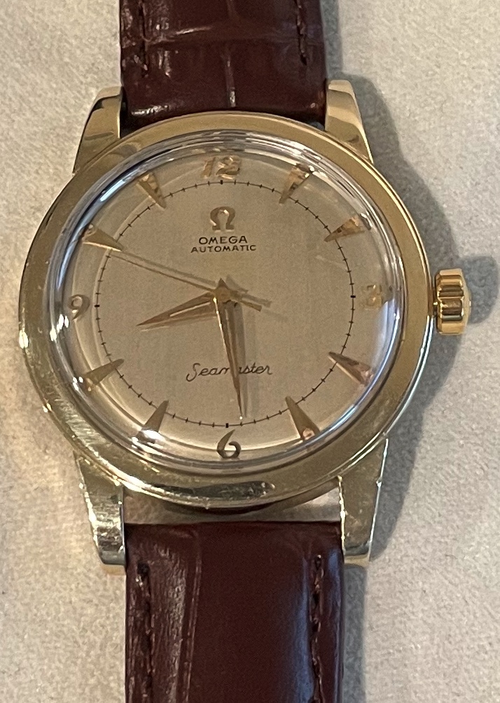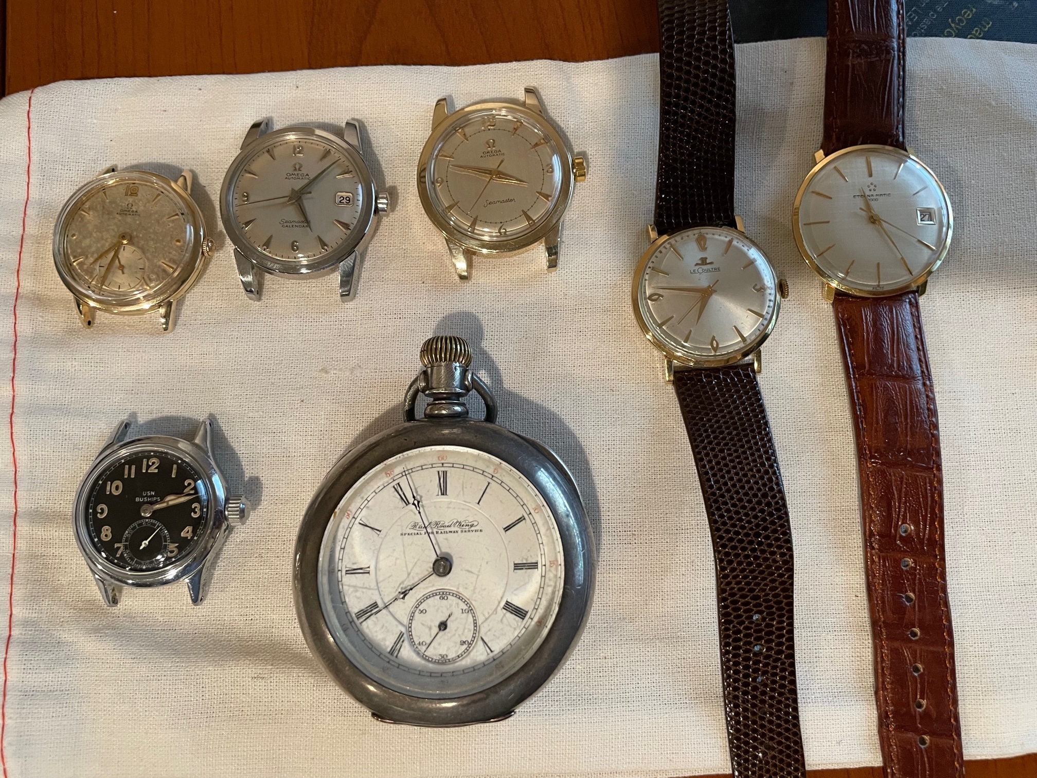 -Gold bumper, stainless automatic seamaster calendar, gold automatic seamaster, le coultre, eterna matic, us navy buships, and some crazy one of 200 wilson brothers railway pocket watch. All just serviced, now just sitting on my desk ticking away...