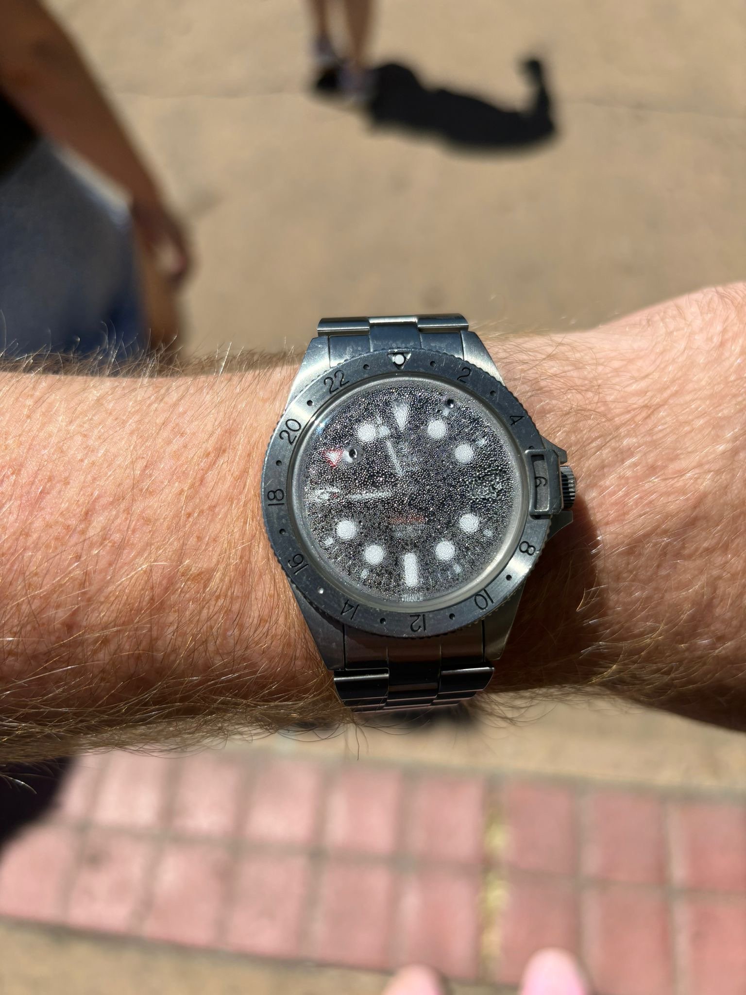 Dear OF members, I have a spot of a dilema and maybe someone here can point me in the right direction. My 21yo son has just started his Erasmus placement at the University of San Diego, arriving last week, the weather there is somewhat better than it is here in the Emerald Isle and has been taking full advantage of the outdoors swimming facilities, unfortunately it appears that he did not properly screw down the crown of his Yema Superman heritage GMT and now it looks like this