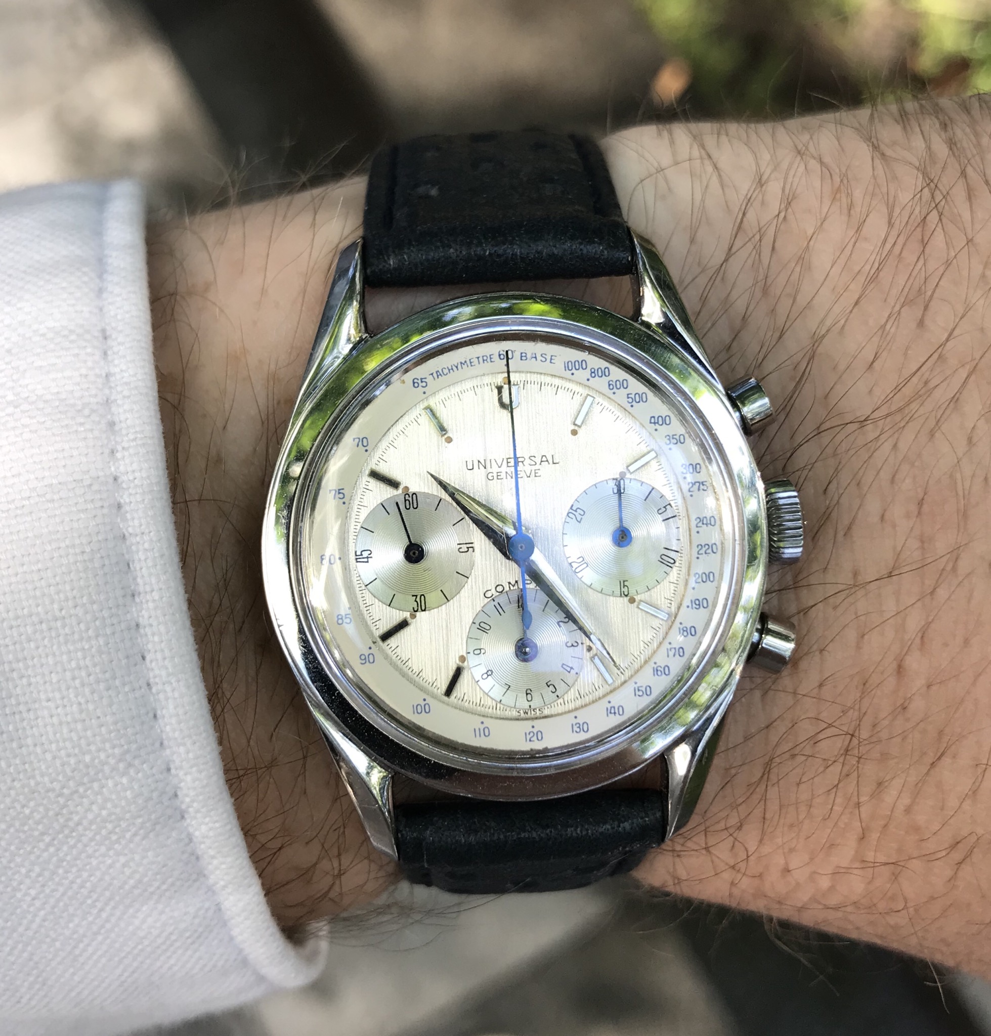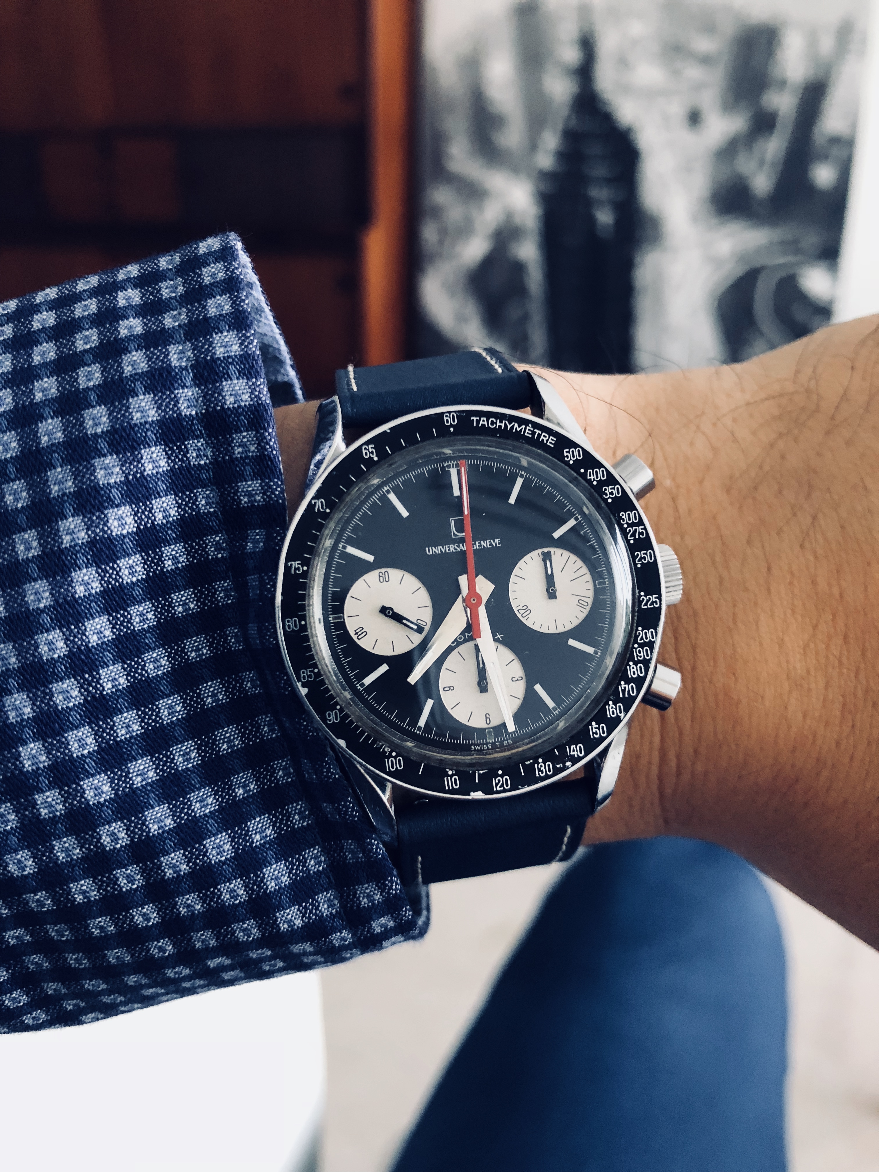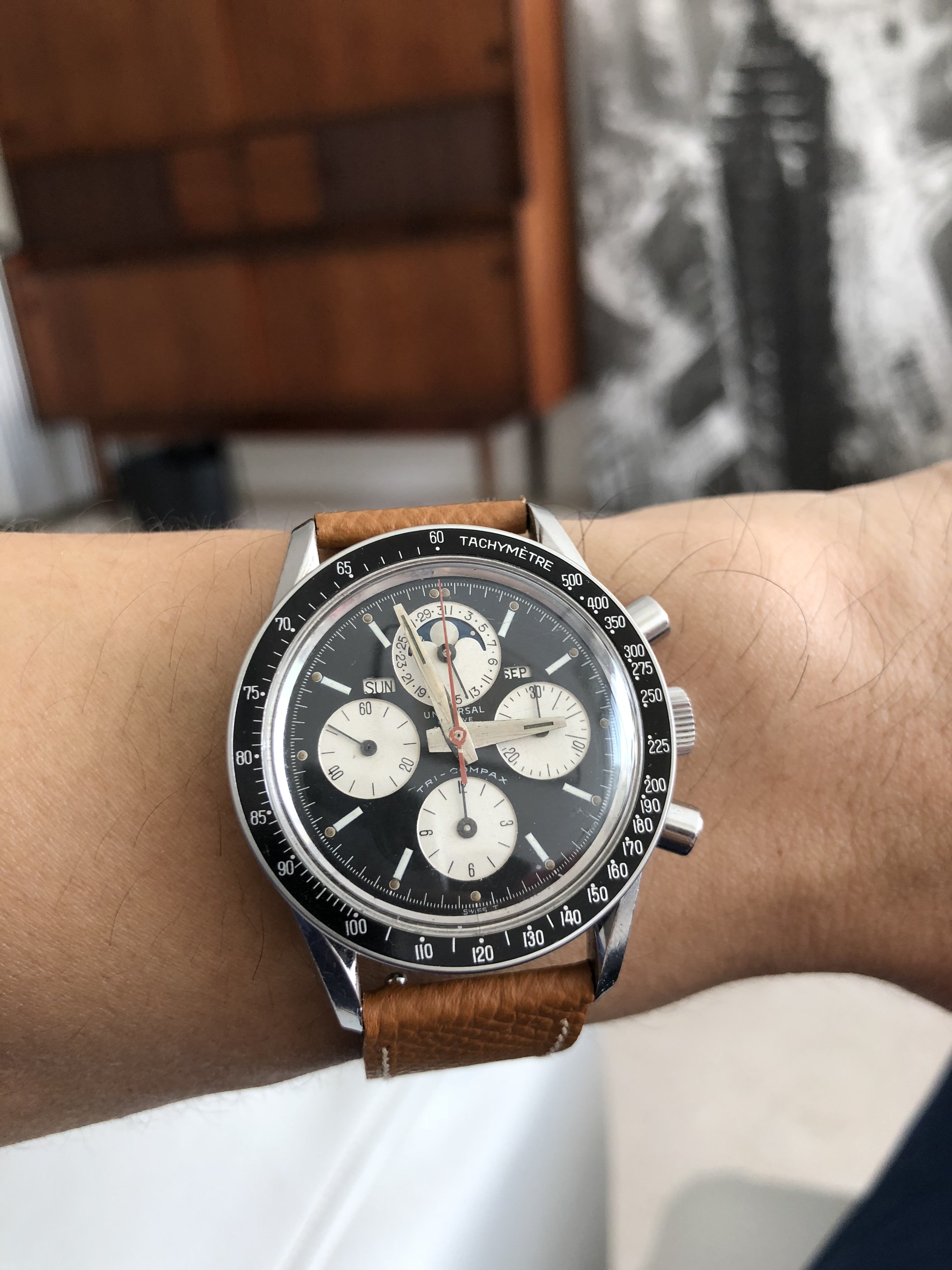 Posts 569 Likes 340 billving ·Sep 7, 2018 rosspo Tri compax with new strap for the train down to nyc. Love it. Dibs if you ever move this one!