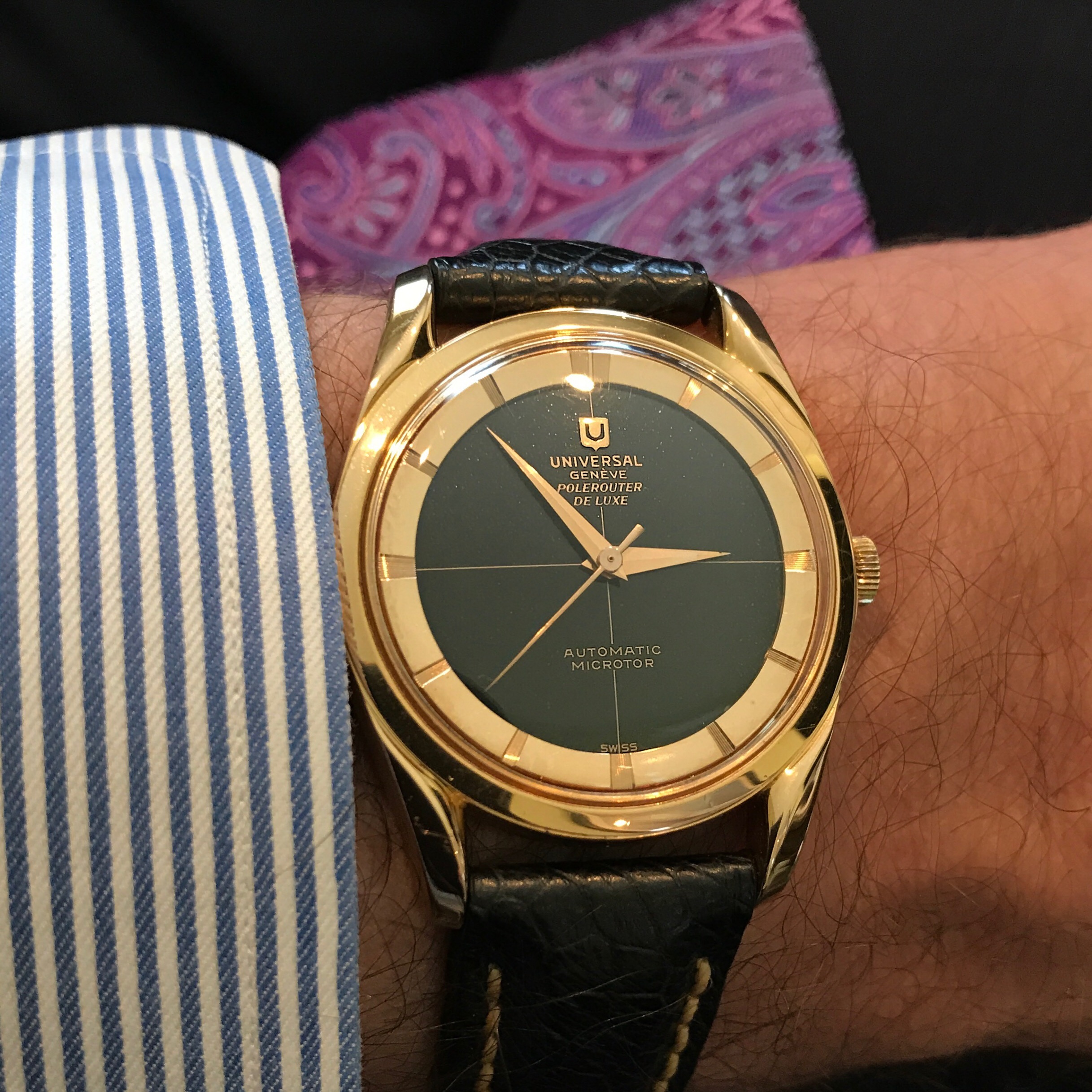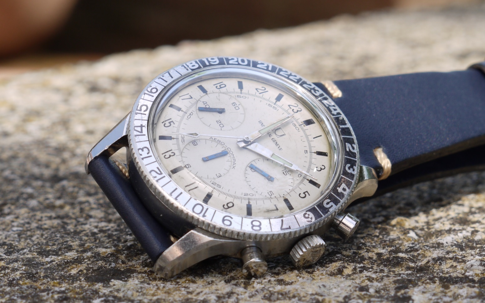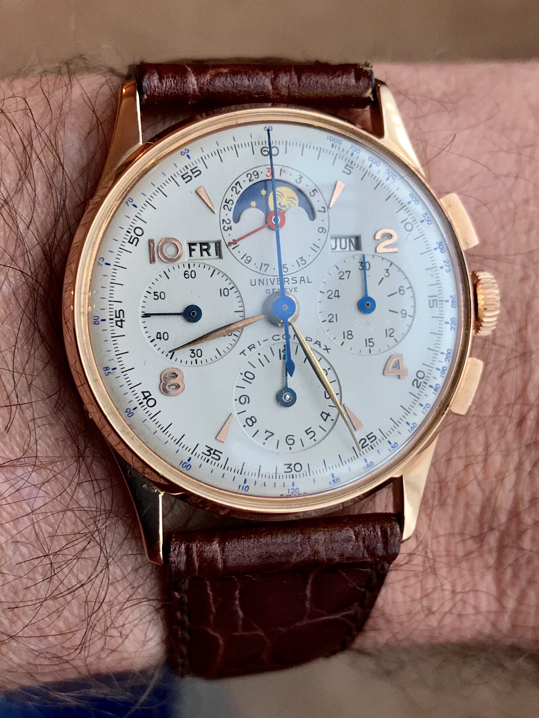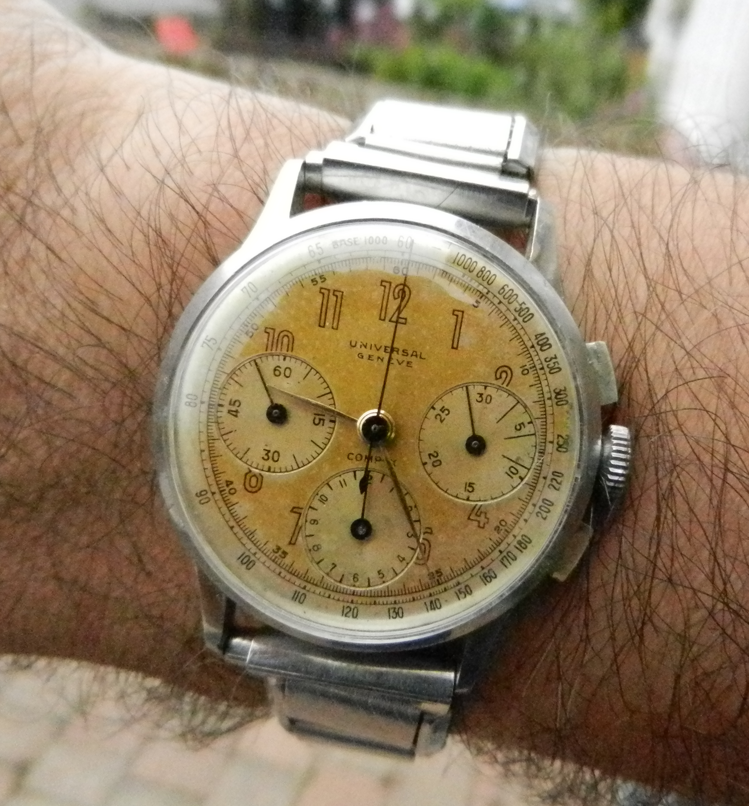 Keeping excellent time and chronograph works a treat. Bracelet is an old 40s steel favored by pilots. Although a modest 33 mm, it wear very well on my wrist !