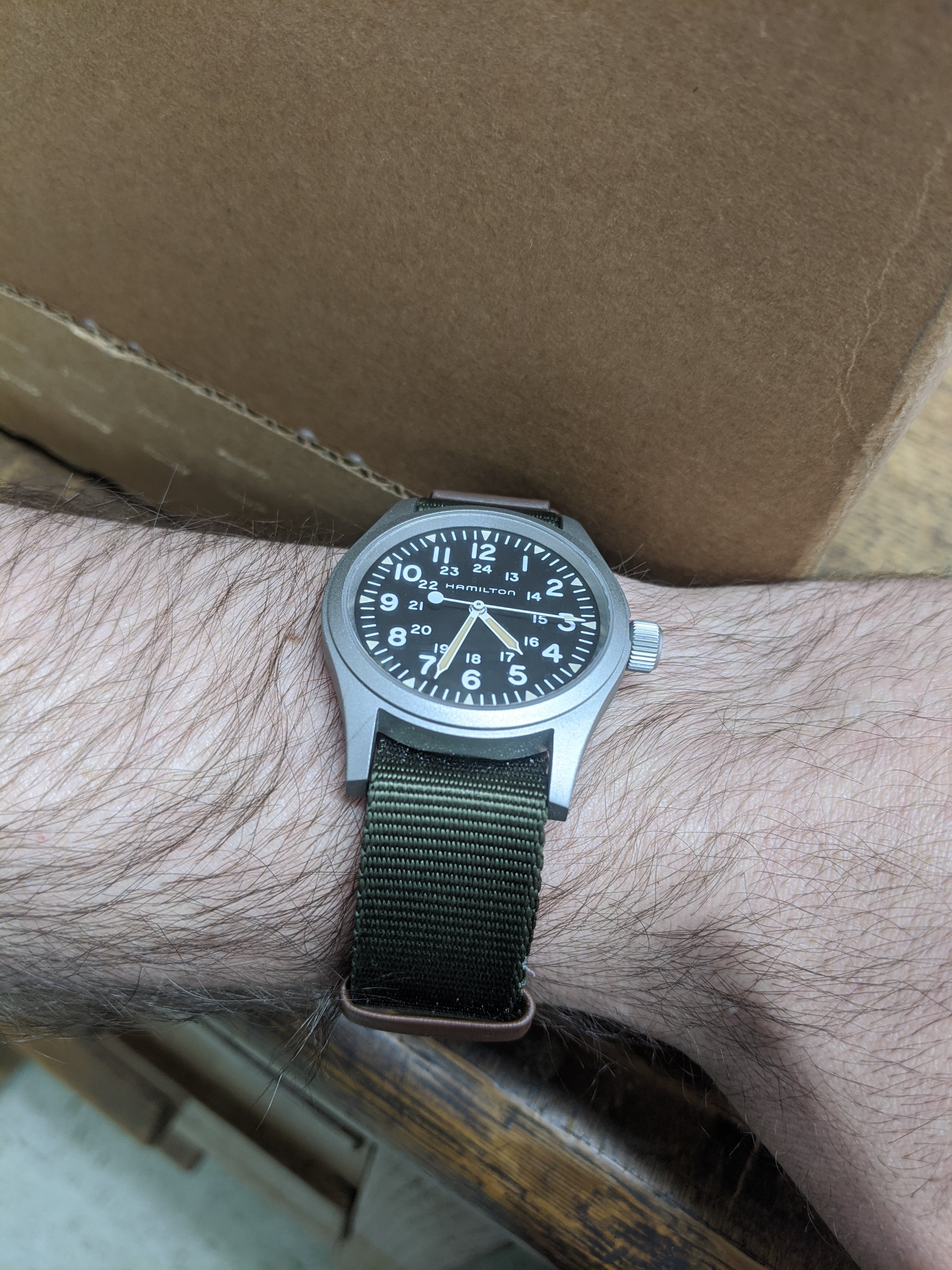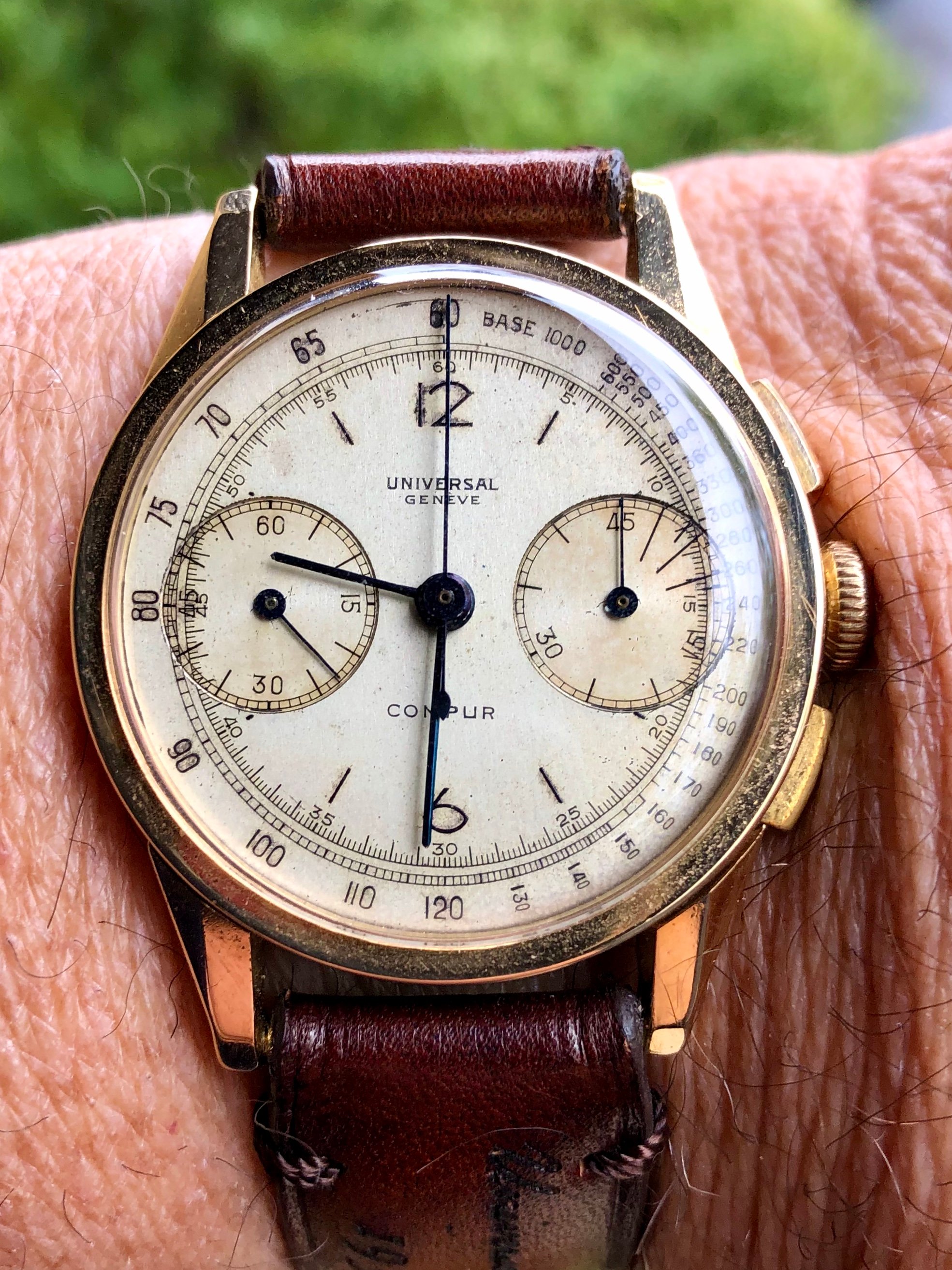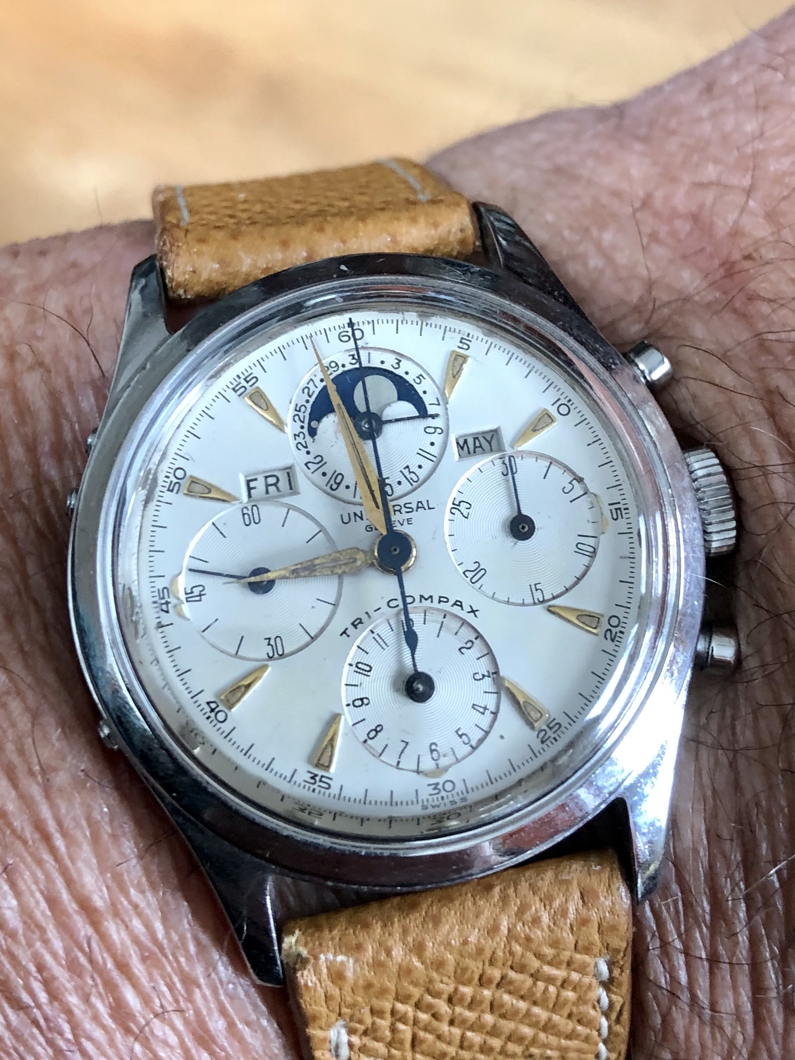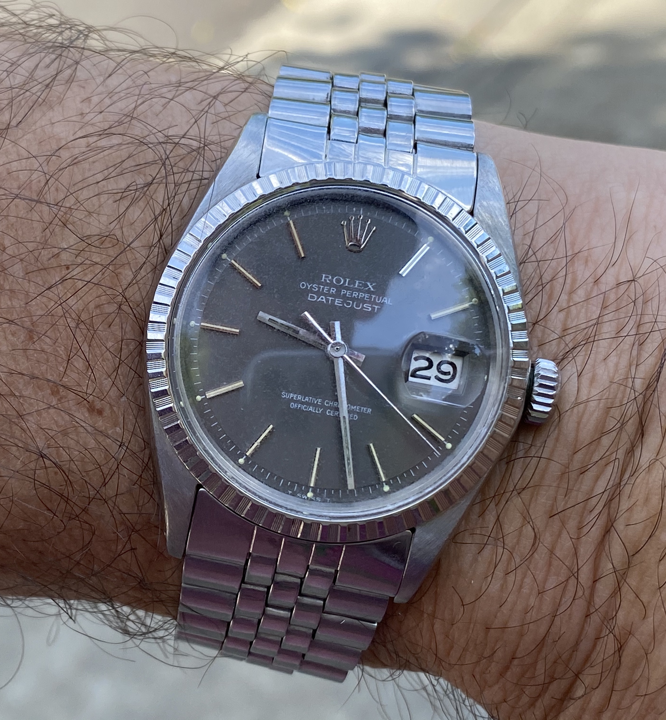 For kicks. An original 14-karat yellow gold Hamilton Ventura Electric. Recently had an enquiry from a guy who had bought one, but it wouldn’t run. He returned it. He saw mine and asked if I might sell it. I named my price. He then started to run it down, specifically pointing out that the dial isn’t perfect! Result? He still wants a Ventura, unless he has settled for a modern Swiss knock-off. Mine does run!