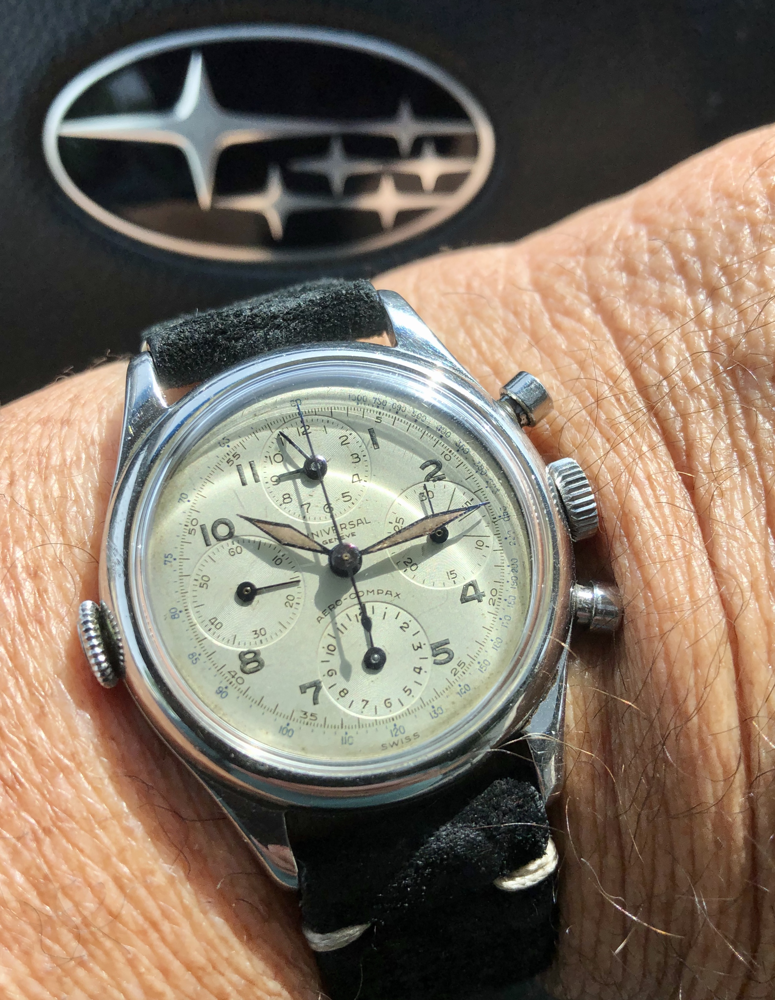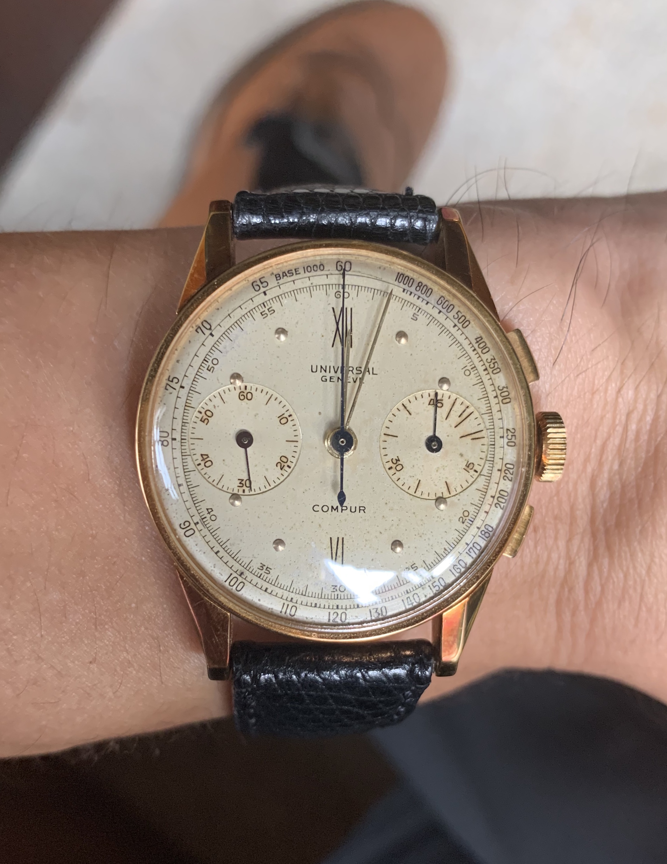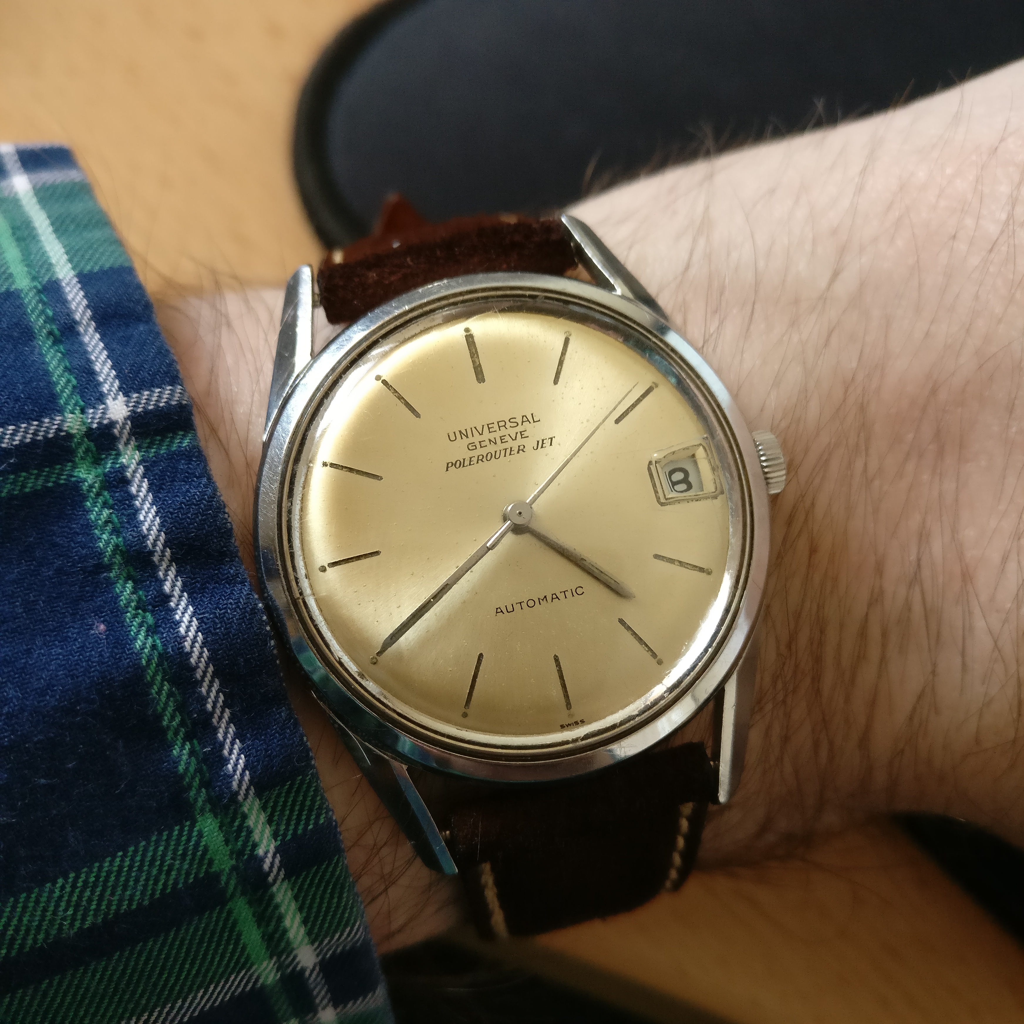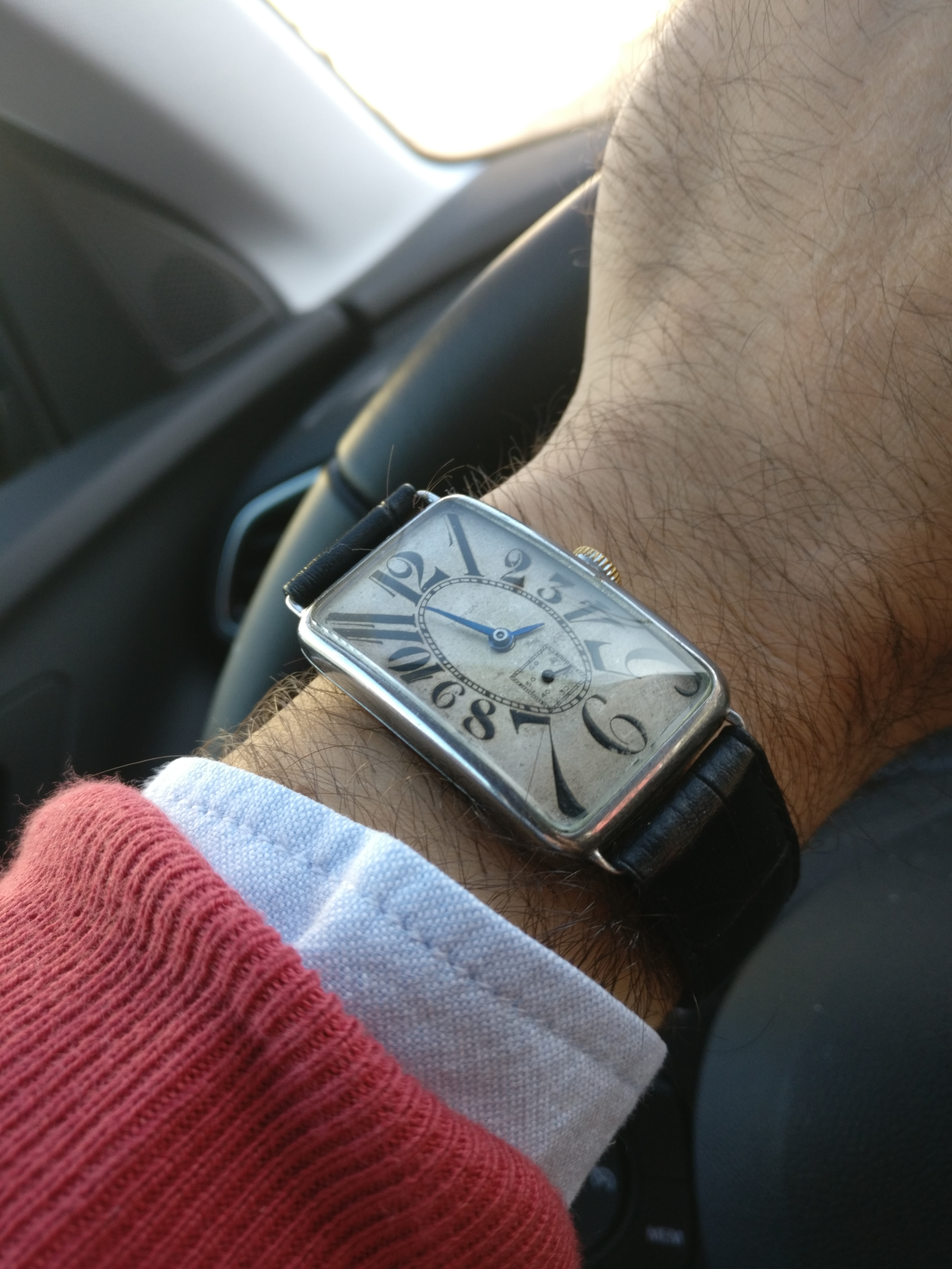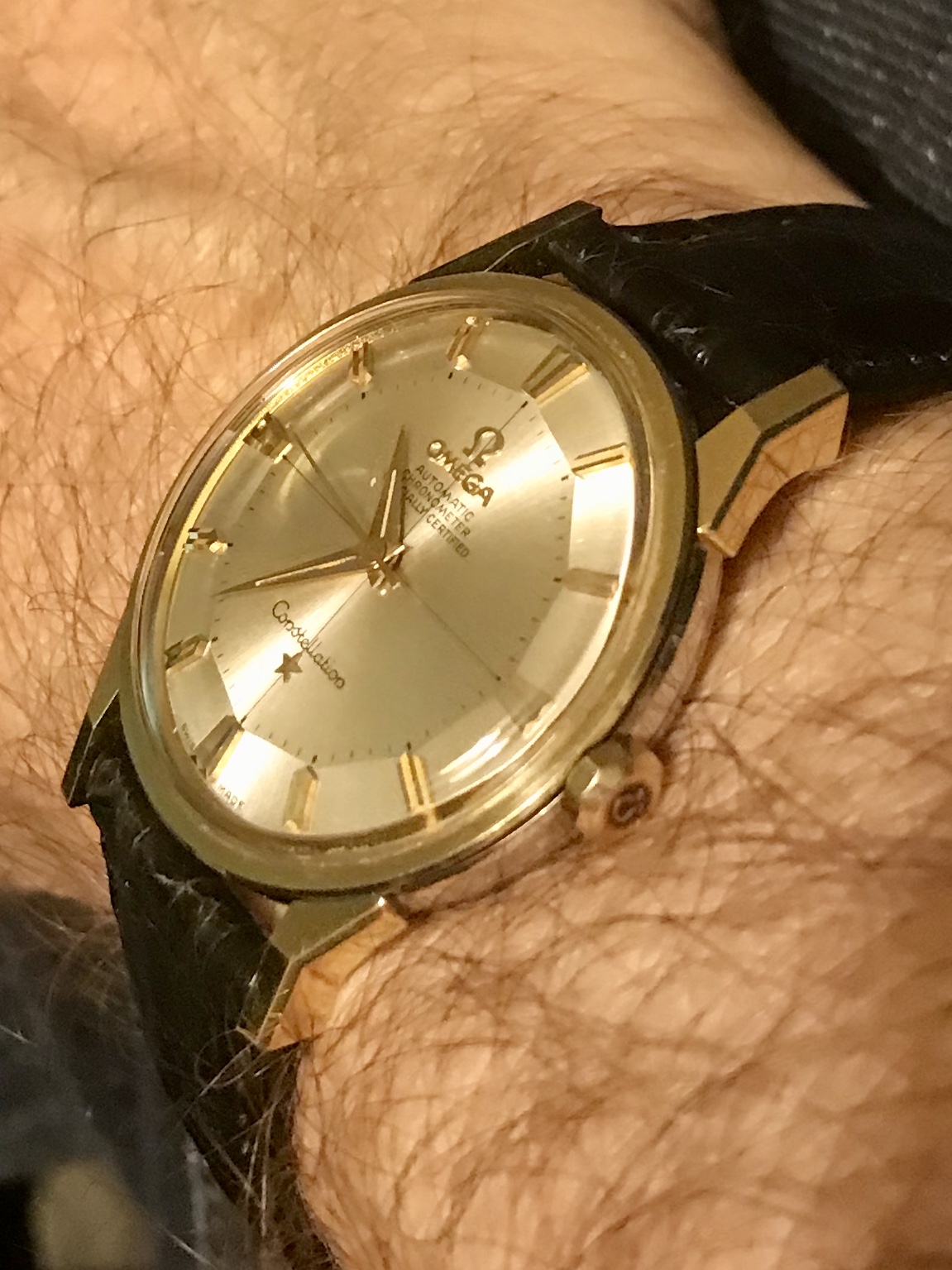 For kicks. An original 14-karat yellow gold Hamilton Ventura Electric. Recently had an enquiry from a guy who had bought one, but it wouldn’t run. He returned it. He saw mine and asked if I might sell it. I named my price. He then started to run it down, specifically pointing out that the dial isn’t perfect! Result? He still wants a Ventura, unless he has settled for a modern Swiss knock-off. Mine does run!