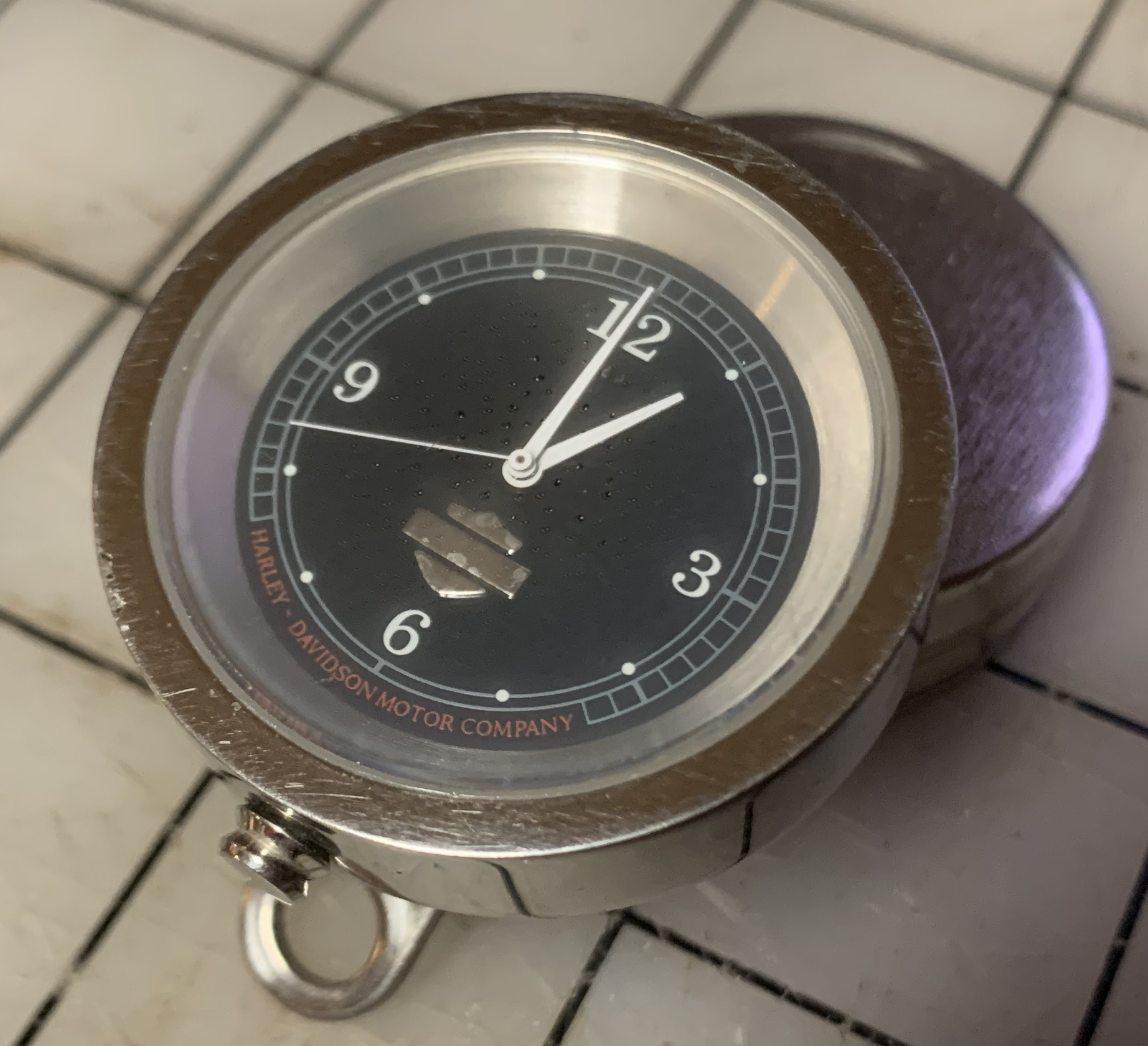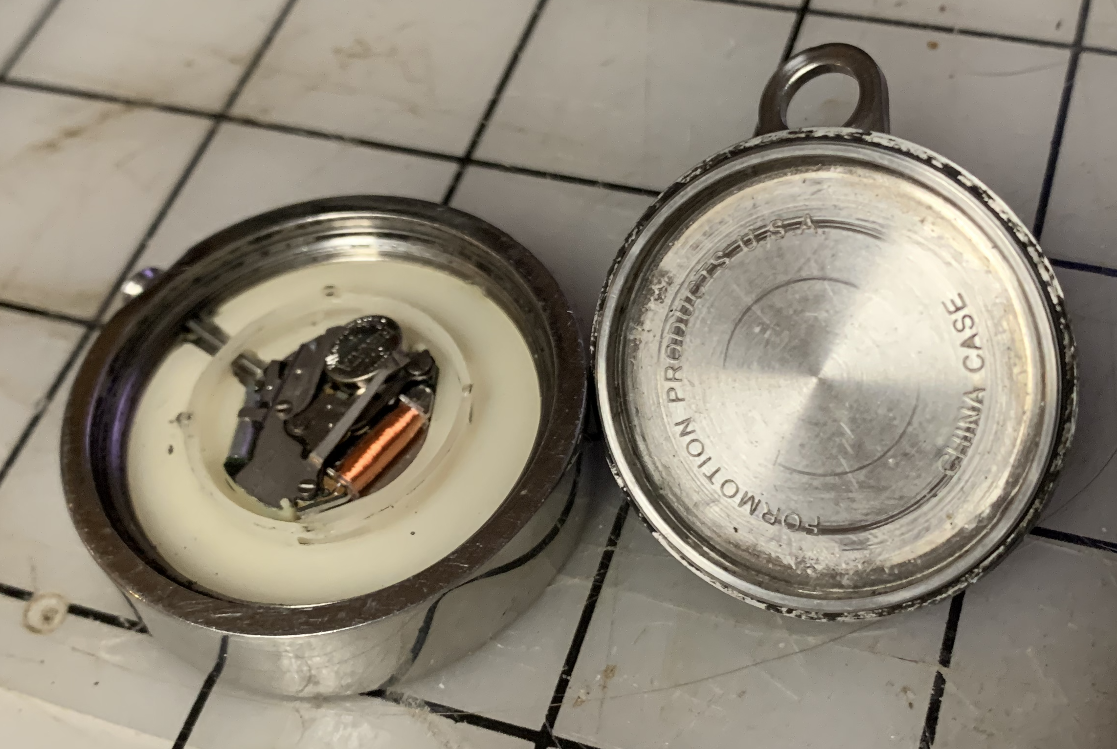 ·So this weird watch has been floating around in a box of pipe organ stuff. I thought it was a wind pressure gauge until I looked at it. Tried winding in and shaking it. No ticking. (note that the red on black writing is hard to read and not as clear in the photograph. I did not see that until later.)