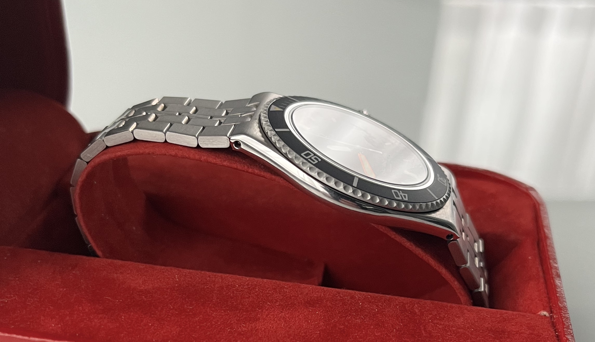 With a 36.2mm Case that's only 6mm thick, it must be one of the slimmest Diver's ever made. I suspect there's some Genta DNA in the design.
