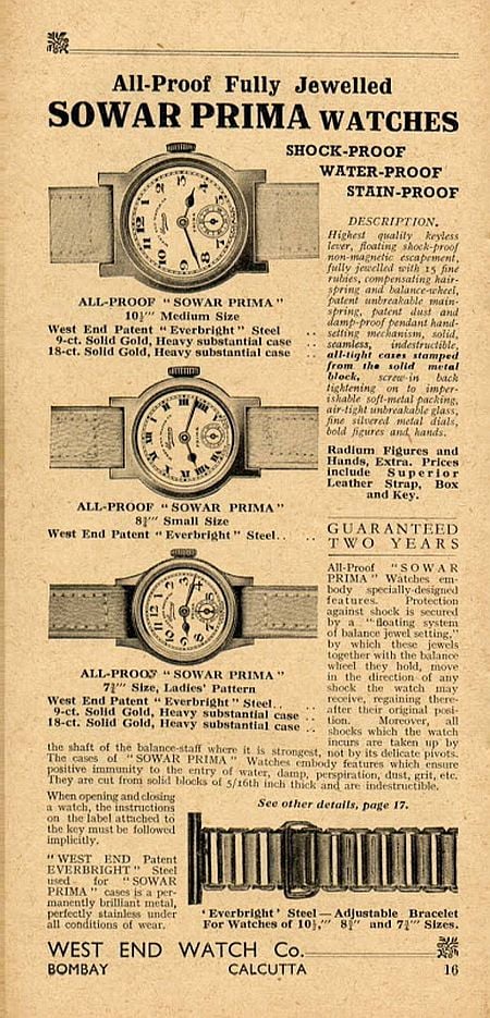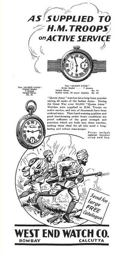 路The West End Watch Company was founded in India in the mid-1800s by a certain Mr. Charpie. The company, based in Bombay and Calcutta, imported Swiss-made "no name" watches and was an instant success. In 1886, the company was bought by Messrs. Droz and Amstutz who, in 1917, founded a new headquarters in Geneva. The firm was at the time the first distributor of Swiss watches to British troops in the Middle and Far East.