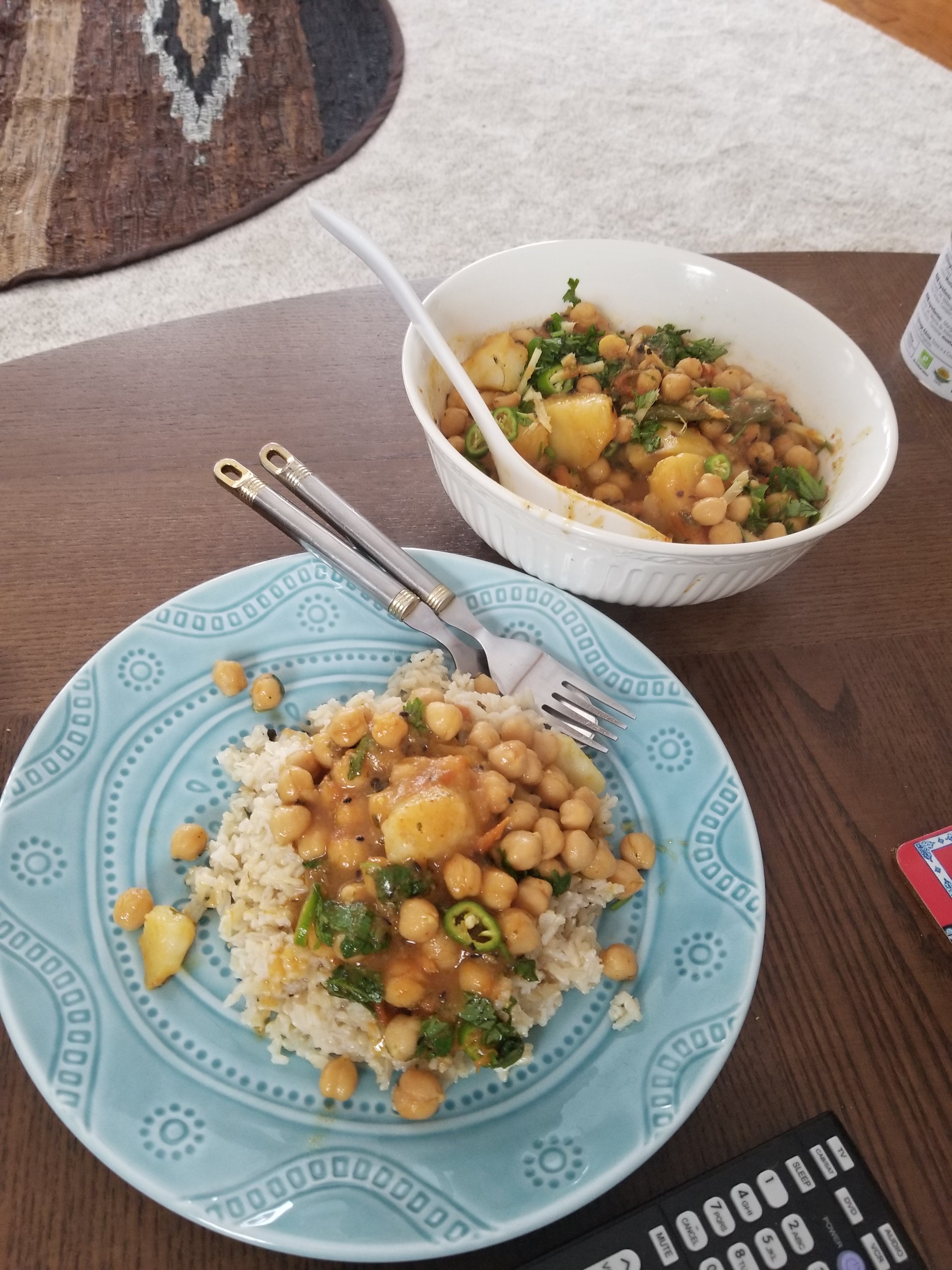 Some light vegetarian food (garbanzo peas, potatoes garnished with Serrano peppers and cilantro served with brown rice) this evening before the impending Thanksgiving food onslaught 😉