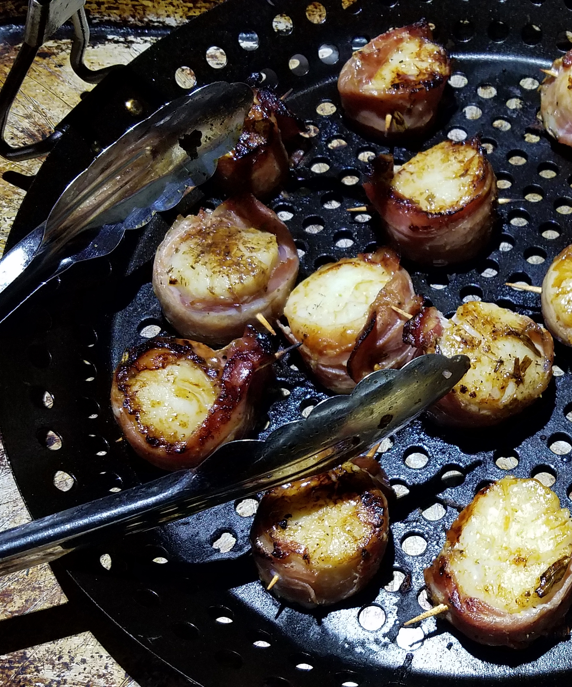 For now...Chesapeake Bay scallops wrapped in prosciutto with balsamic vinegar, olive oil, taragon and pepper. Later, after the show...something cheesy and greasy served with fries from Primanti Brothers washed down with something appropriate and plentiful. All the best. Happy New Year.