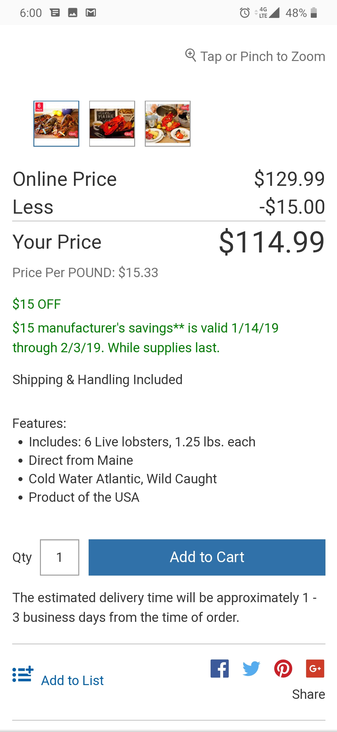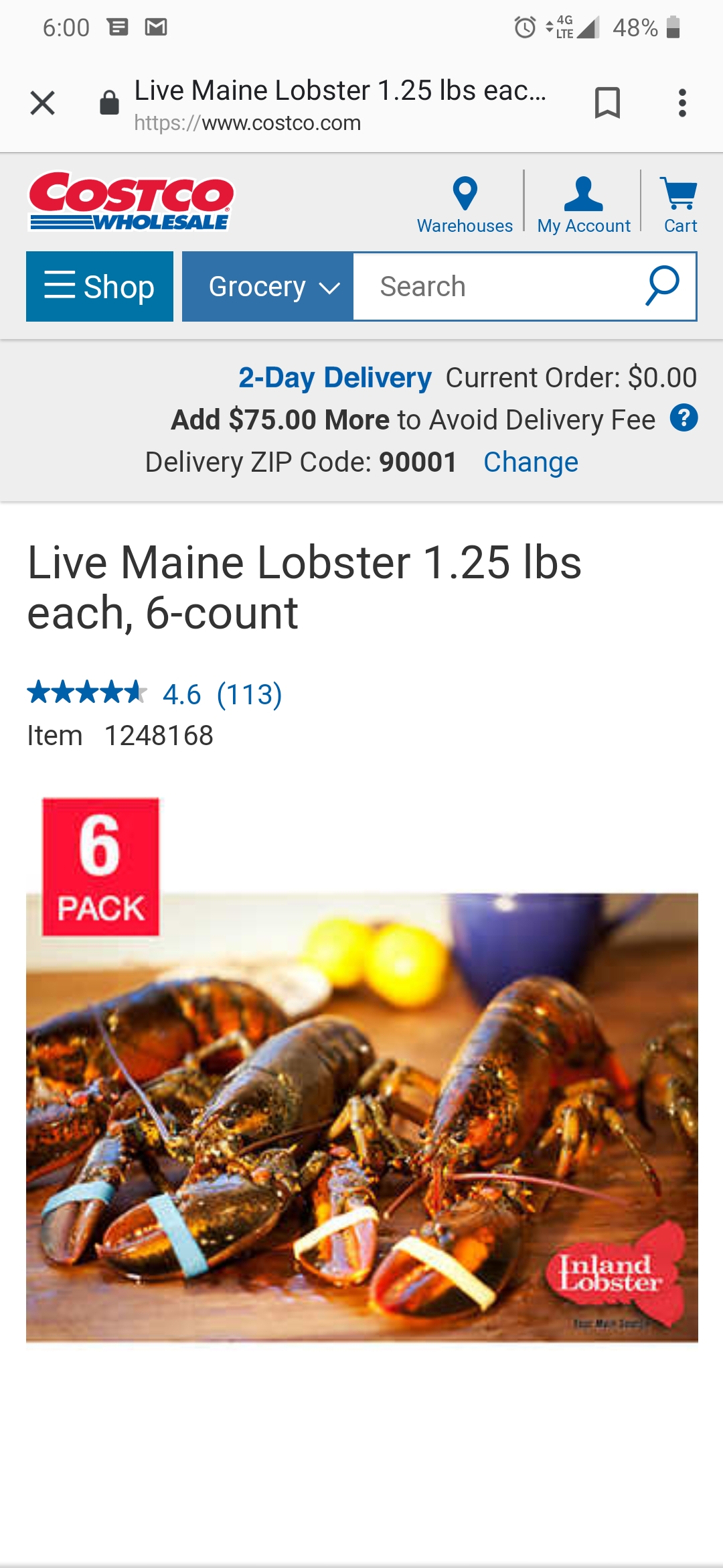 It depends. I live in southern California and lobster at Costco is very well priced, especially when they are having a sale. See photos. That's online special and sometimes, they will have exclusive store specials as well. In restaurants, I would say a main lobster dinner at a lower end restaurant will run little less than $40 and over $80 at some higher end restaurants. Then again, that's just what I've seen so I am sure some billionaire on this forum had a $1000 lobster dinner somewhere.