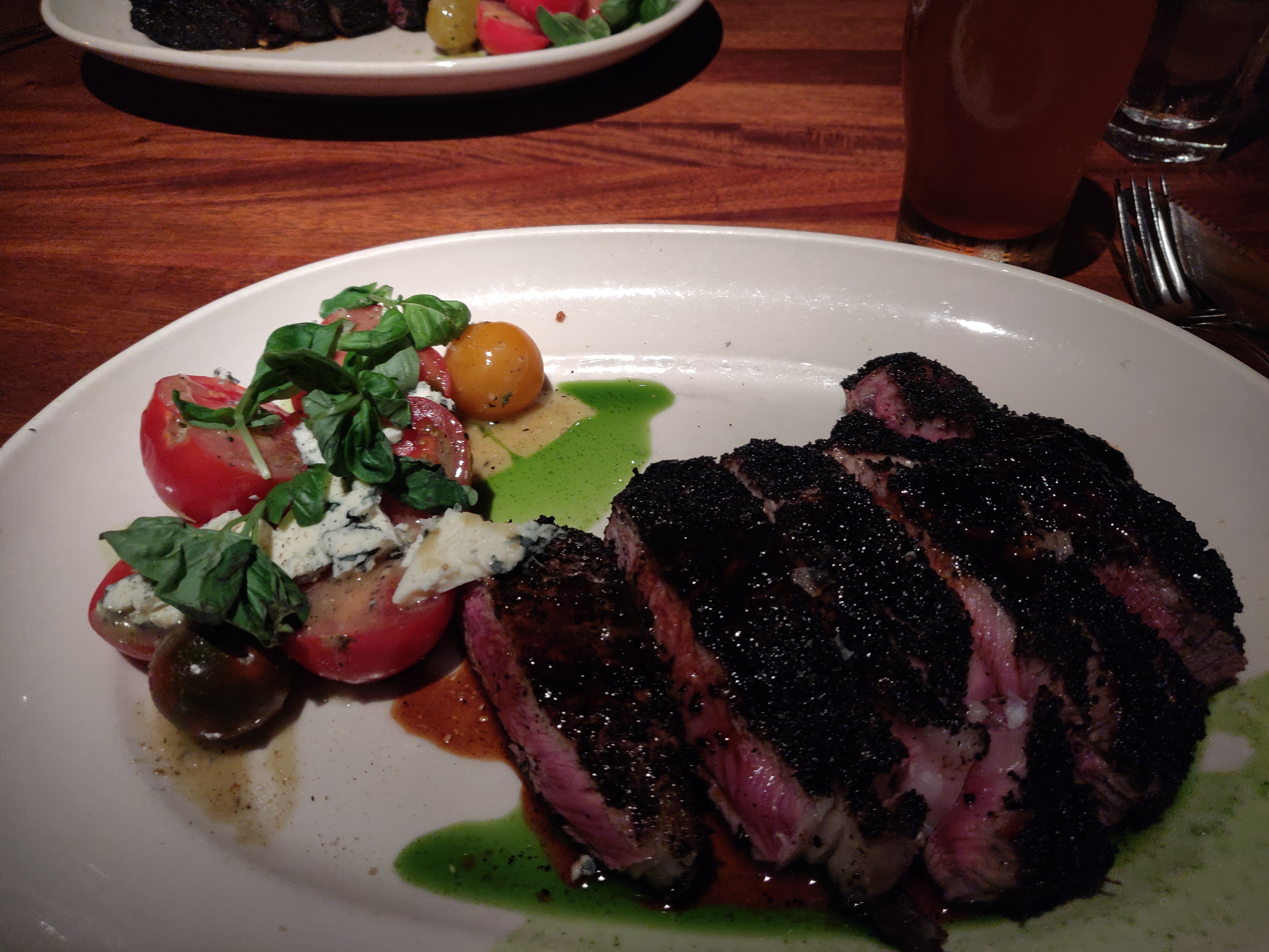 A friend took me out to Houston's Monday night. Had this Campfire Ribeye. Blackened with some sort of lightly sweetened coffee rub. Pretty tasty for a mid tier chain restaurant steak.