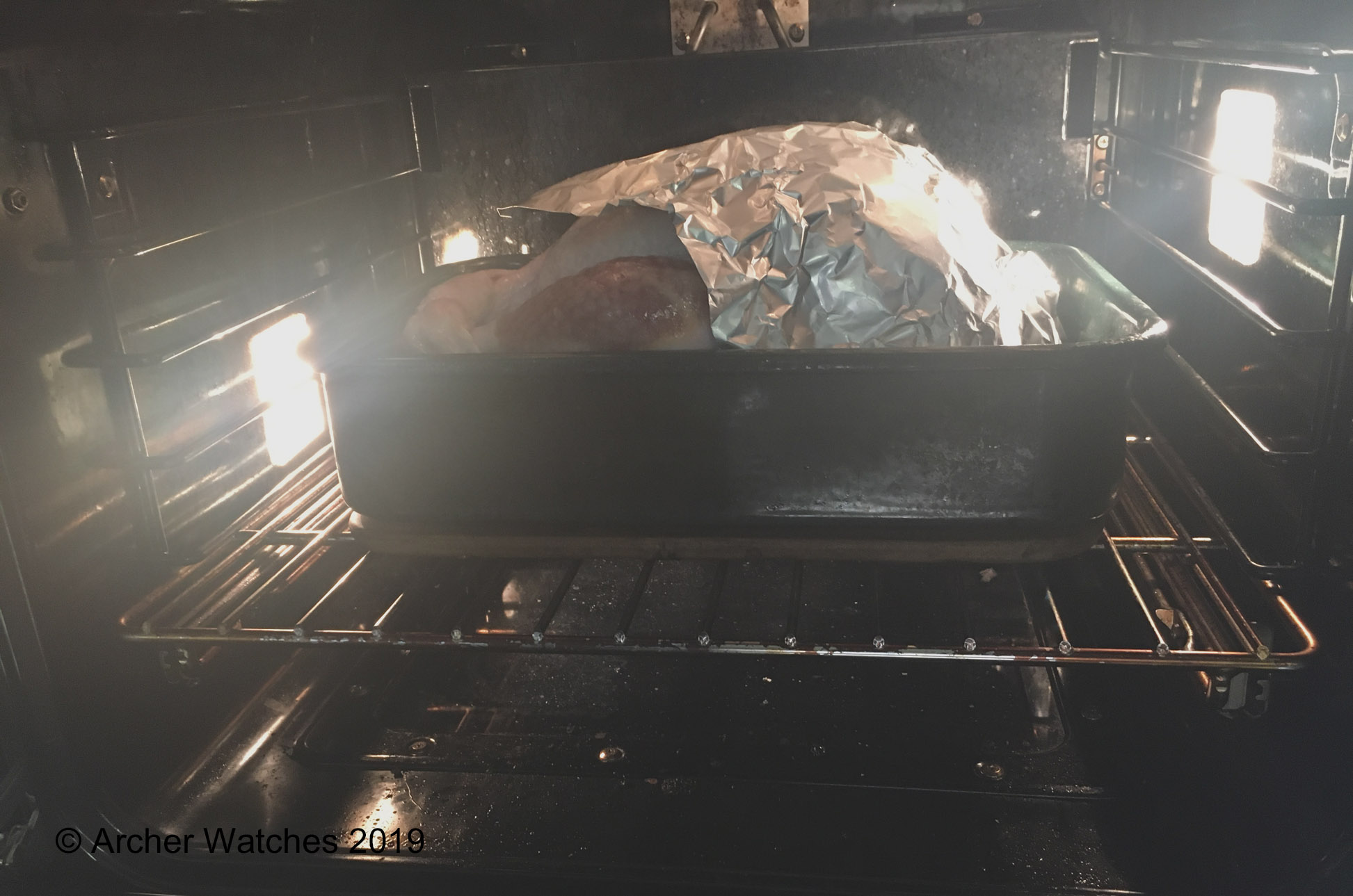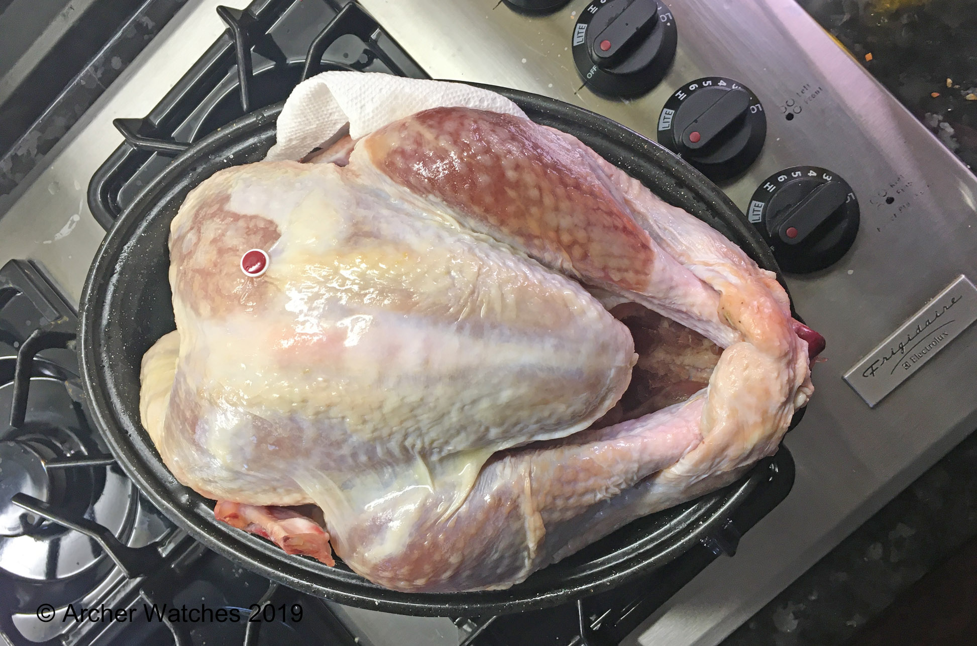Oven was pre-heated with a pizza stone under the roasting pan - this is done to help cook the dark meat a little quicker, so the whole bird is done at the same time...