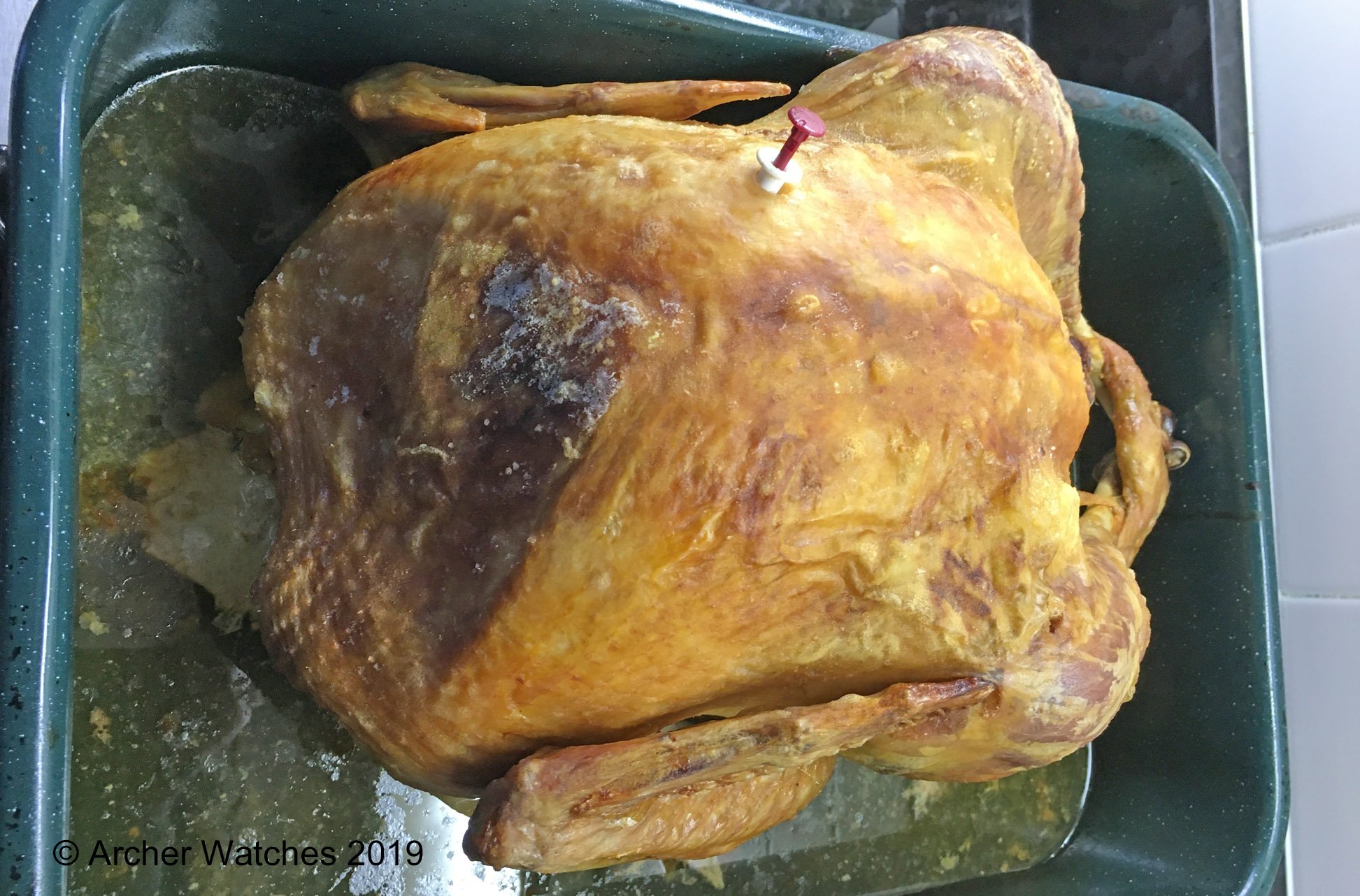 Now done - skin is crispy, and despite the outer appearance the bird is still very juicy, and all of it cooked at the same time...