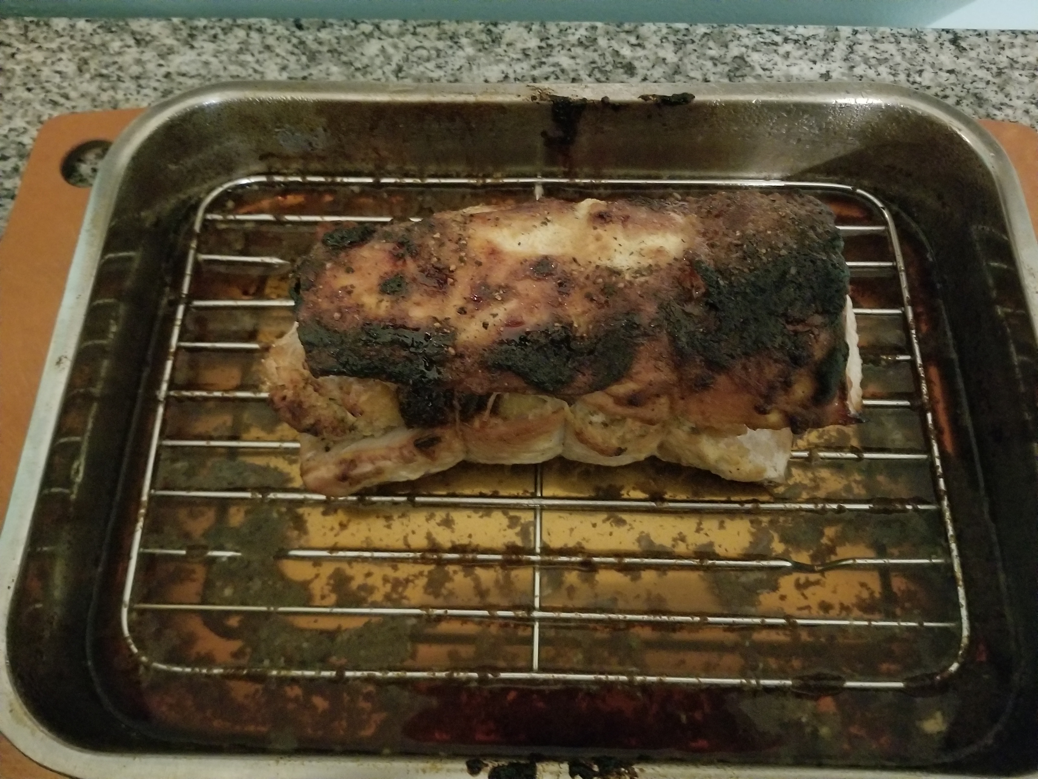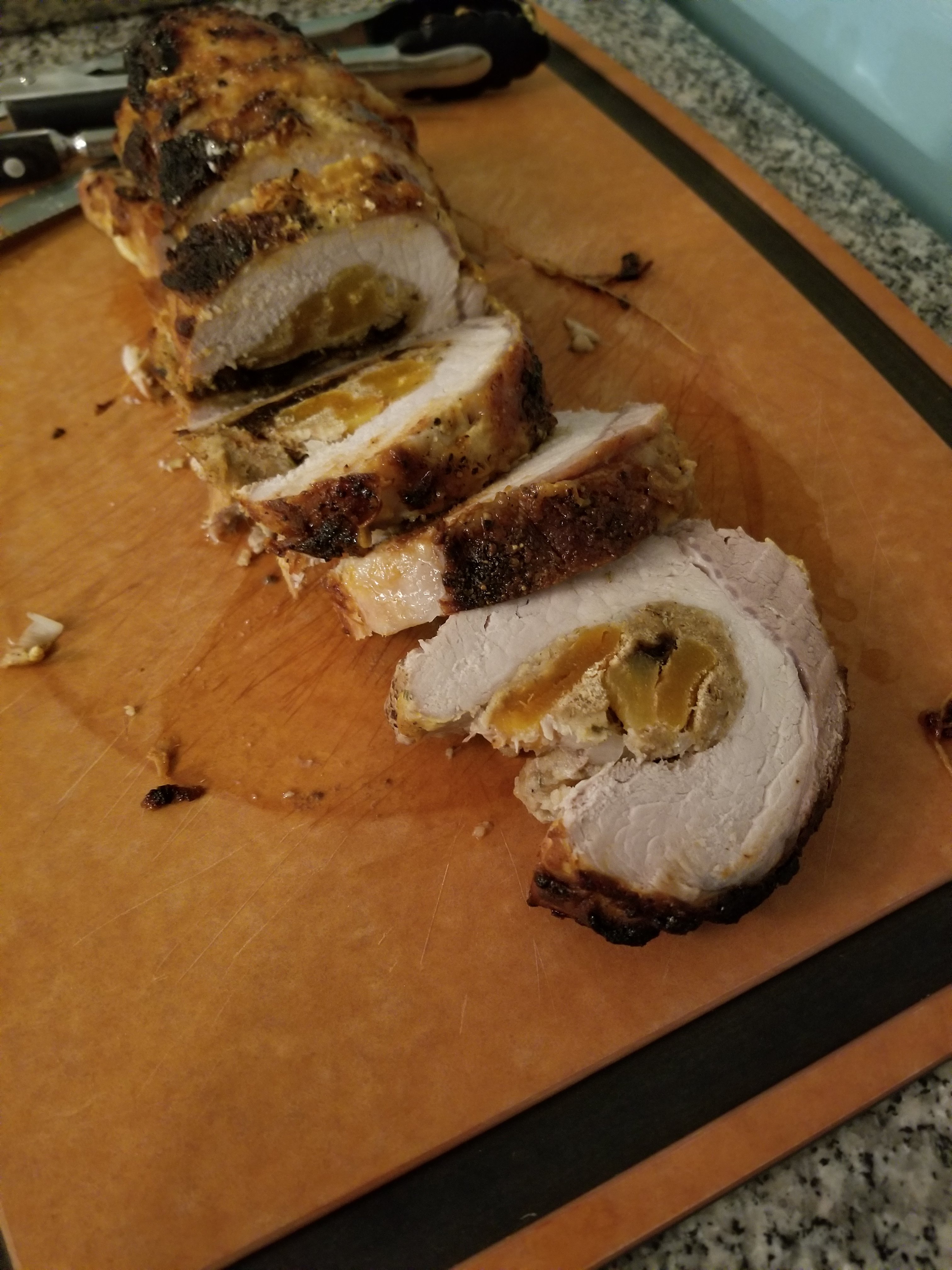The other night I tried a new (to me) recipe for a rolled pork roast with a fruit stuffing. I simmered dried apricots and prunes in bourbon, and mixed them with some bread crumbs, a beaten egg, and some herbs. I rolled the roast around the stuffing, tied it, and coated it with Dijon mustard and brown sugar. Into the roasting pan with a sauce of white wine, beef stock, and more bourbon.