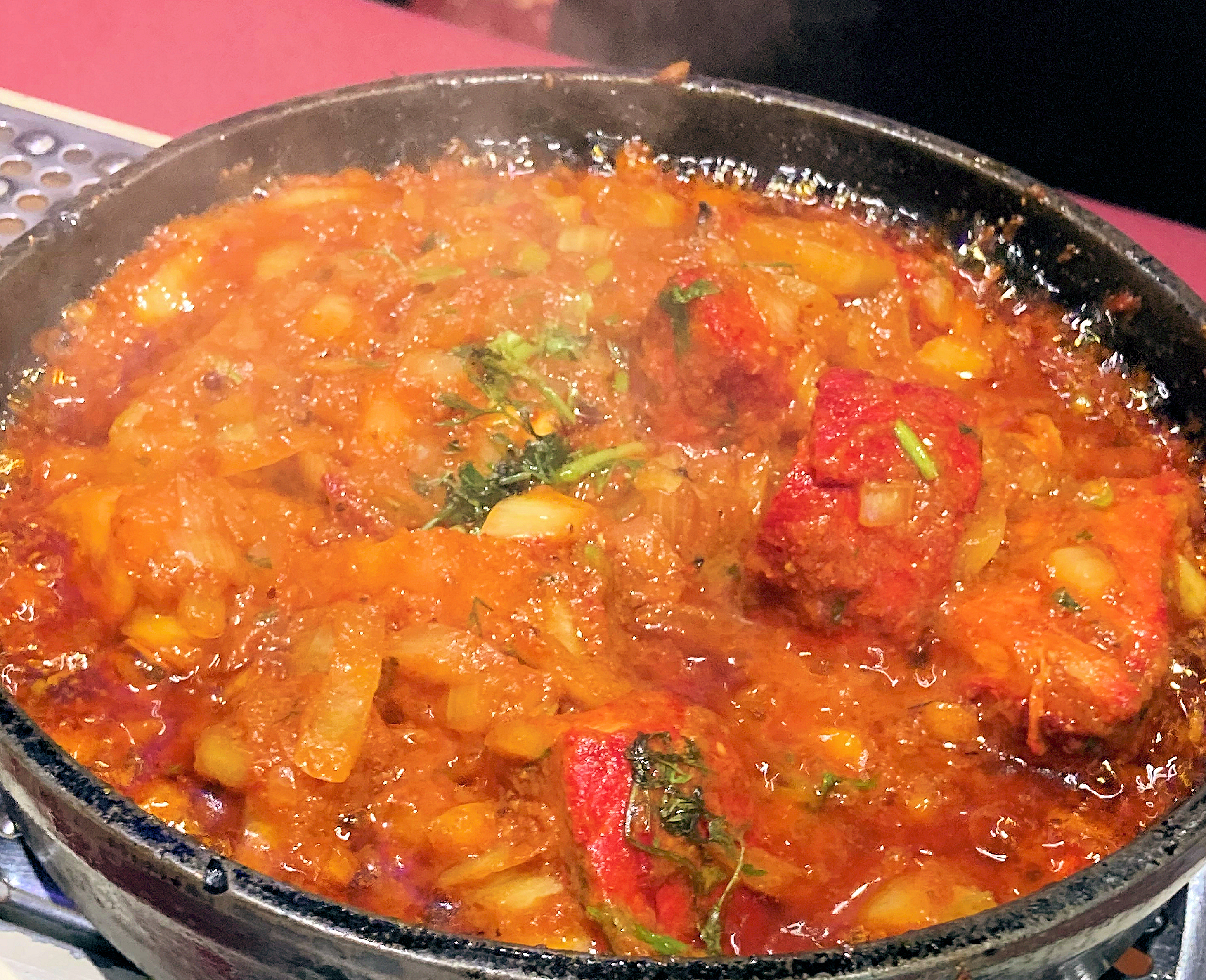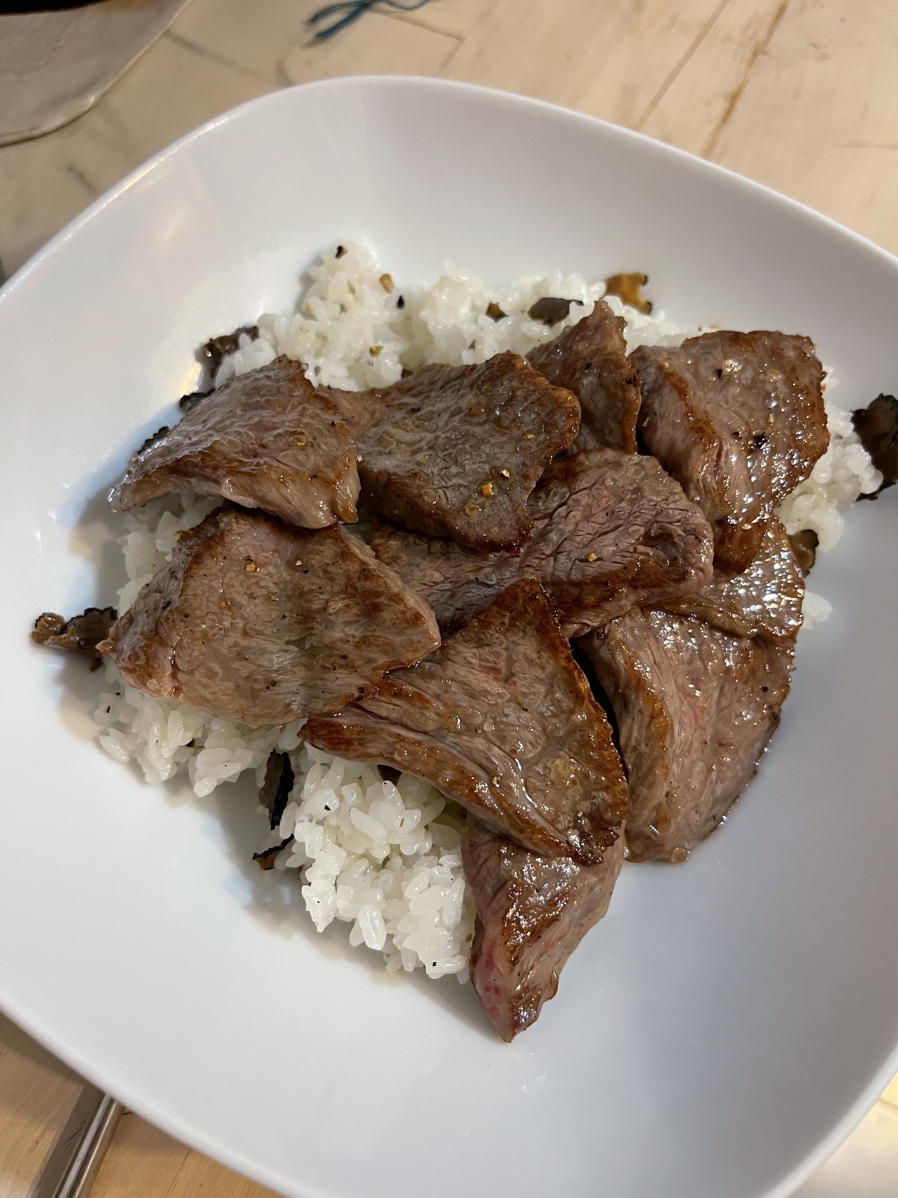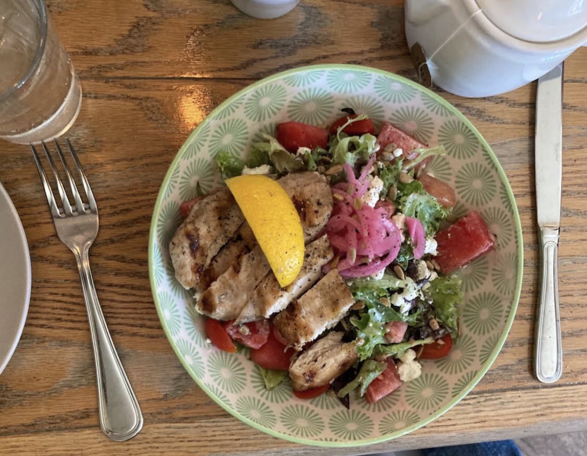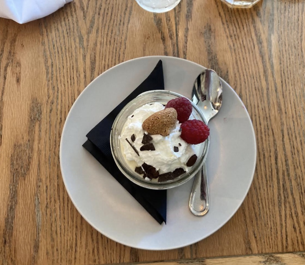 In order, watermelon salad, seafood fettuccini alfredo, carbonara with boar bacon, pancetta, Alfredo sauce, and tiramisu.